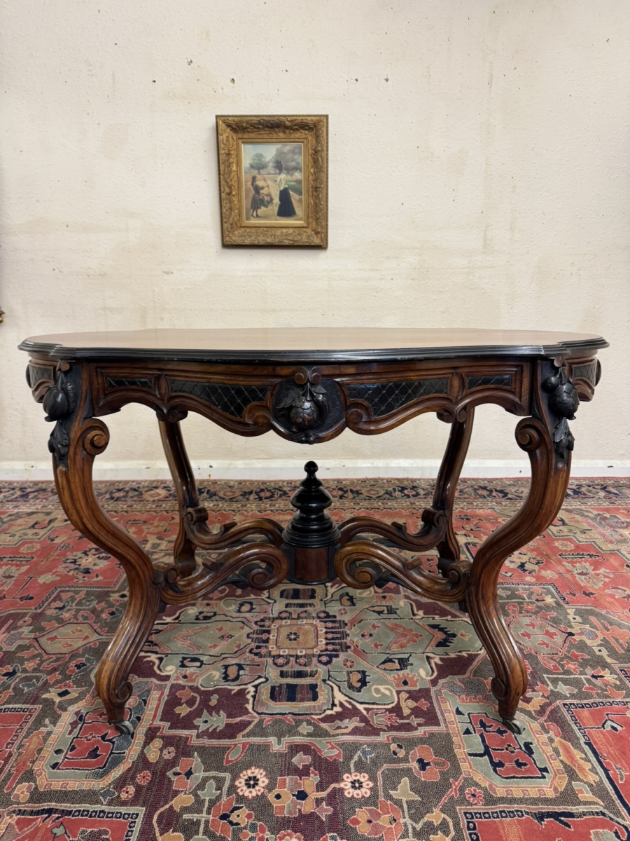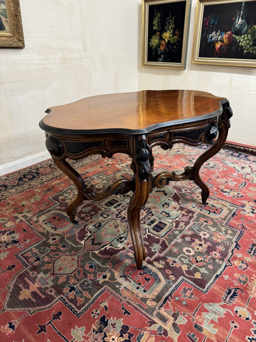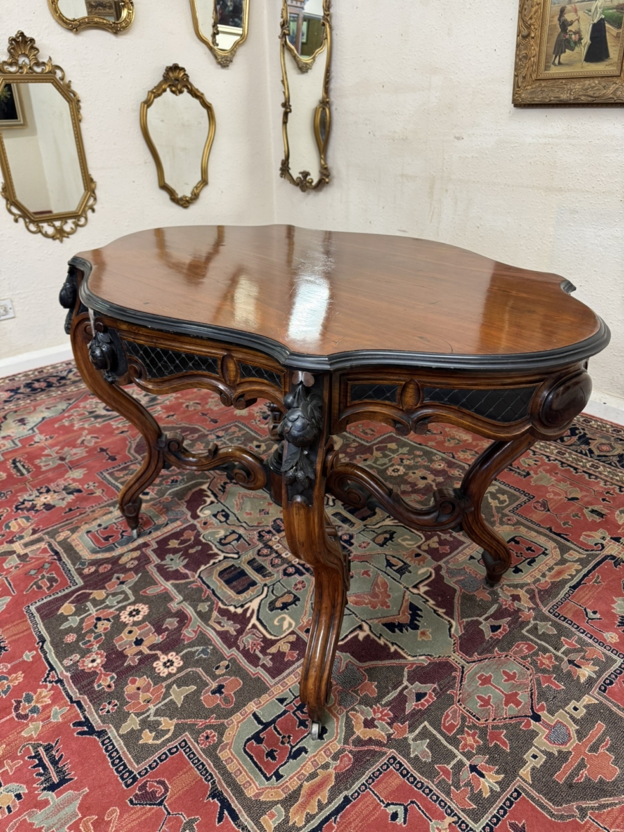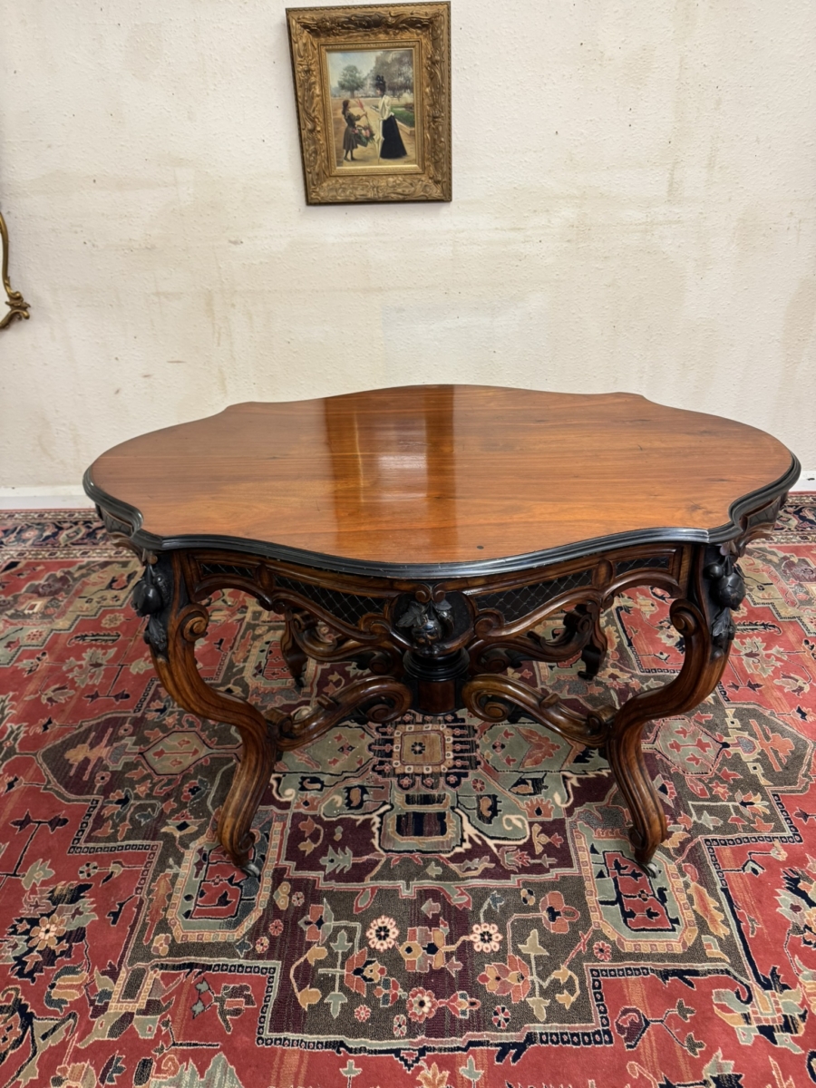 This fine French centre table dates circa 1870. The shaped walnut top has ebony edging. The apron and curved legs showcase elaborate scrollwork and floral motifs. Curved stretchered supports with central ebony finial. The table stands on original brass casters.