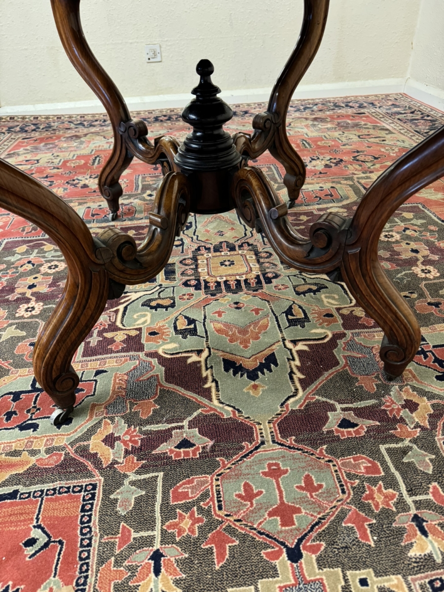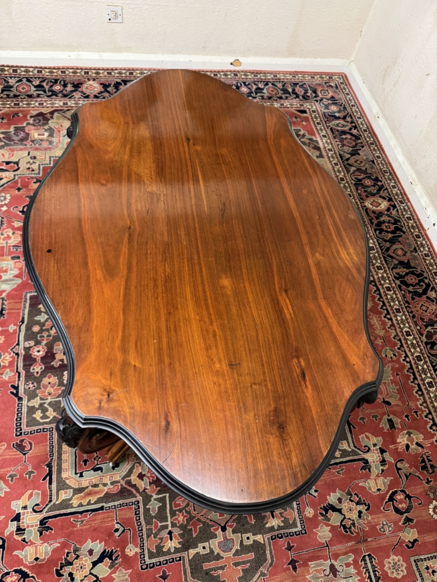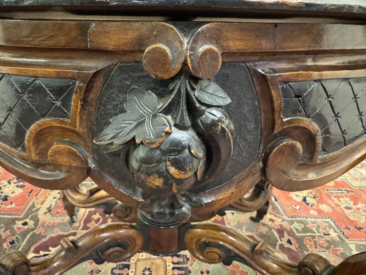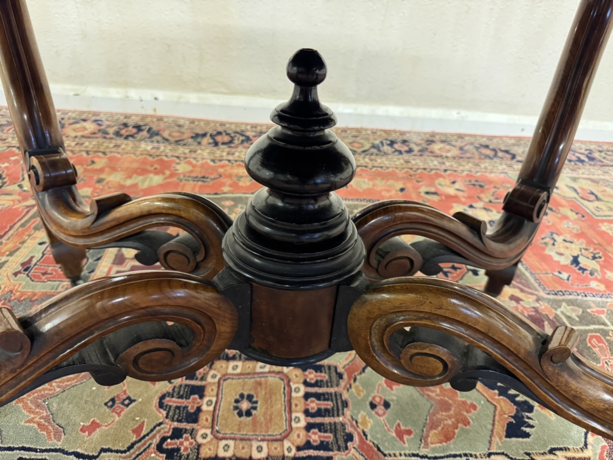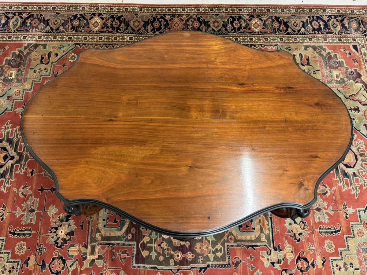 This fine French centre table dates circa 1870. The shaped walnut top has ebony edging. The apron and curved legs showcase elaborate scrollwork and floral motifs. Curved stretchered supports with central ebony finial. The table stands on original brass casters.