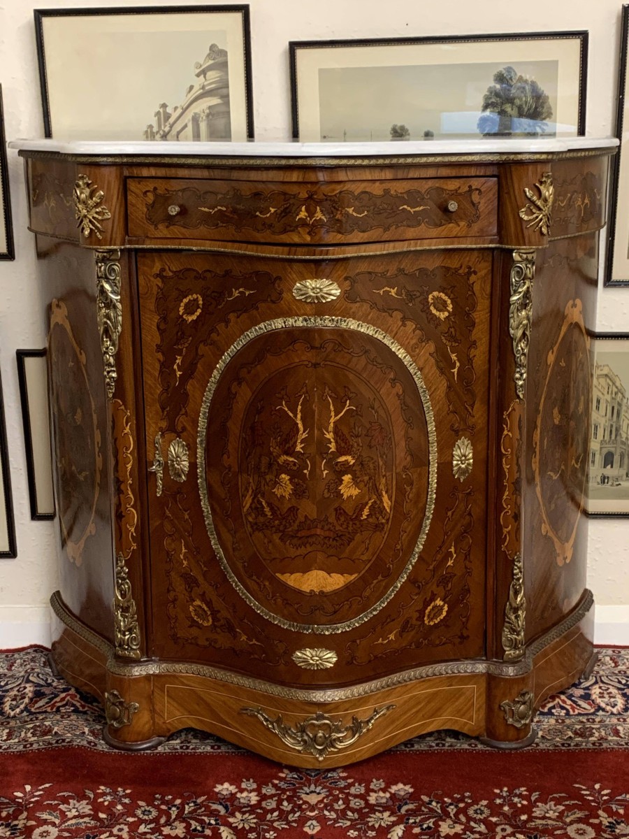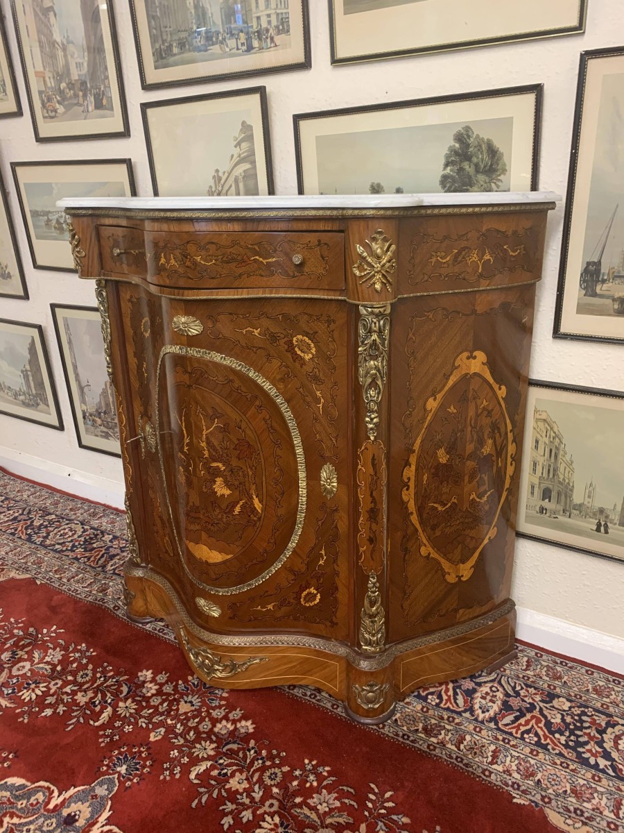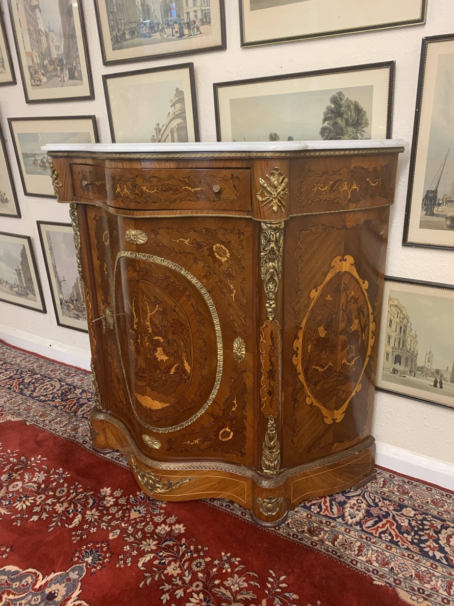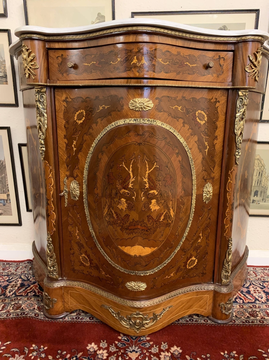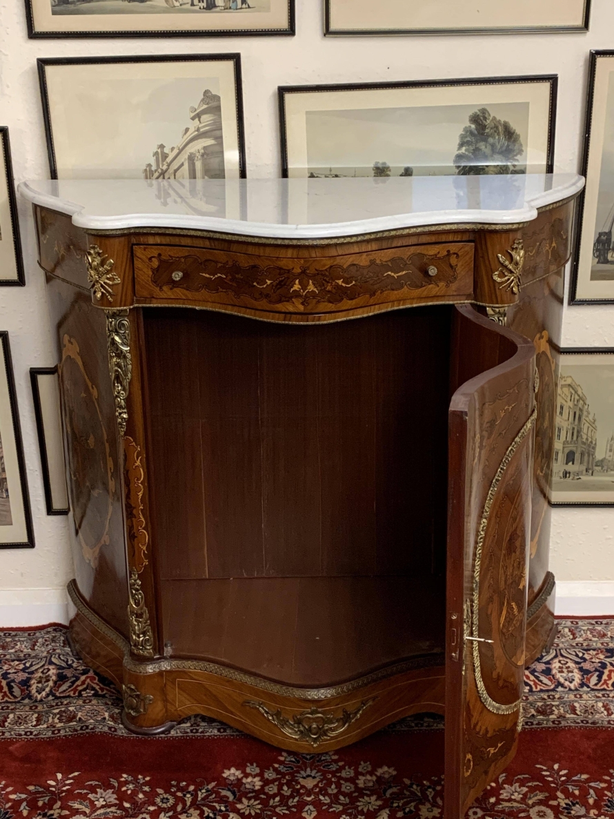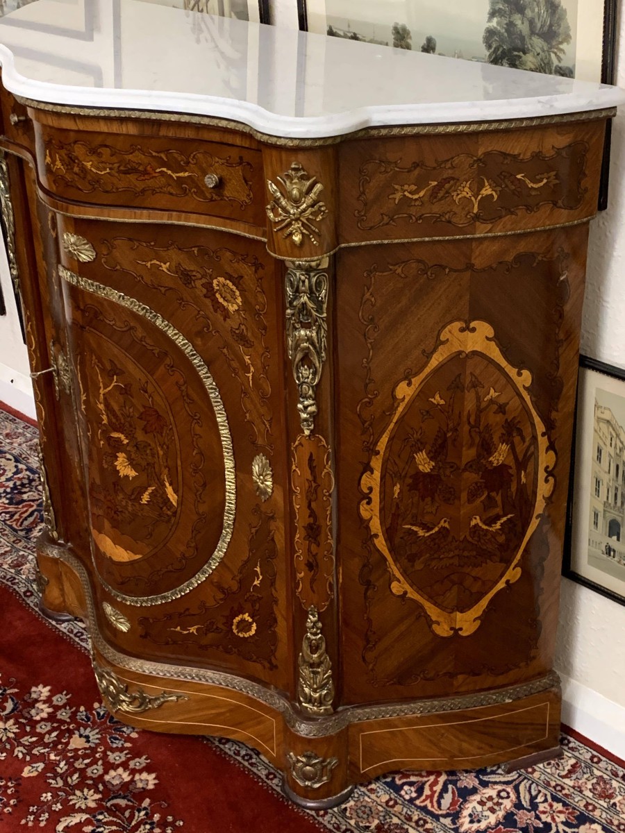 This is a highly attractive item of quality furniture which would grace any home. The shaped marble top sits on a serpentine shaped base. The base has a shaped drawer, lockable central door and shaped sides. The base is decorated with beautiful marquetry inlay of birds and floral decoration. The cabinet is adourned with dectorative brass mounts and ornate brass trim. A stylish item of furniture.