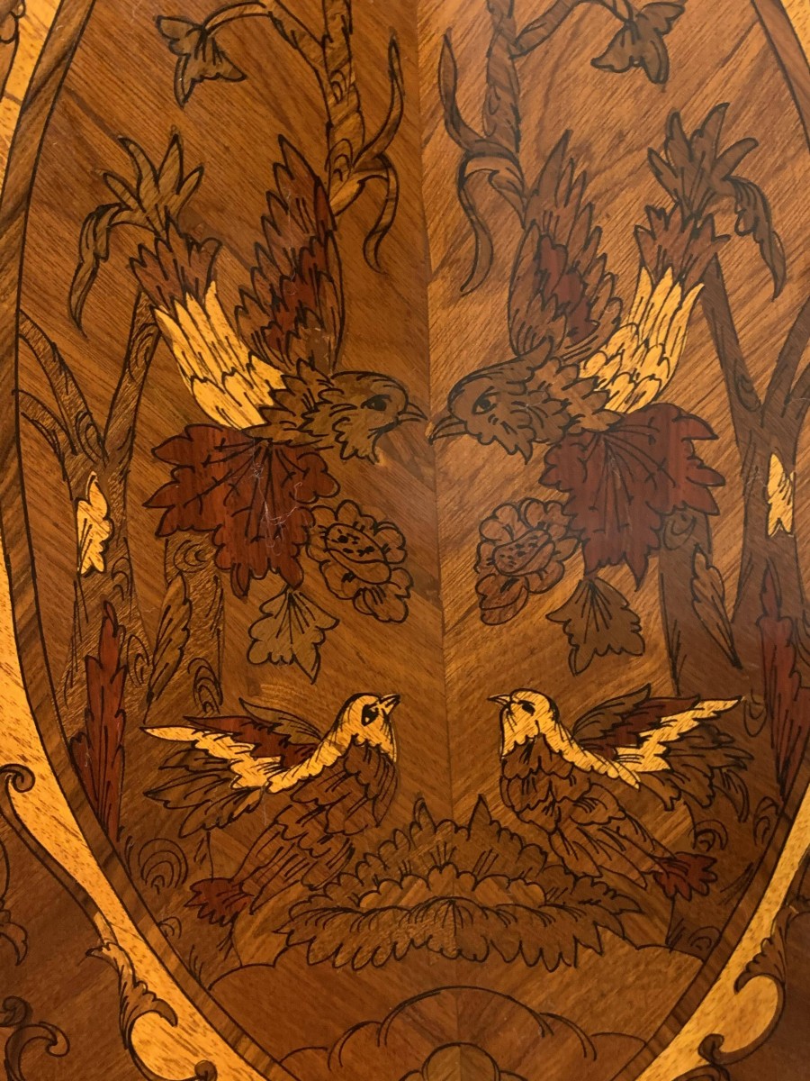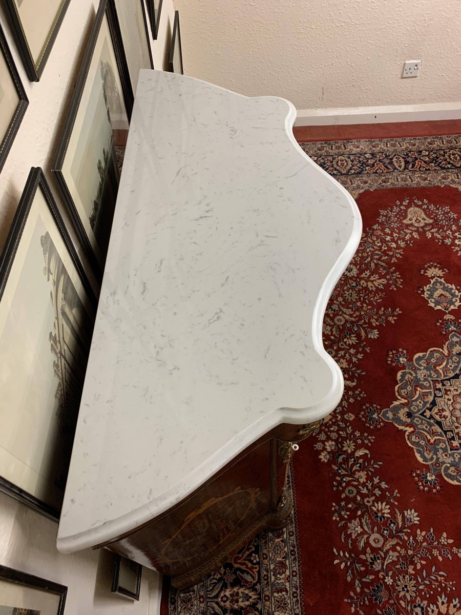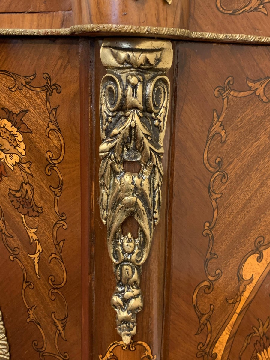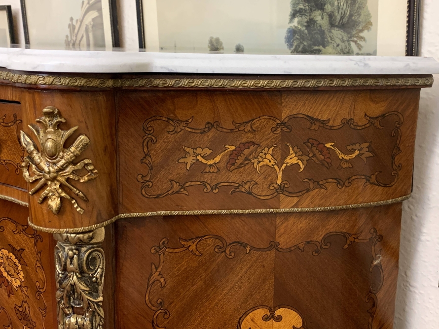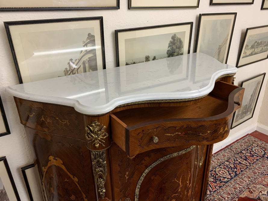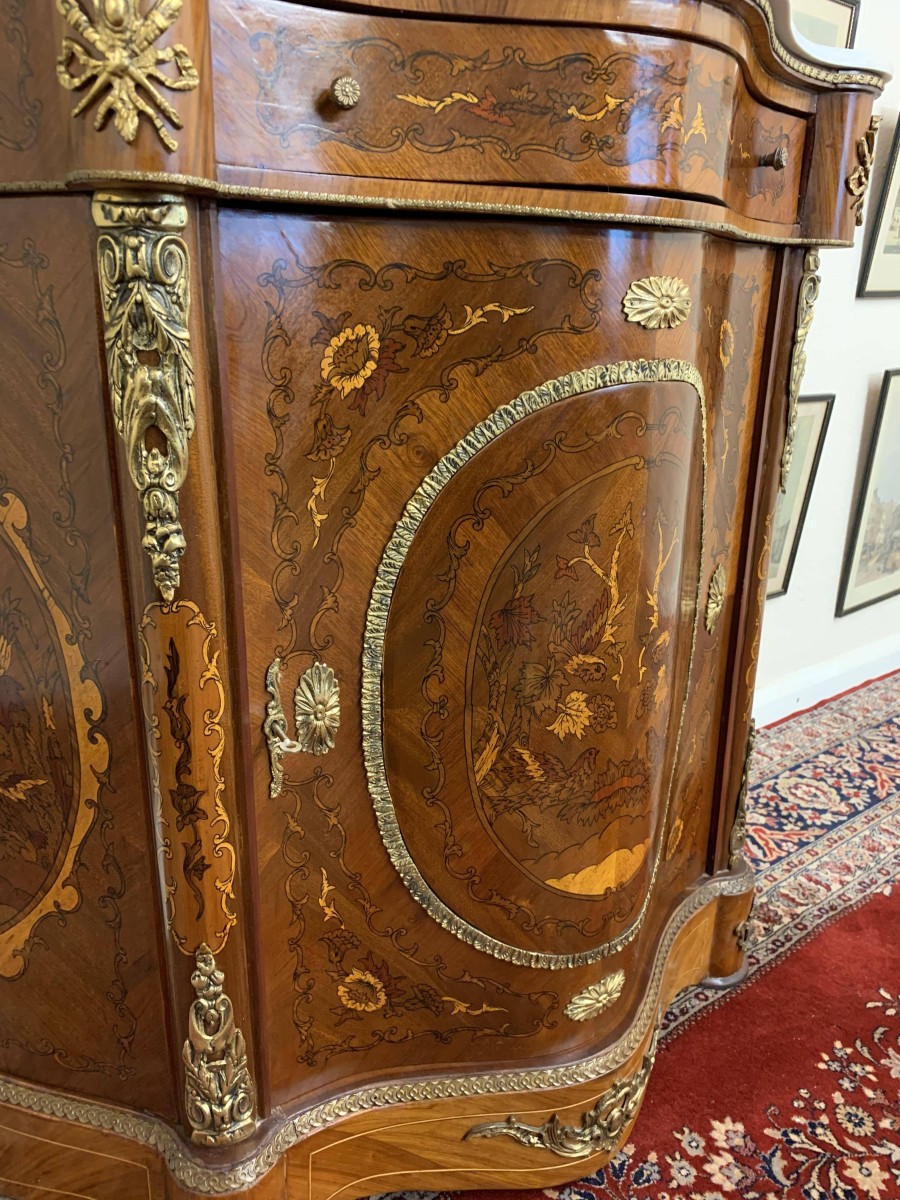 This is a highly attractive item of quality furniture which would grace any home. The shaped marble top sits on a serpentine shaped base. The base has a shaped drawer, lockable central door and shaped sides. The base is decorated with beautiful marquetry inlay of birds and floral decoration. The cabinet is adourned with dectorative brass mounts and ornate brass trim. A stylish item of furniture.