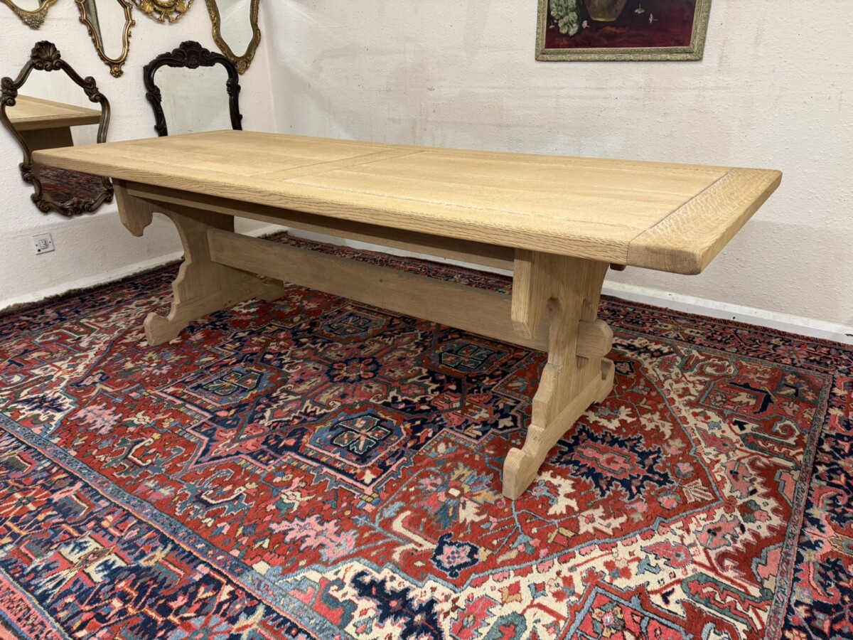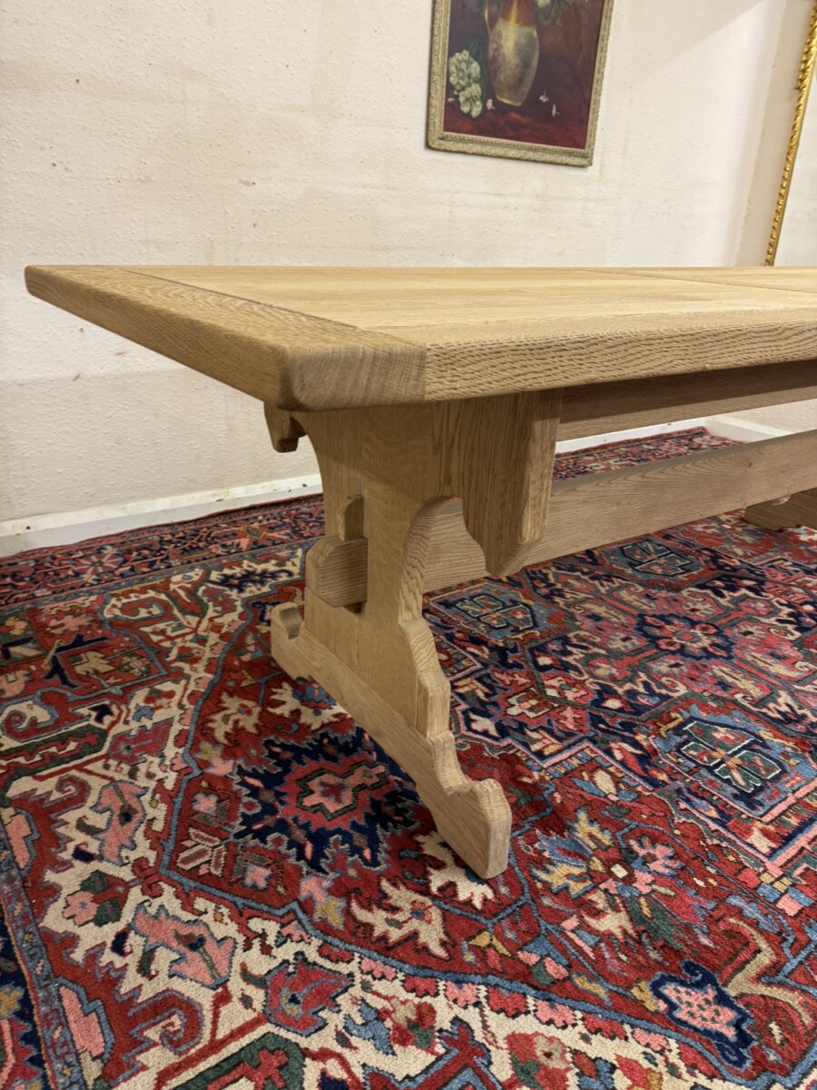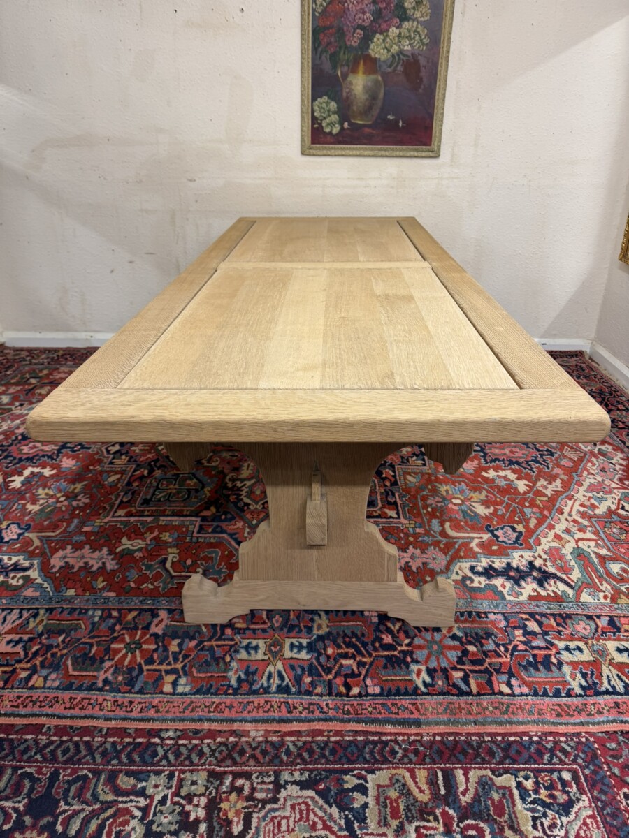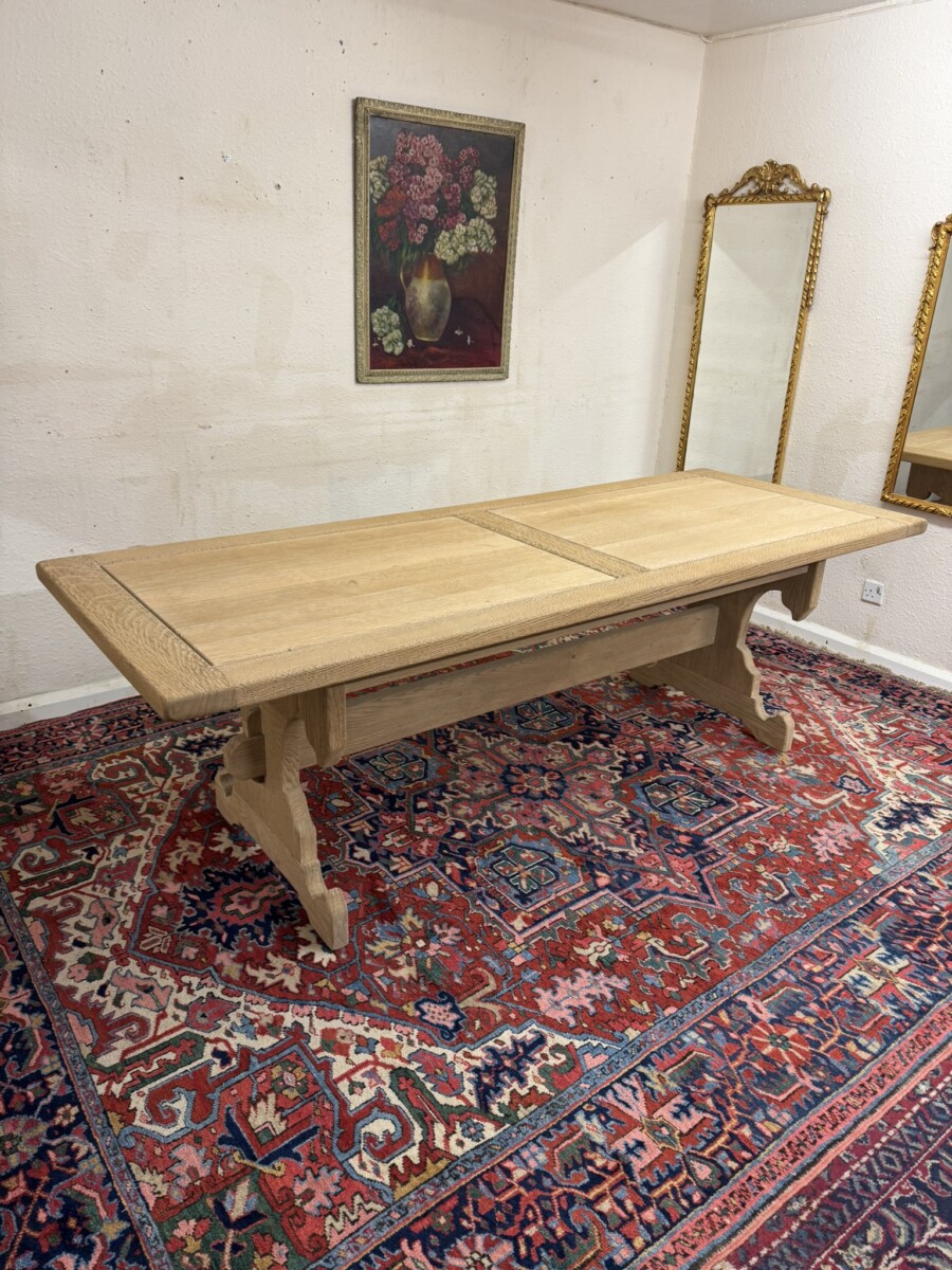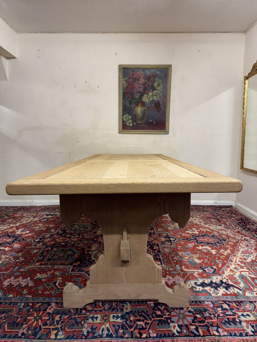 This fabulous French table is in excellent condition and has a striking raw oak finish, giving the perfect neutral palette to your room. Large in design and high in quality. The thick panelled top sits on a refectory style base of two shaped slab ends with thick stretcher support.
