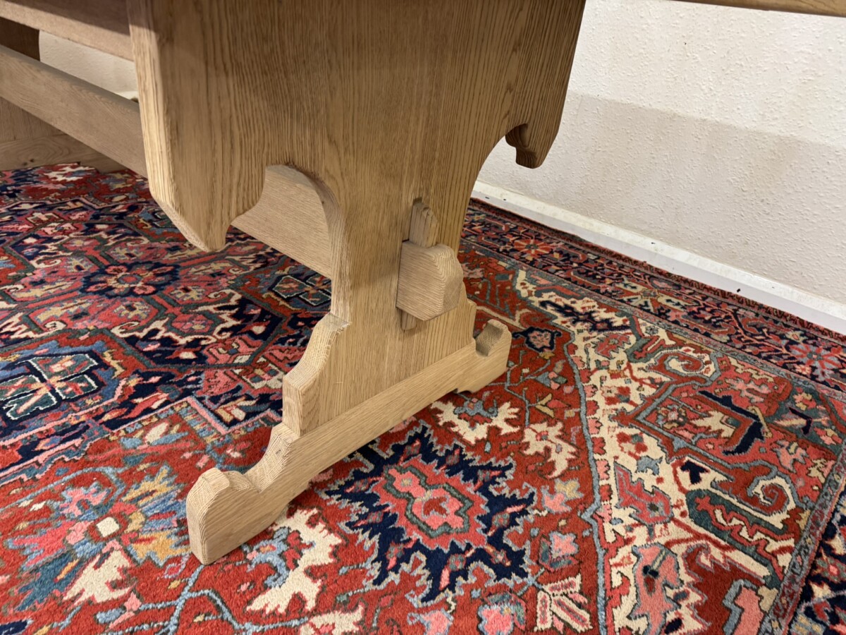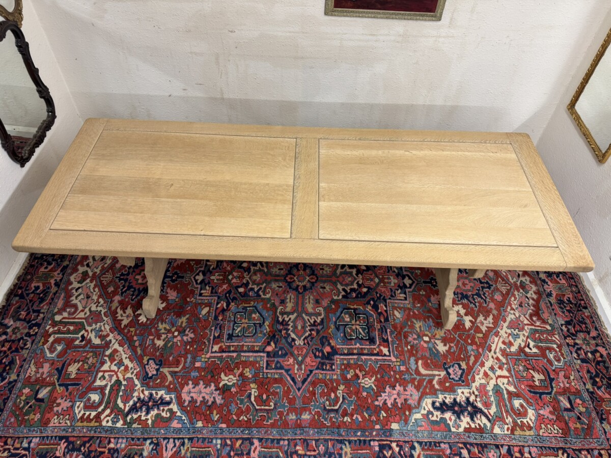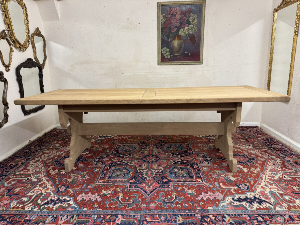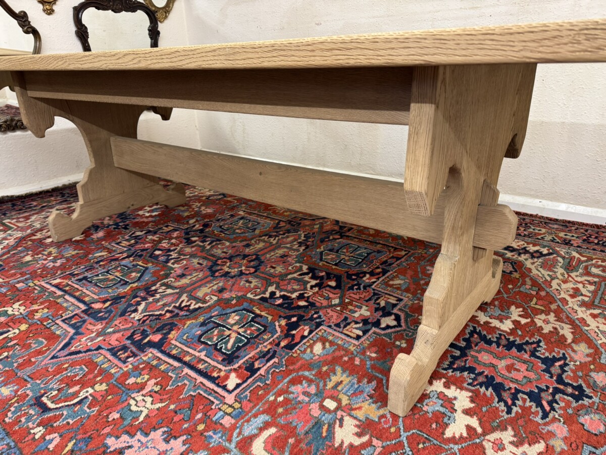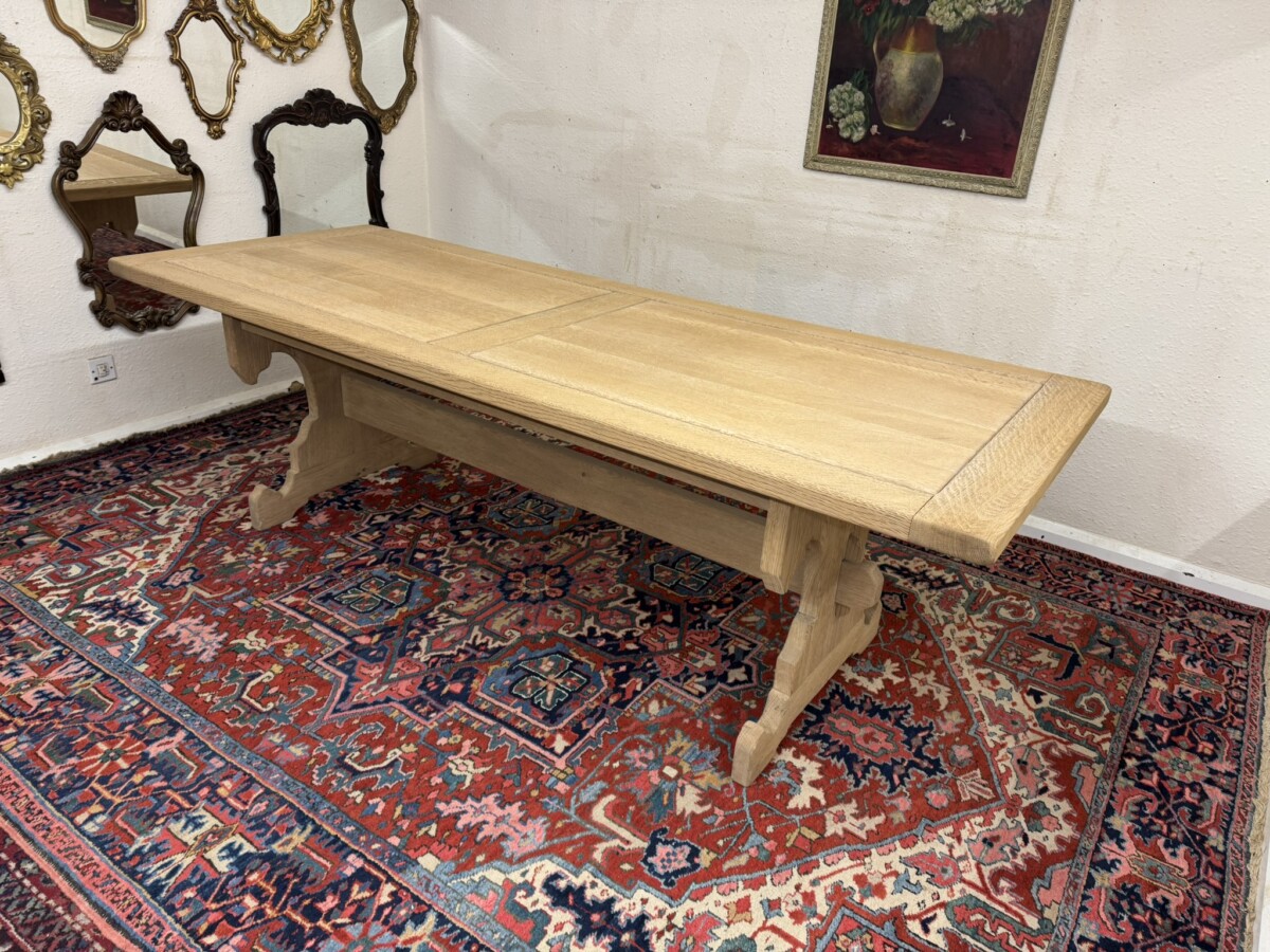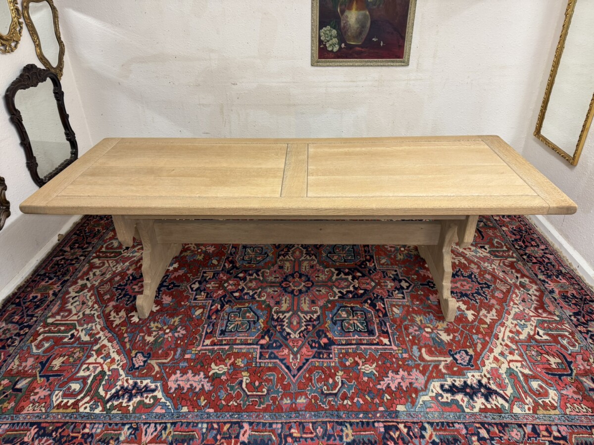 This fabulous French table is in excellent condition and has a striking raw oak finish, giving the perfect neutral palette to your room. Large in design and high in quality. The thick panelled top sits on a refectory style base of two shaped slab ends with thick stretcher support.