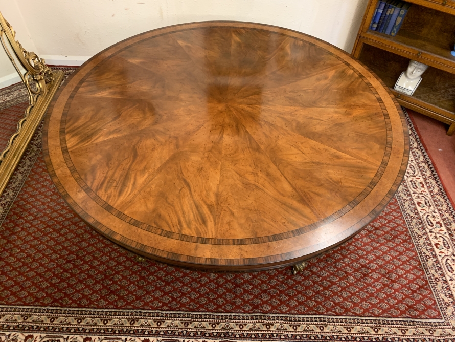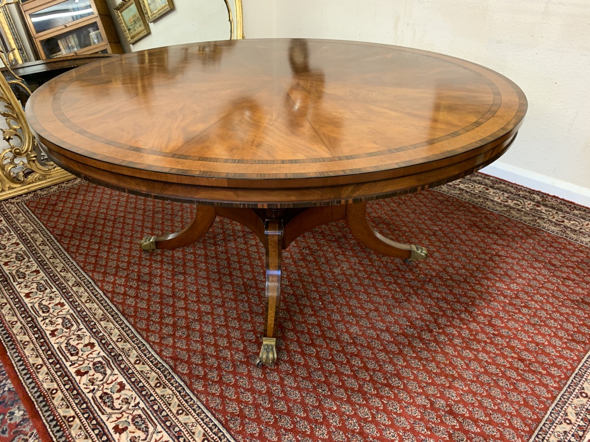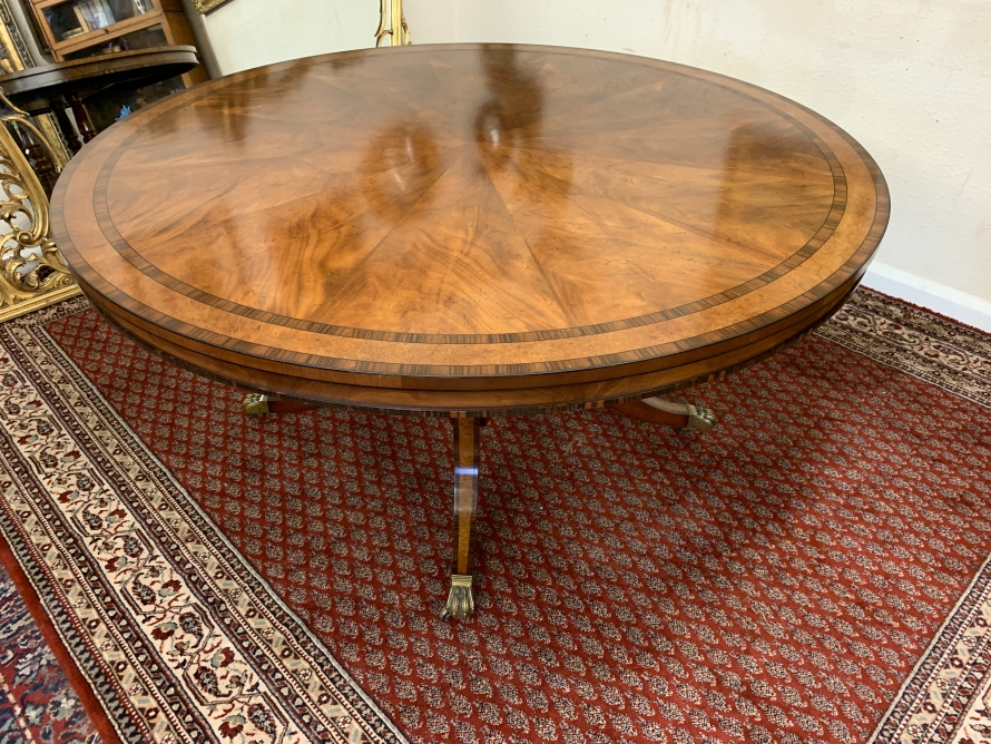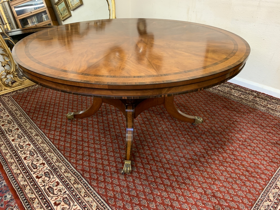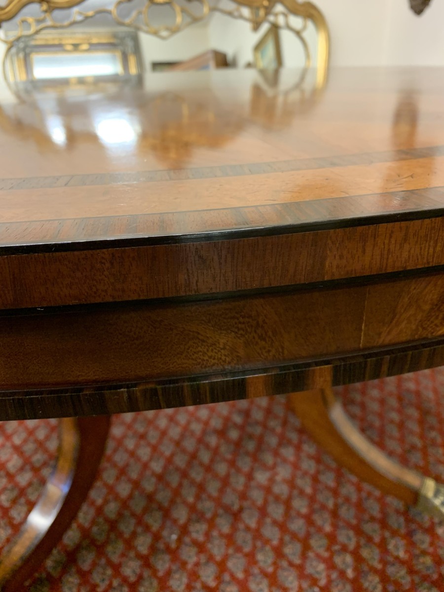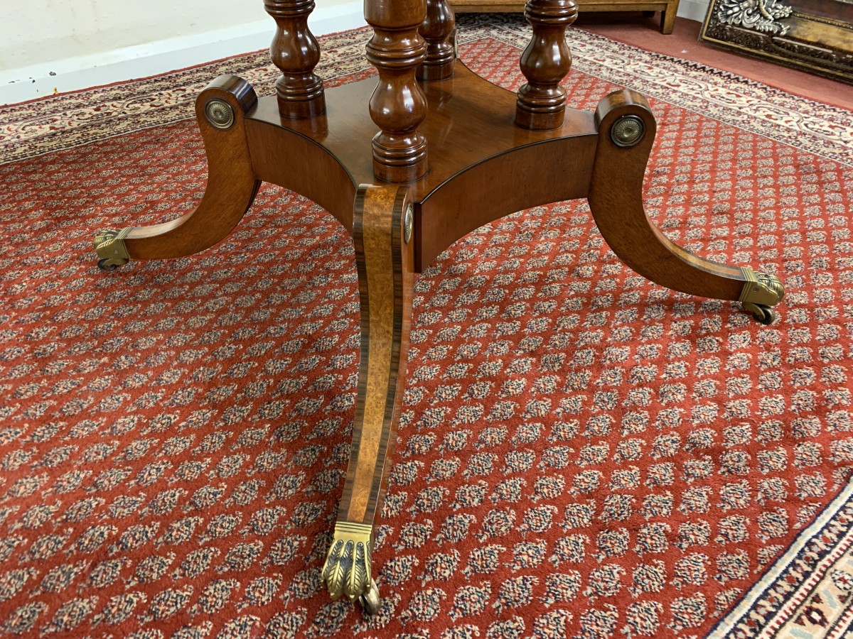 This fabulous table is in excellent condition. The segmented mahogany top has fabulous walnut and rosewood edging. The pedestal base has four elegant turned columns, four outswept legs with brass claw caps on four brass casters. A stunning table which is in excellent condition.