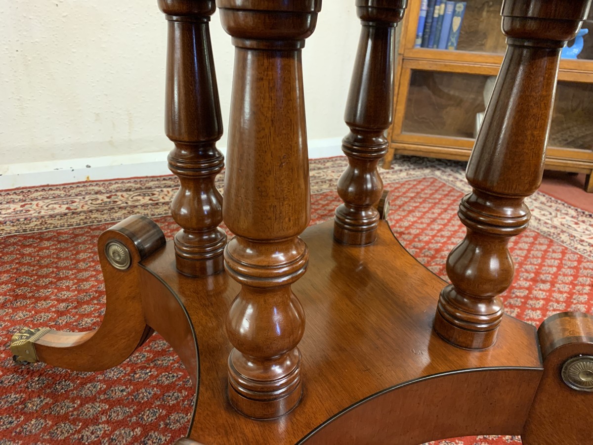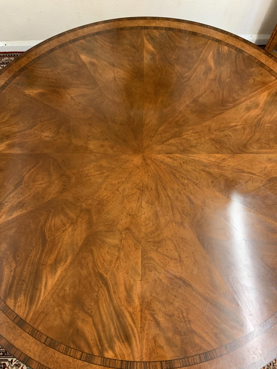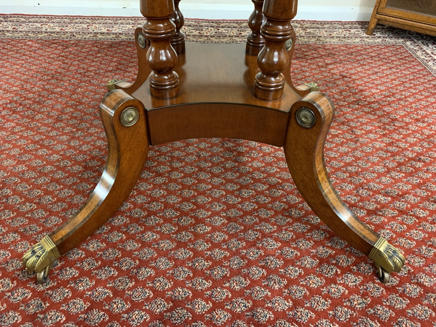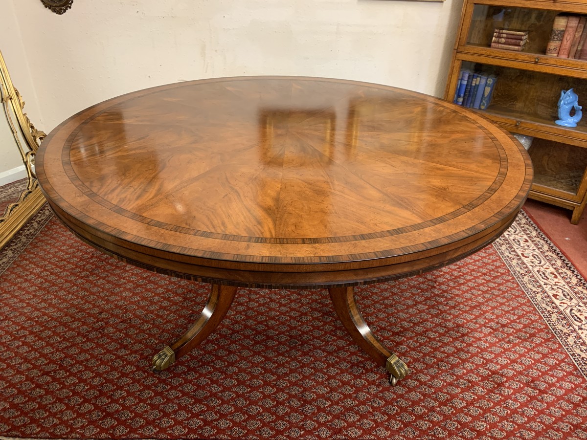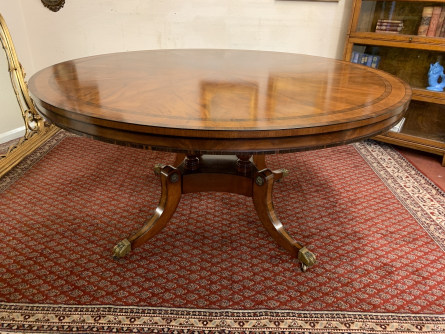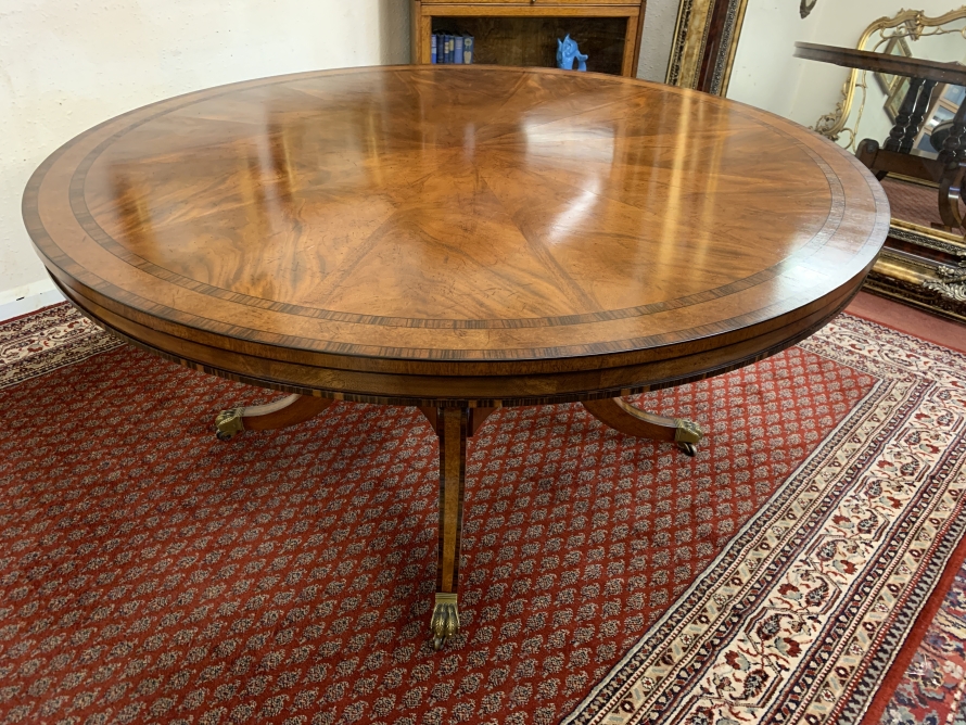 This fabulous table is in excellent condition. The segmented mahogany top has fabulous walnut and rosewood edging. The pedestal base has four elegant turned columns, four outswept legs with brass claw caps on four brass casters. A stunning table which is in excellent condition.