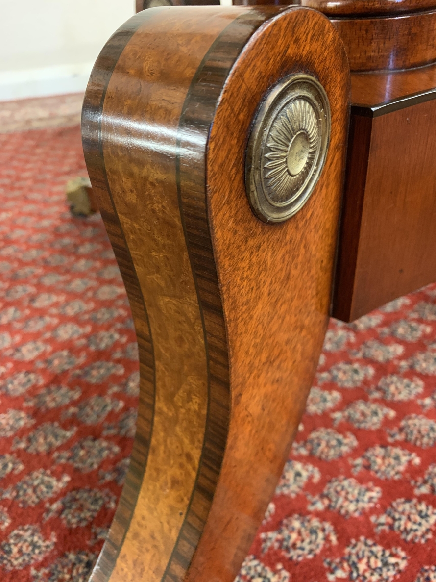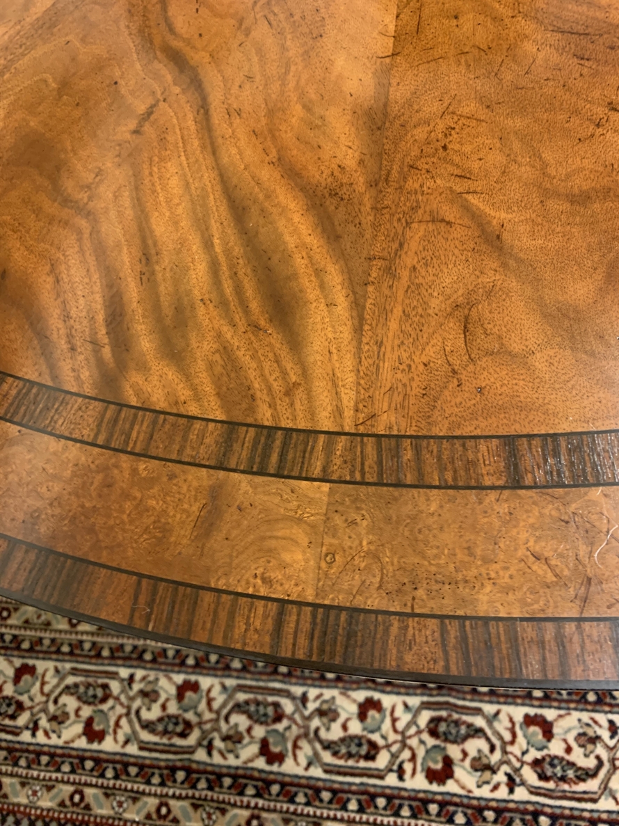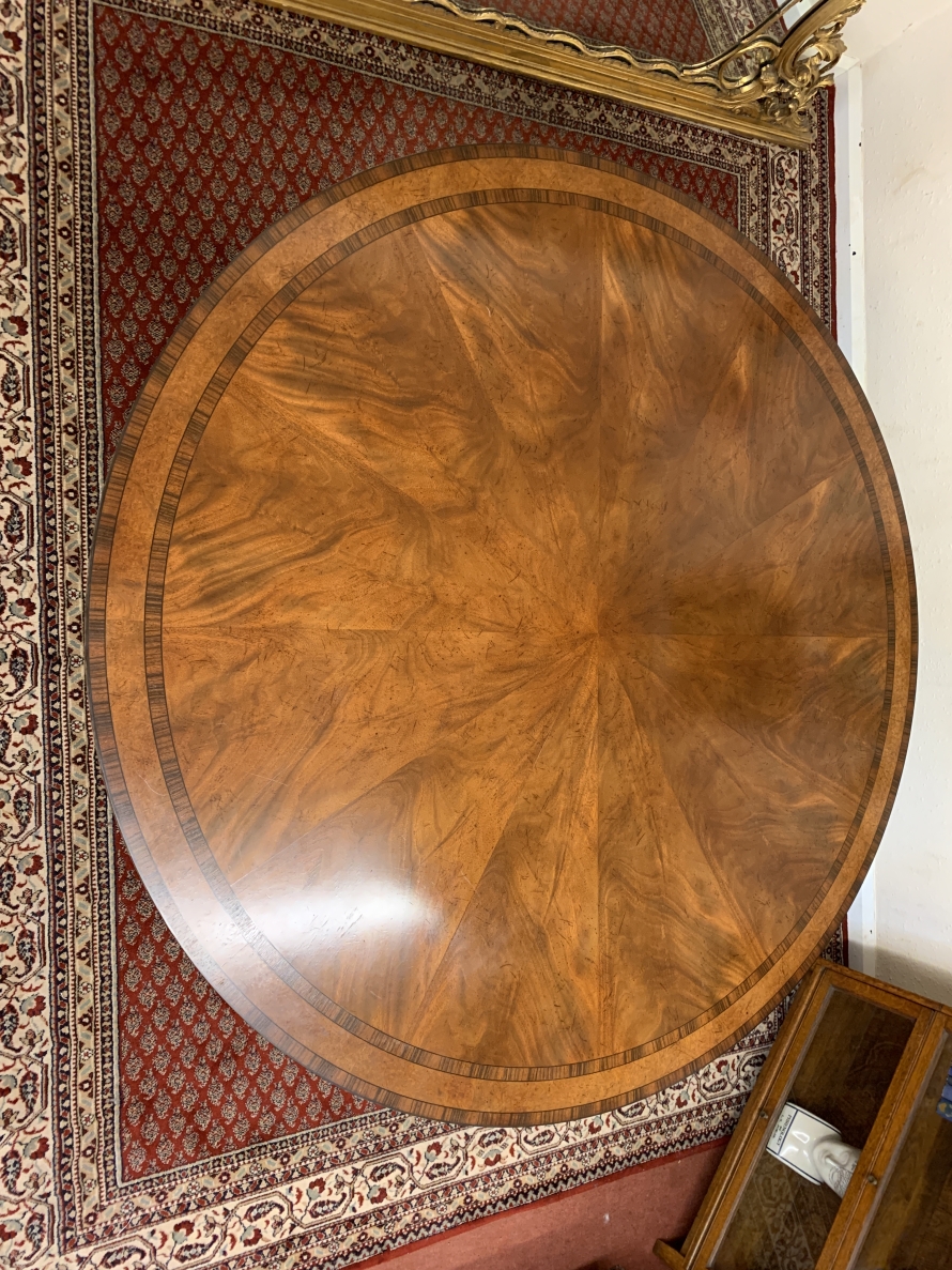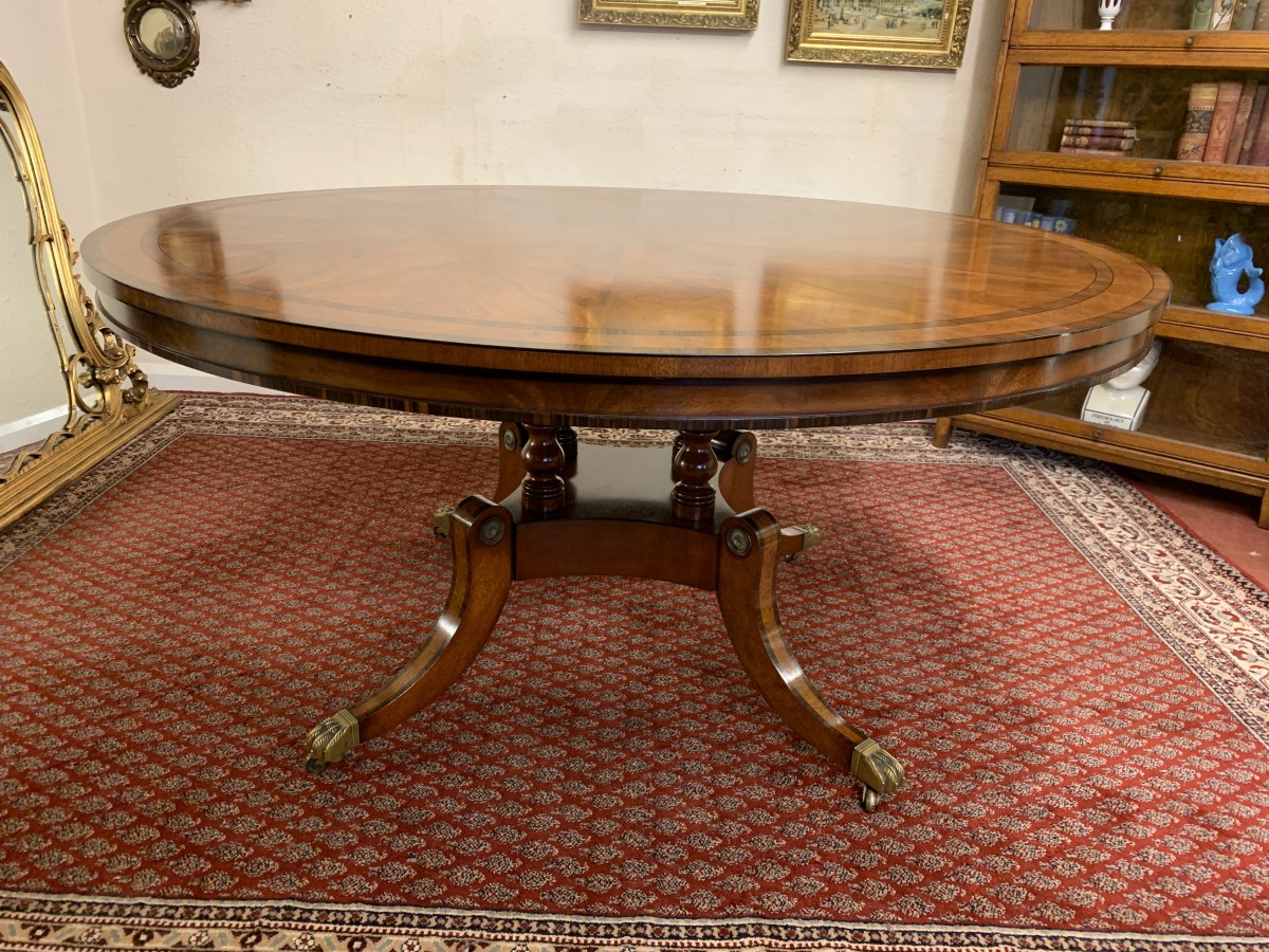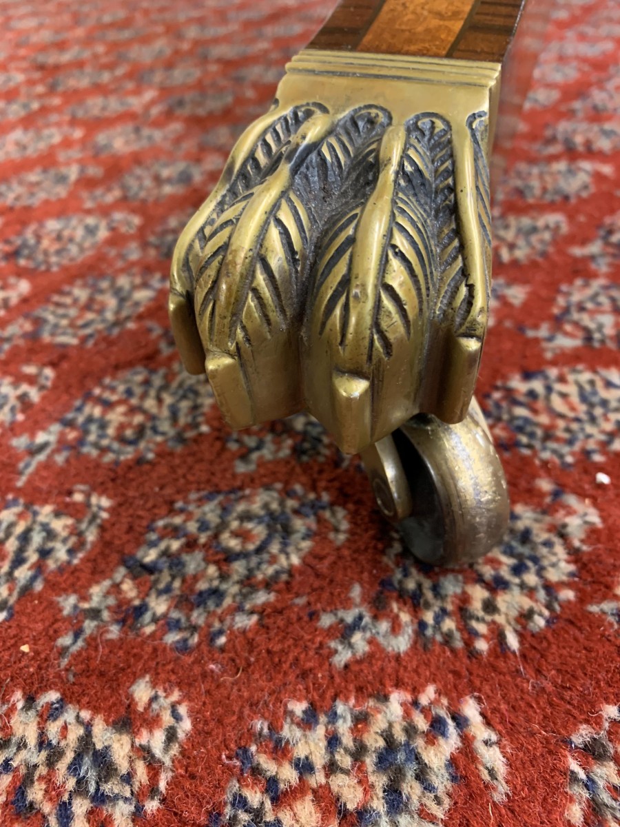 This fabulous table is in excellent condition. The segmented mahogany top has fabulous walnut and rosewood edging. The pedestal base has four elegant turned columns, four outswept legs with brass claw caps on four brass casters. A stunning table which is in excellent condition.