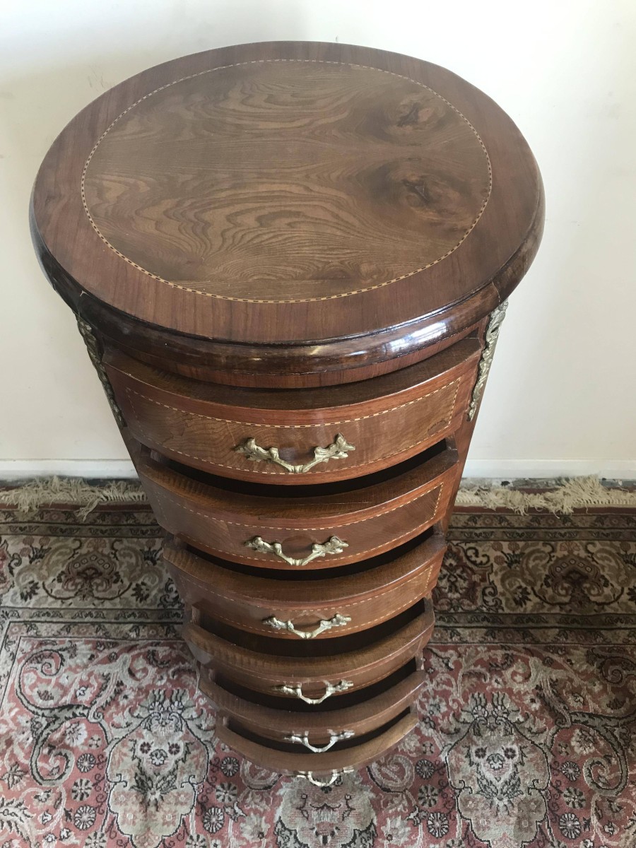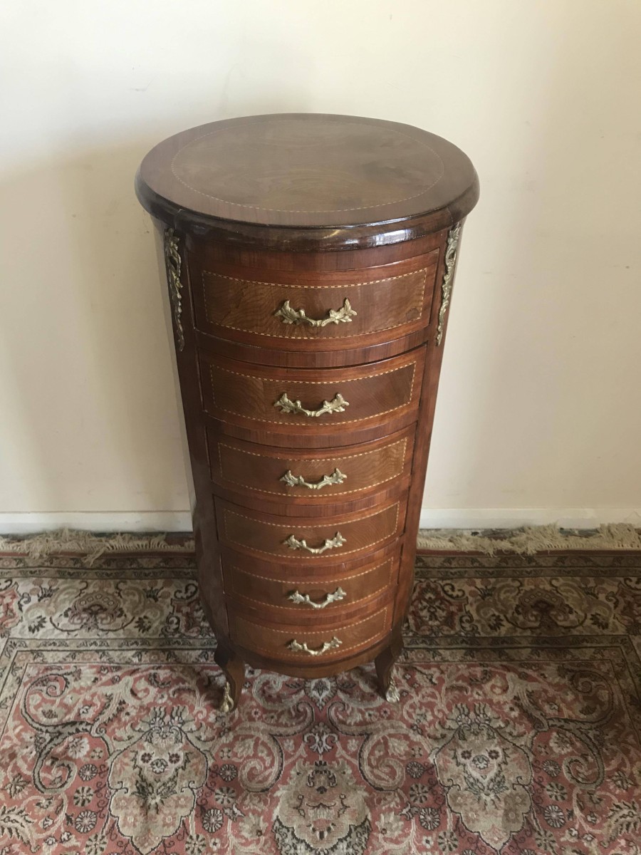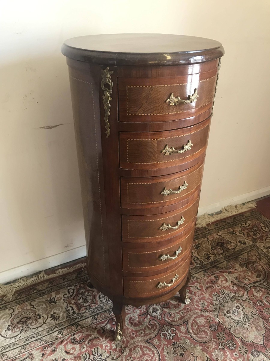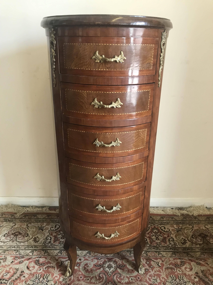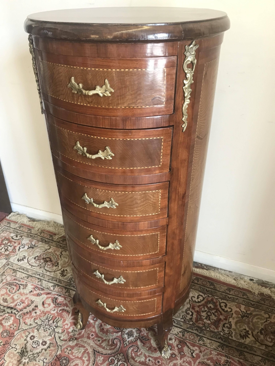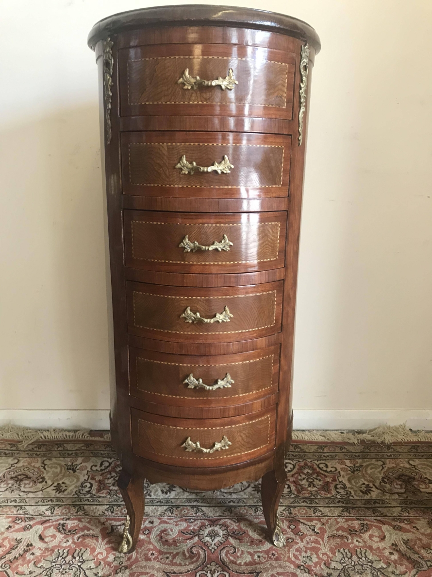 For sale,we are delighted to offer this unusual cylindrical shaped chest of drawers. The chest has inlay decoration throughout. There are guilt mounts to the sides of the drawers and also decorative guilt mounts to the front legs. There are six handy storage drawers, each drawer having ornate decorative handles and inlay decoration. An unusual decorative chest of drawers.
