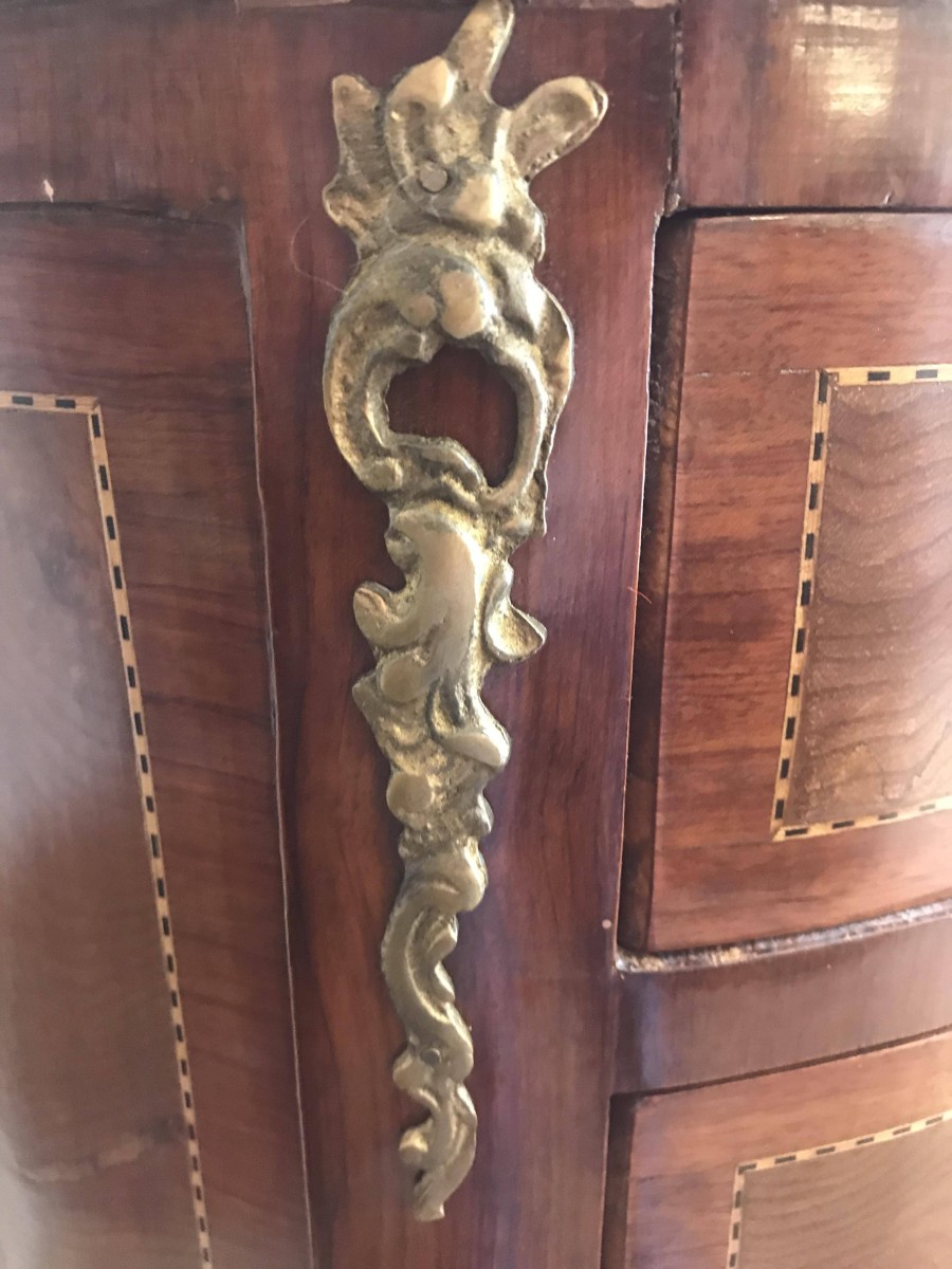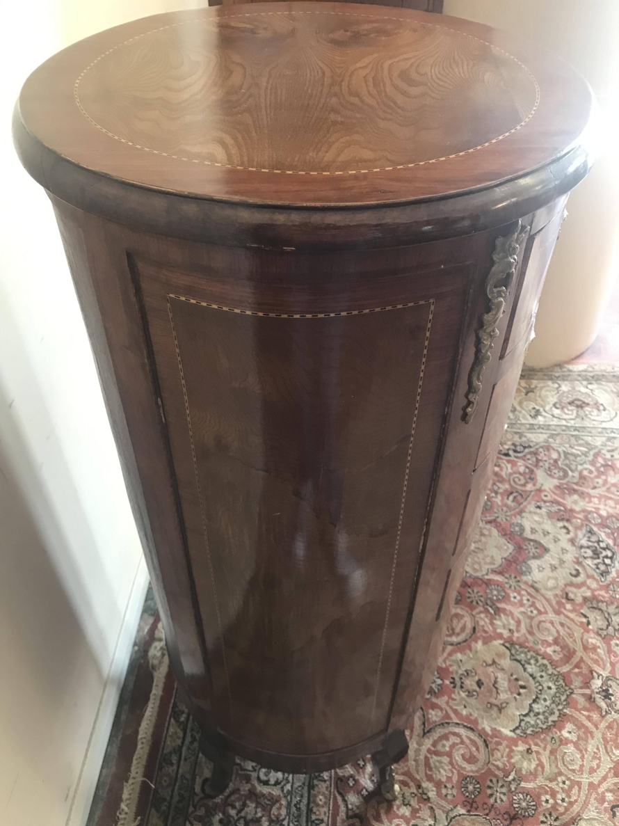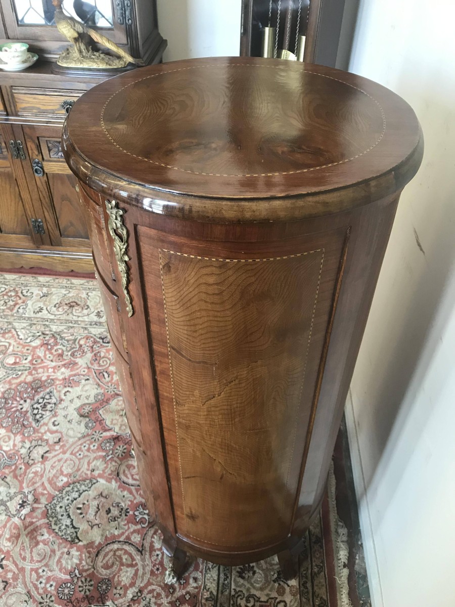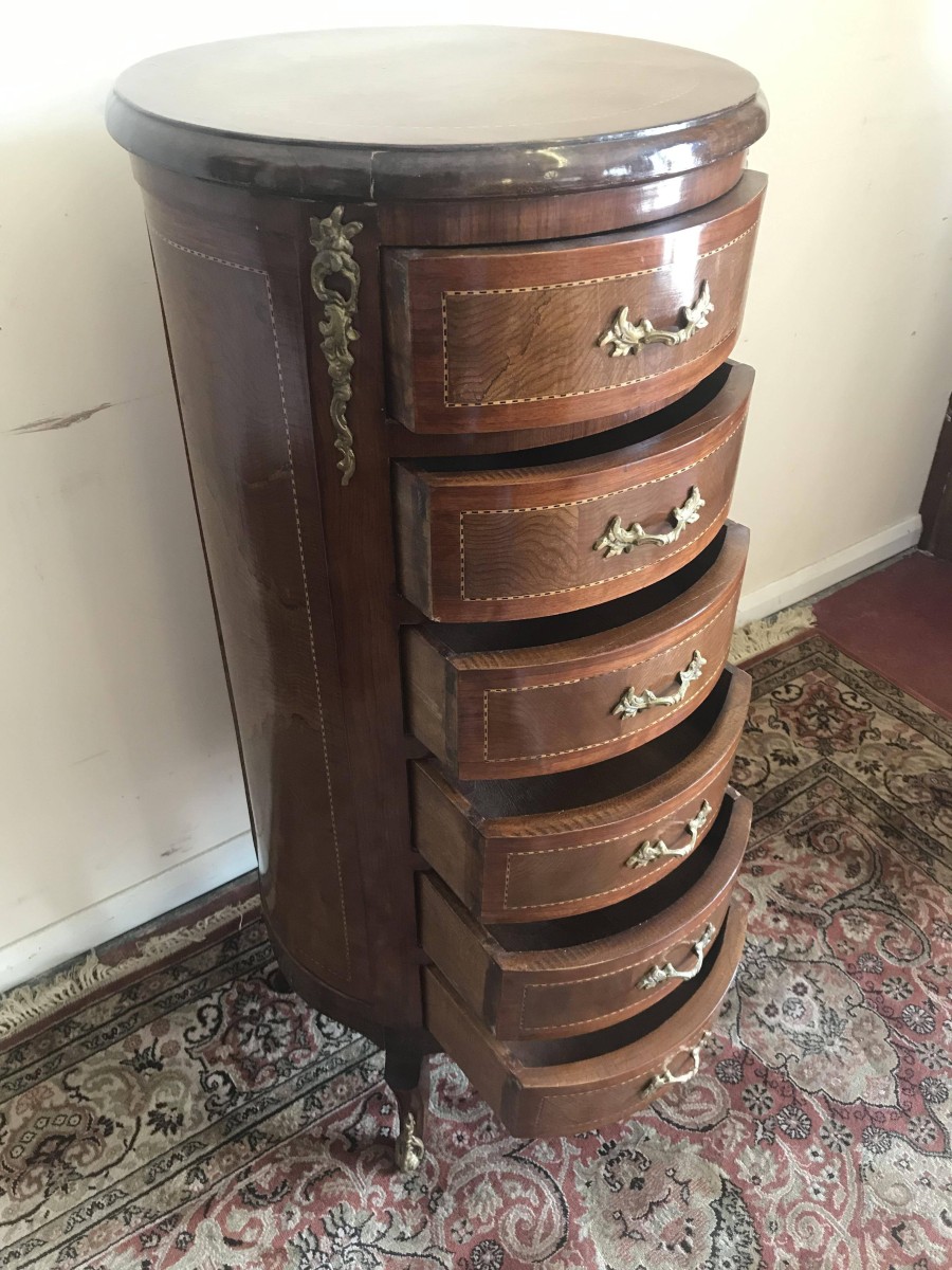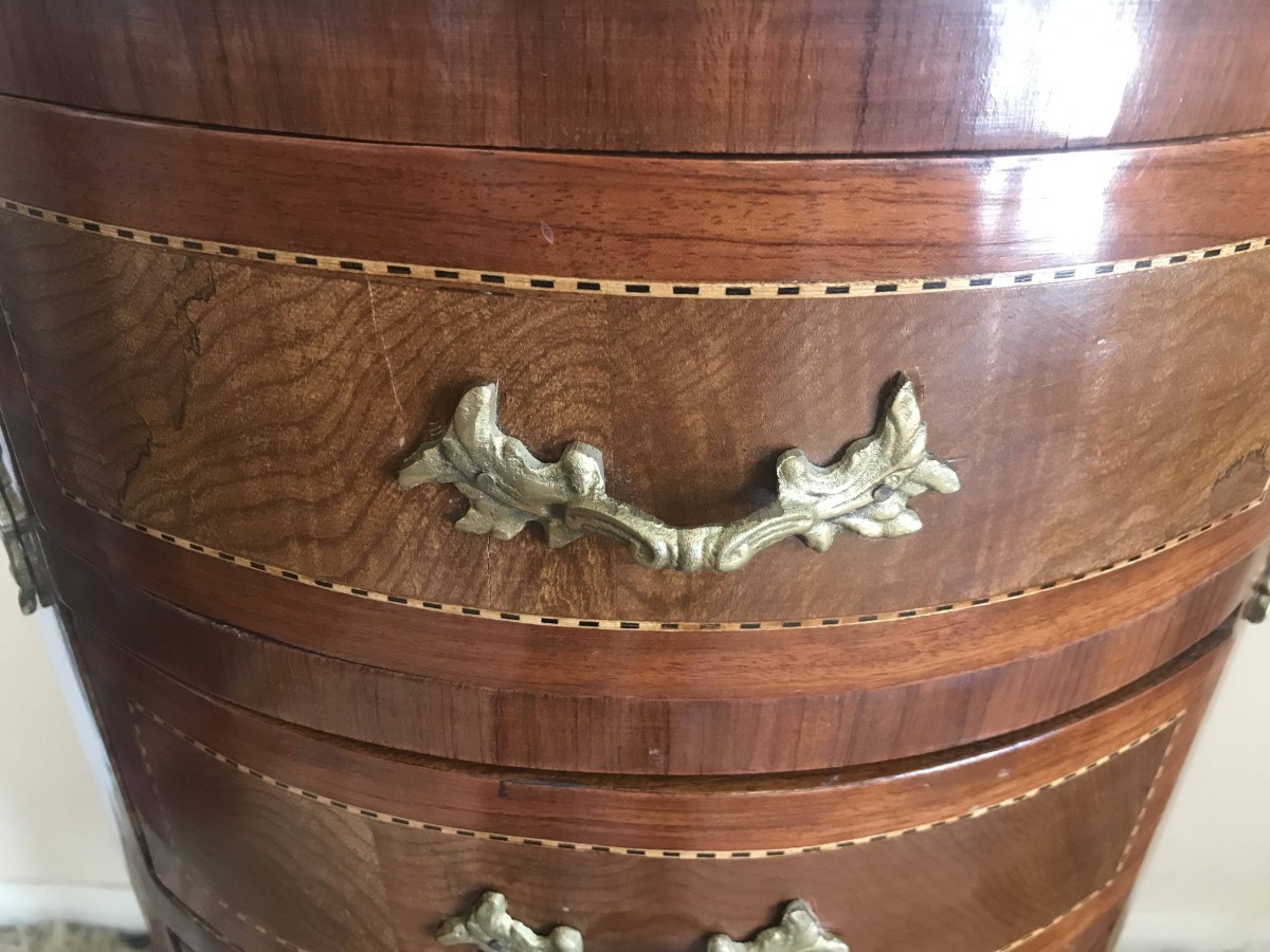 For sale,we are delighted to offer this unusual cylindrical shaped chest of drawers. The chest has inlay decoration throughout. There are guilt mounts to the sides of the drawers and also decorative guilt mounts to the front legs. There are six handy storage drawers, each drawer having ornate decorative handles and inlay decoration. An unusual decorative chest of drawers.