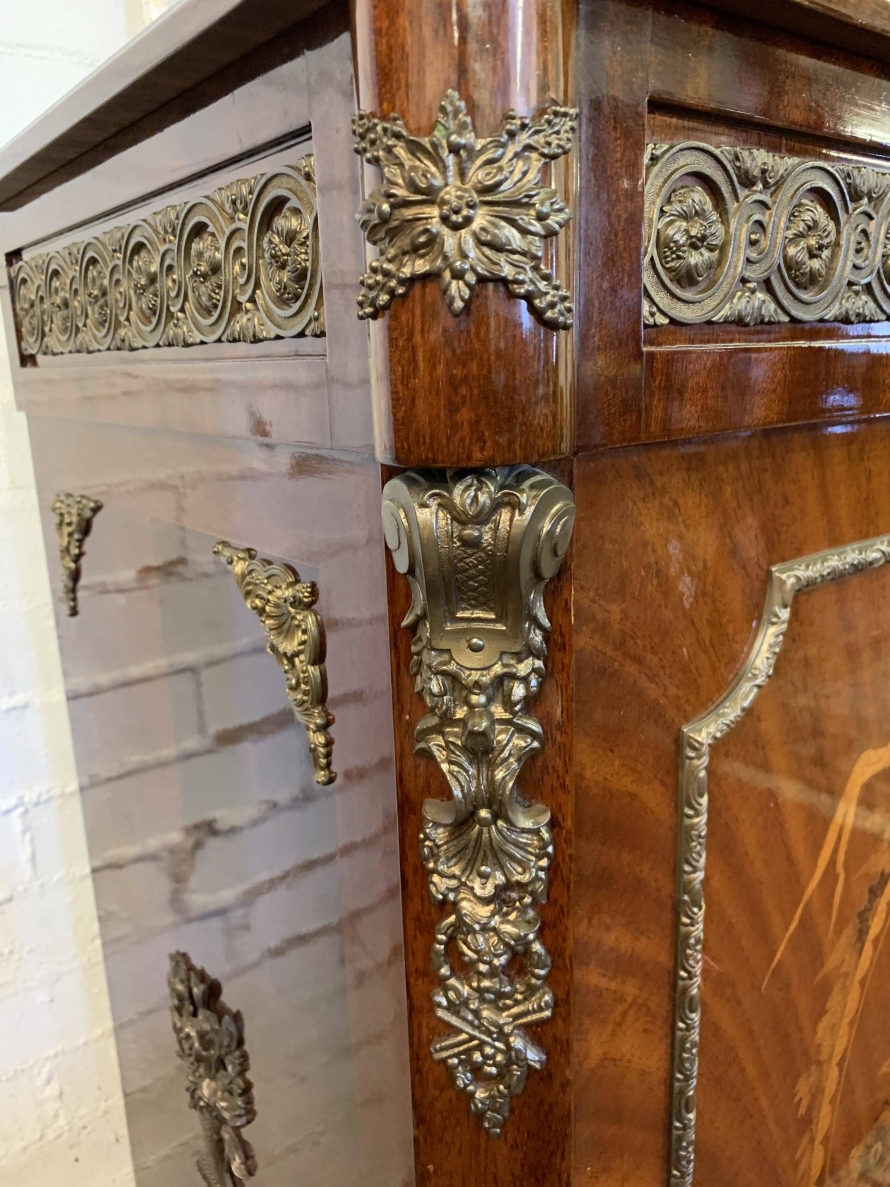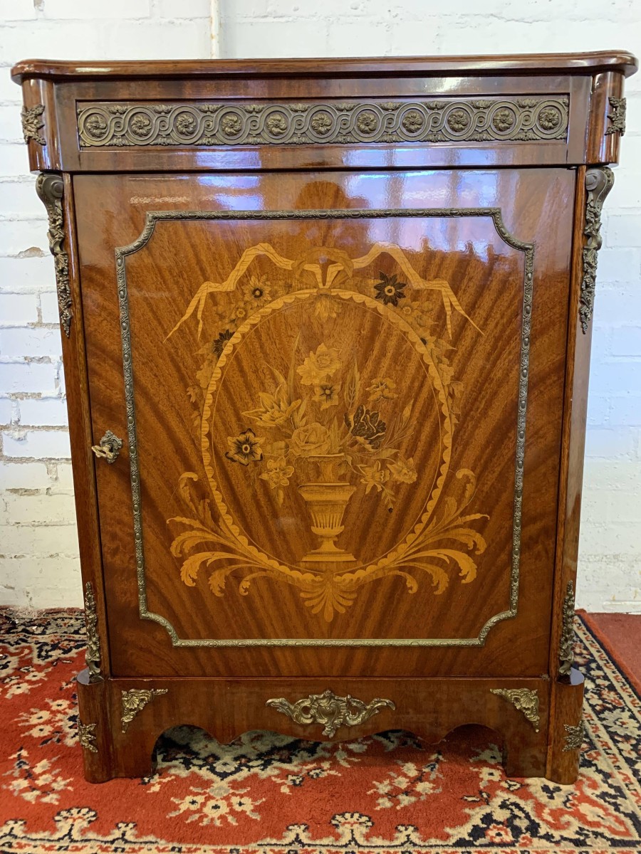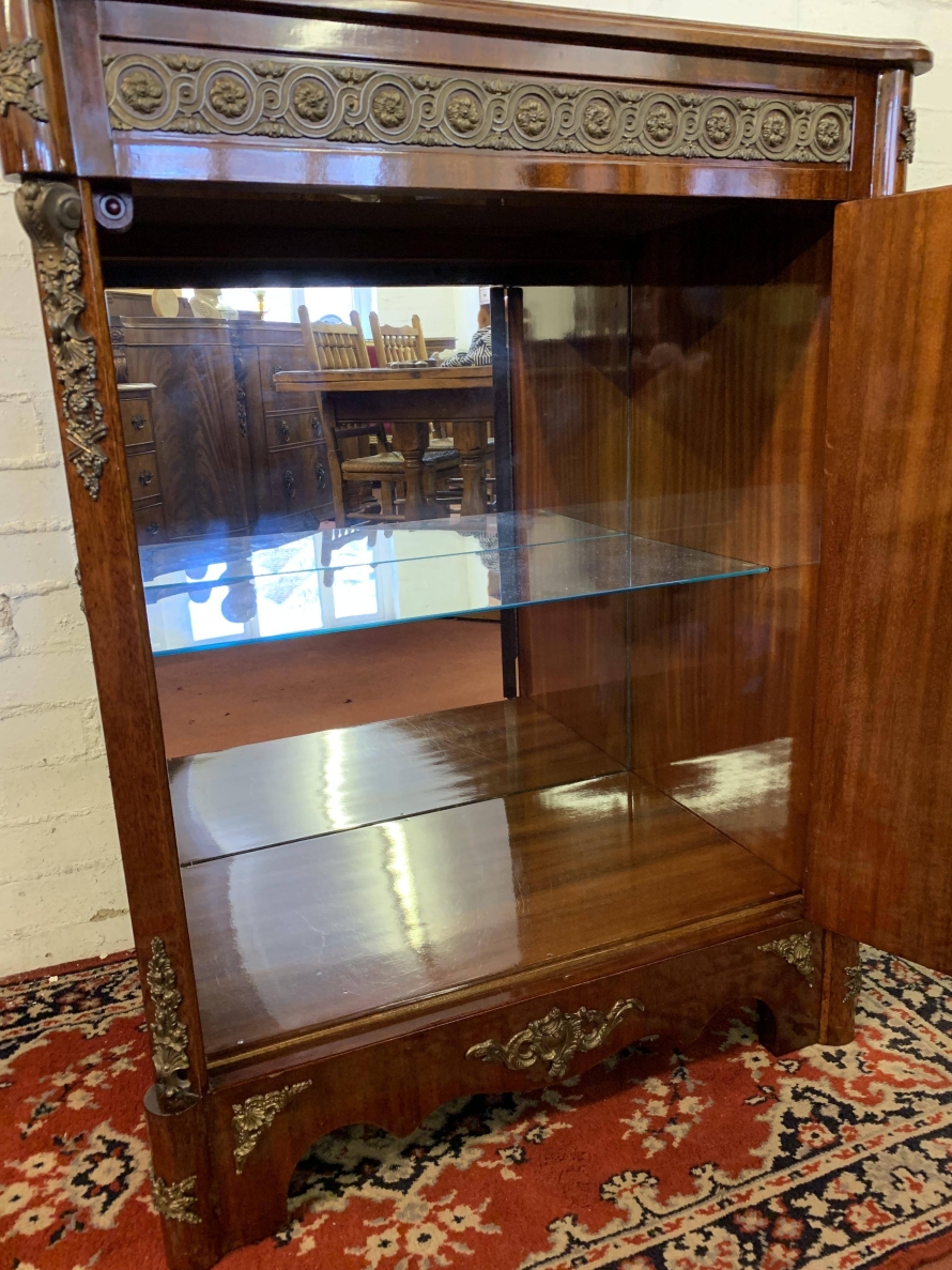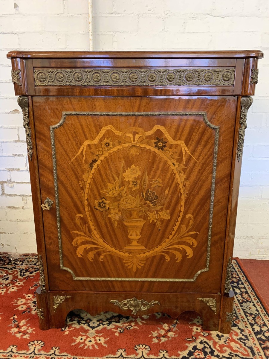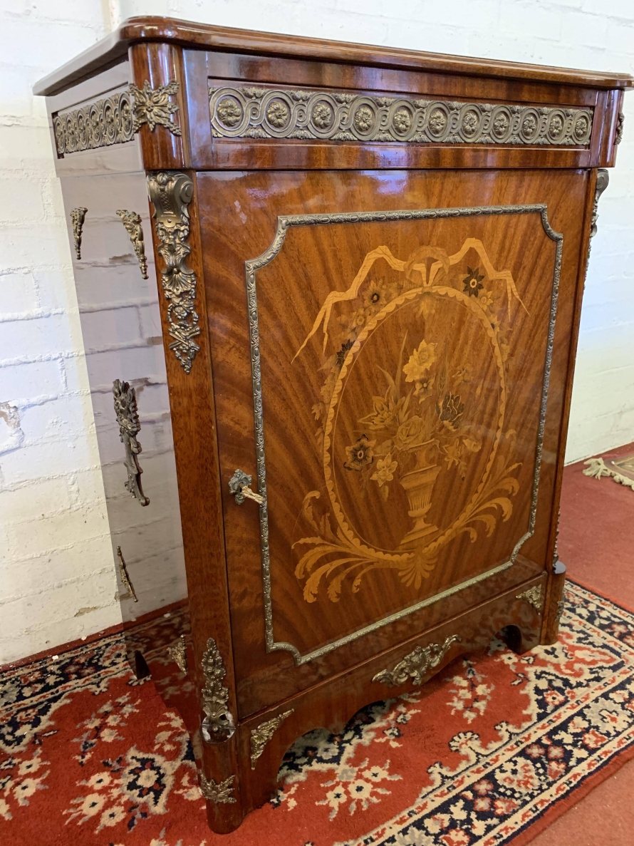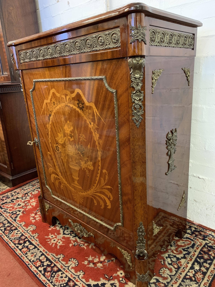 The shaped over sailing top is cross banded, below is highly decorative brass decoration, the sides also have brass decoration. The lockable cupboard door has a glorious inlaid panel, the panel depicting floral decoration, the panel has a decorative brass border. The door opens to reveal a mirrored back and a removable glass shelf. A great decorative yet functional item of furniture.