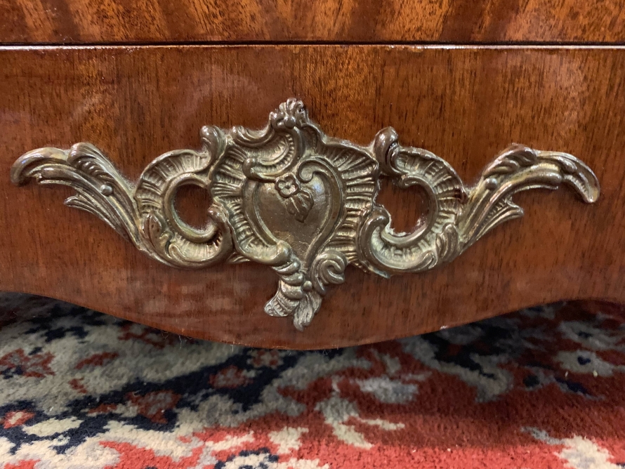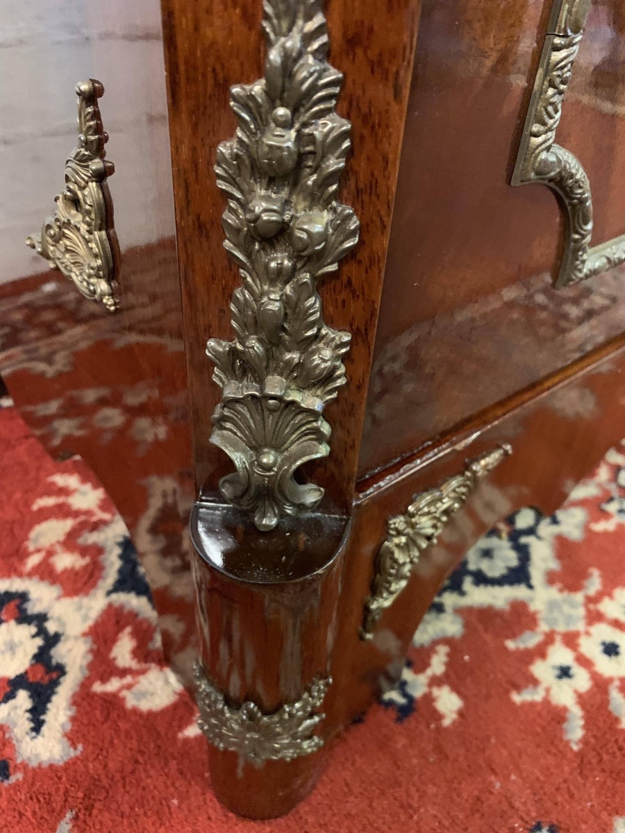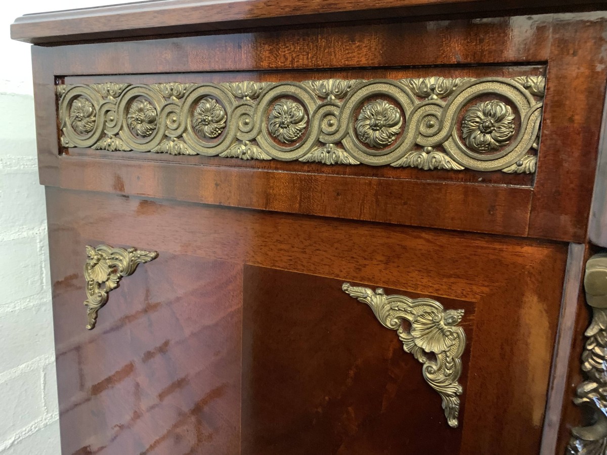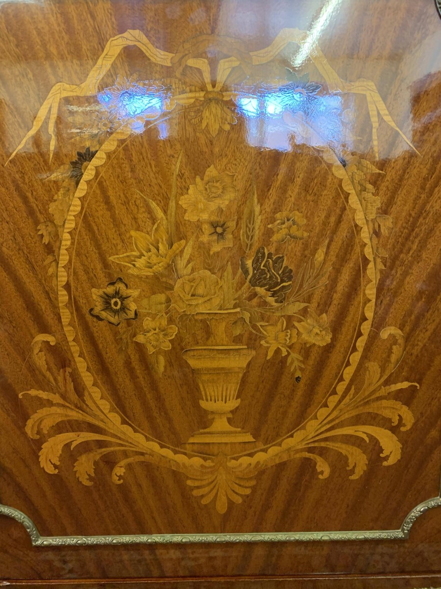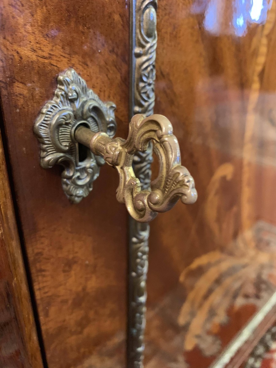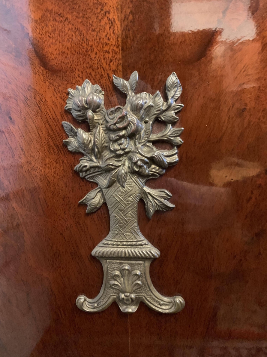 The shaped over sailing top is cross banded, below is highly decorative brass decoration, the sides also have brass decoration. The lockable cupboard door has a glorious inlaid panel, the panel depicting floral decoration, the panel has a decorative brass border. The door opens to reveal a mirrored back and a removable glass shelf. A great decorative yet functional item of furniture.