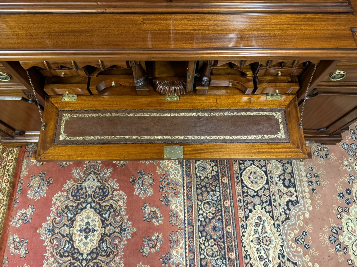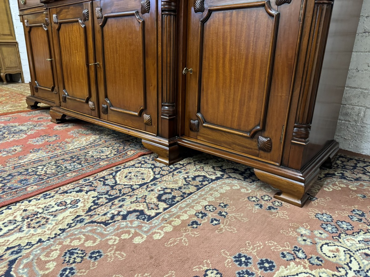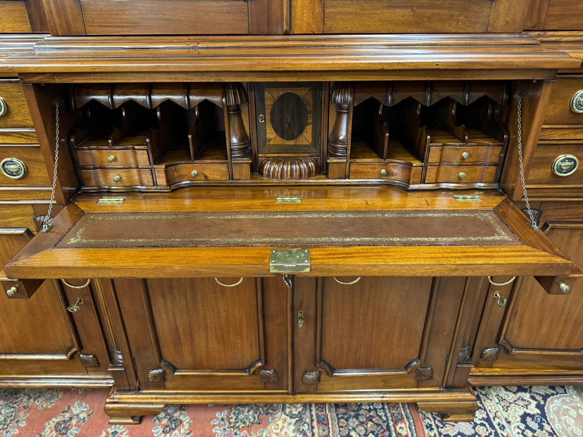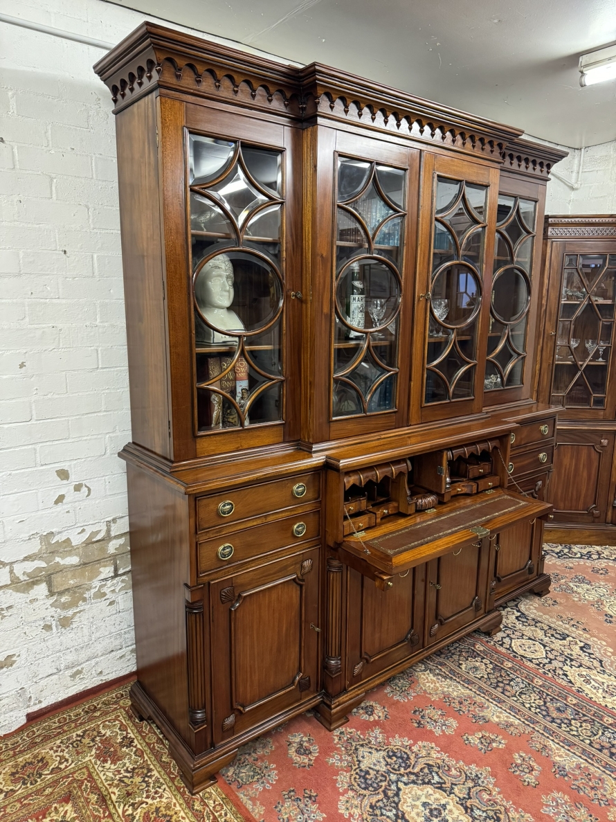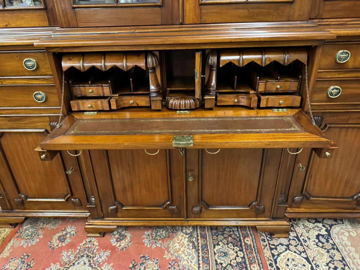 Made in outstanding quality mahogany and in excellent condition. The oversailing top has carved decoration, below are four lockable glazed doors, the central pair of doors are brakefront in design. The doors have stylish wood barring decoration and bevelled glass, a sure sign of quality. The two central lockable dummy drawers drop down and sit on retractable rests, when open it reveals a fabulous secretaire interior consisting of pigeonholes, drawers and a central lockable cupboard door, there are also secret compartments. The interior of the fall has a tooled leather surface. Below are a pair of lockable cupboard doors these doors open to reveal a removable shelf; the central section is flanked by a pair of drawers, each drawer having a pair of urn decorated brass handles. Below the drawers is a lockable cupboard door, the doors open to reveal a removable shelf. Four fabulous reeded columns this exquisite secretaire bookcase stands on six bracket feet. A truly spectacular bookcase.