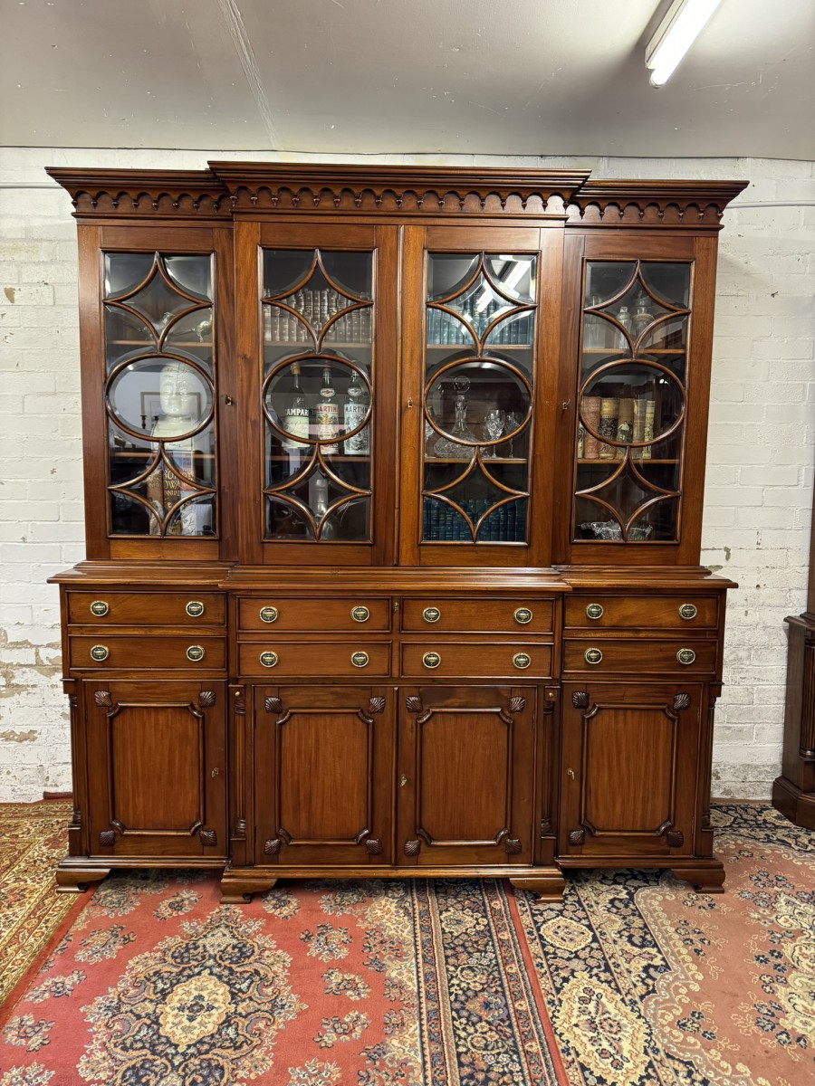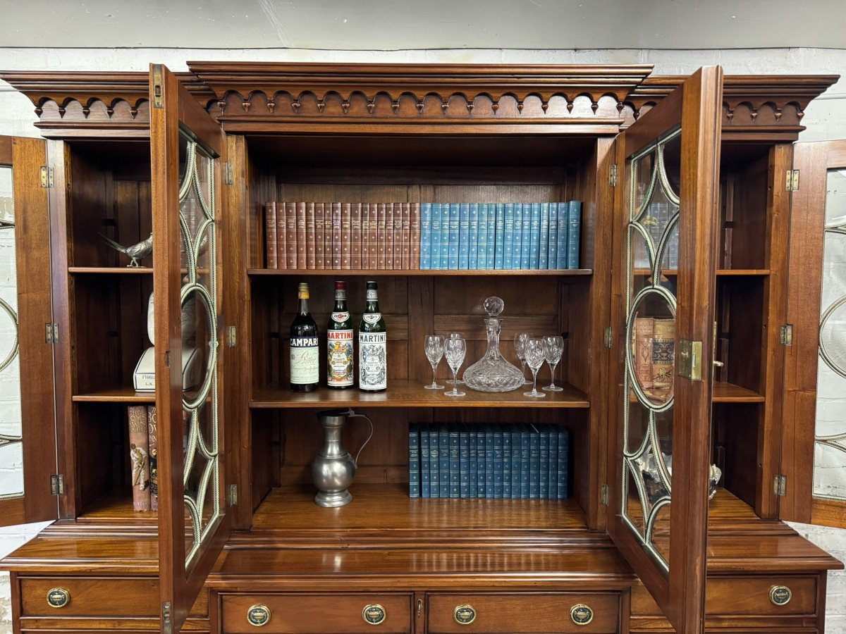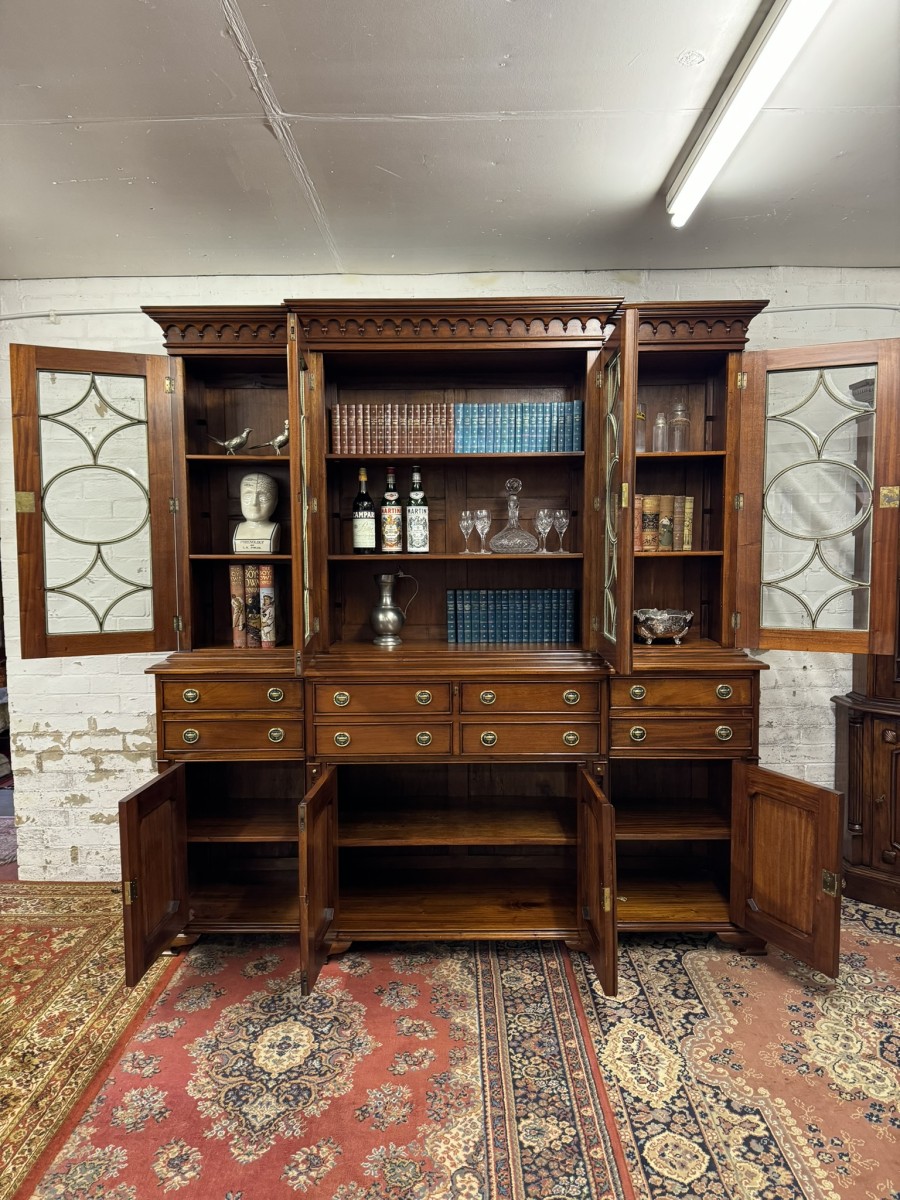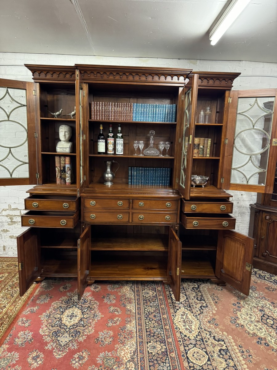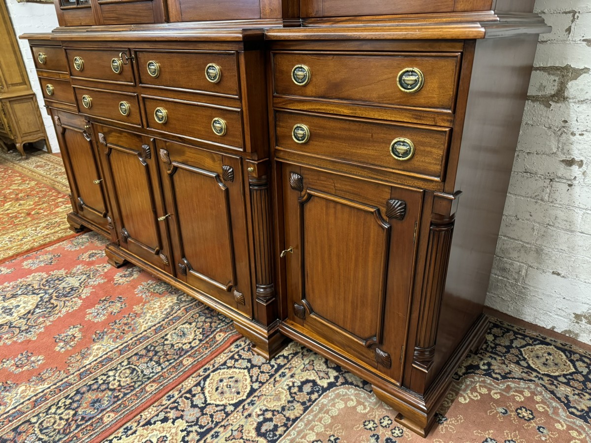 Made in outstanding quality mahogany and in excellent condition. The oversailing top has carved decoration, below are four lockable glazed doors, the central pair of doors are brakefront in design. The doors have stylish wood barring decoration and bevelled glass, a sure sign of quality. The two central lockable dummy drawers drop down and sit on retractable rests, when open it reveals a fabulous secretaire interior consisting of pigeonholes, drawers and a central lockable cupboard door, there are also secret compartments. The interior of the fall has a tooled leather surface. Below are a pair of lockable cupboard doors these doors open to reveal a removable shelf; the central section is flanked by a pair of drawers, each drawer having a pair of urn decorated brass handles. Below the drawers is a lockable cupboard door, the doors open to reveal a removable shelf. Four fabulous reeded columns this exquisite secretaire bookcase stands on six bracket feet. A truly spectacular bookcase.
