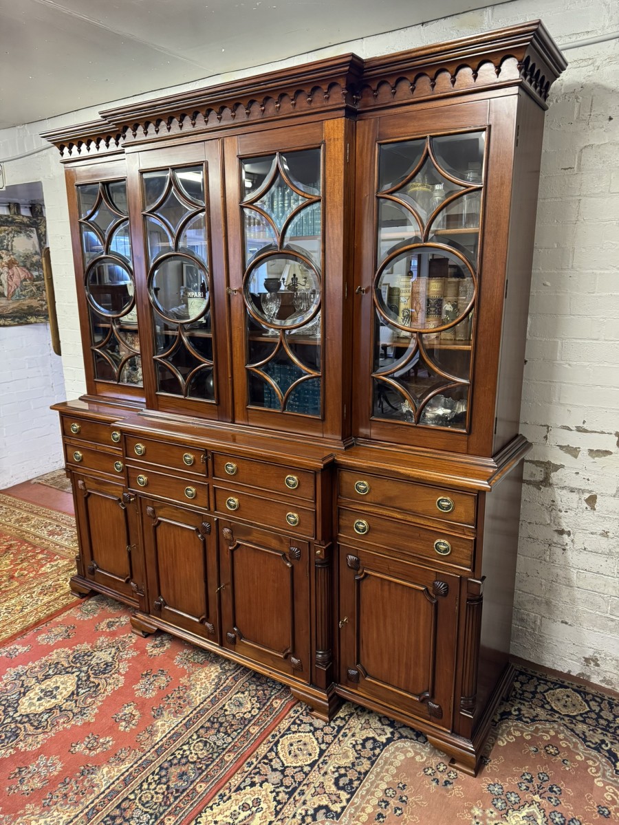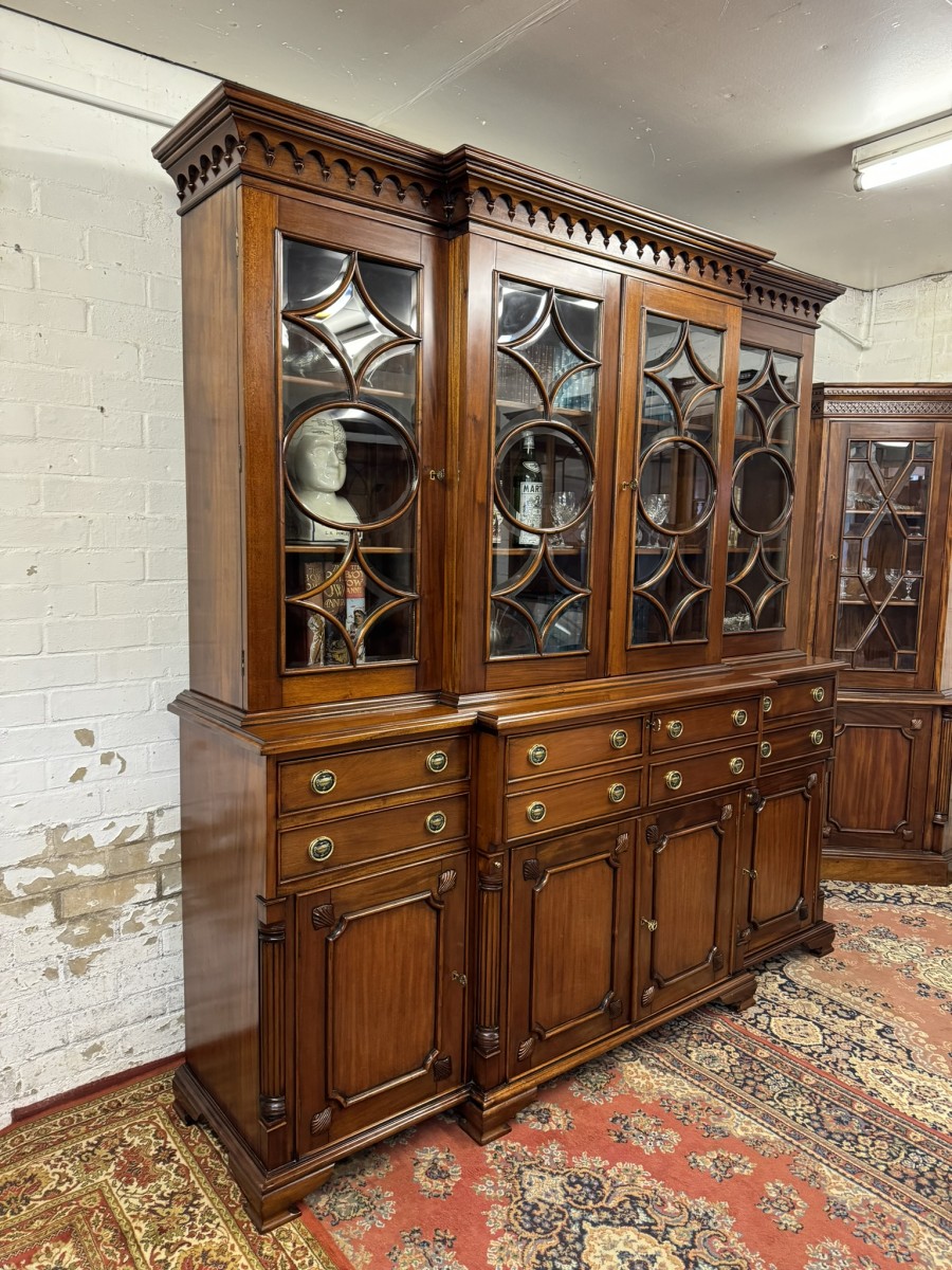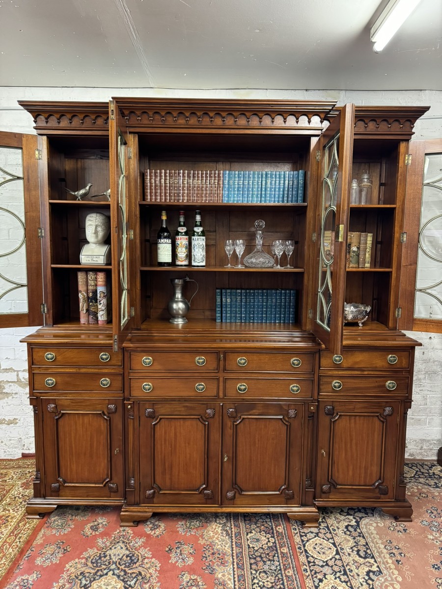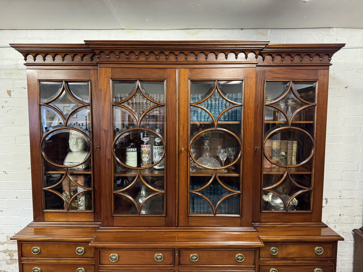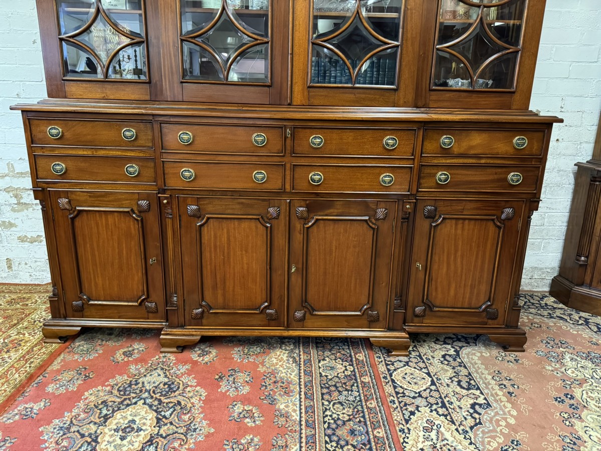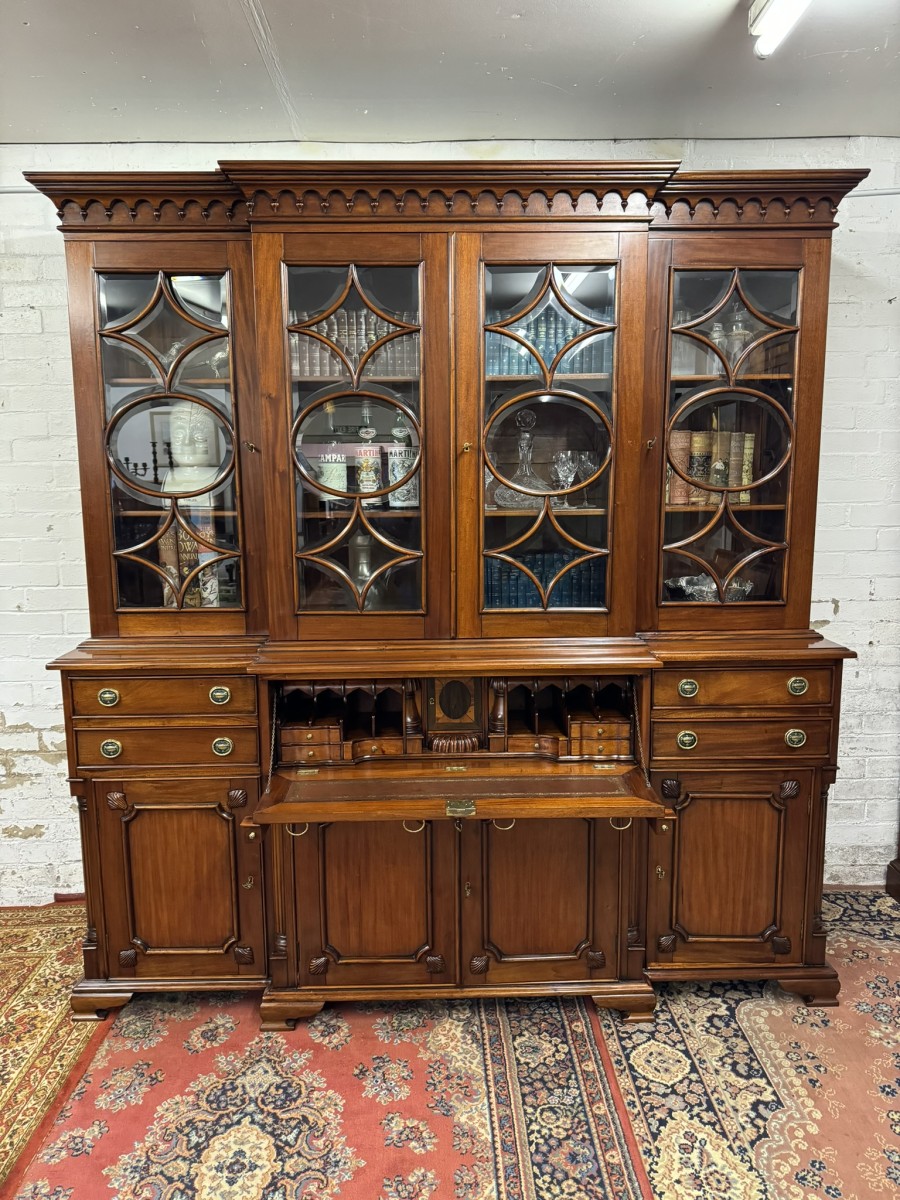 Made in outstanding quality mahogany and in excellent condition. The oversailing top has carved decoration, below are four lockable glazed doors, the central pair of doors are brakefront in design. The doors have stylish wood barring decoration and bevelled glass, a sure sign of quality. The two central lockable dummy drawers drop down and sit on retractable rests, when open it reveals a fabulous secretaire interior consisting of pigeonholes, drawers and a central lockable cupboard door, there are also secret compartments. The interior of the fall has a tooled leather surface. Below are a pair of lockable cupboard doors these doors open to reveal a removable shelf; the central section is flanked by a pair of drawers, each drawer having a pair of urn decorated brass handles. Below the drawers is a lockable cupboard door, the doors open to reveal a removable shelf. Four fabulous reeded columns this exquisite secretaire bookcase stands on six bracket feet. A truly spectacular bookcase.