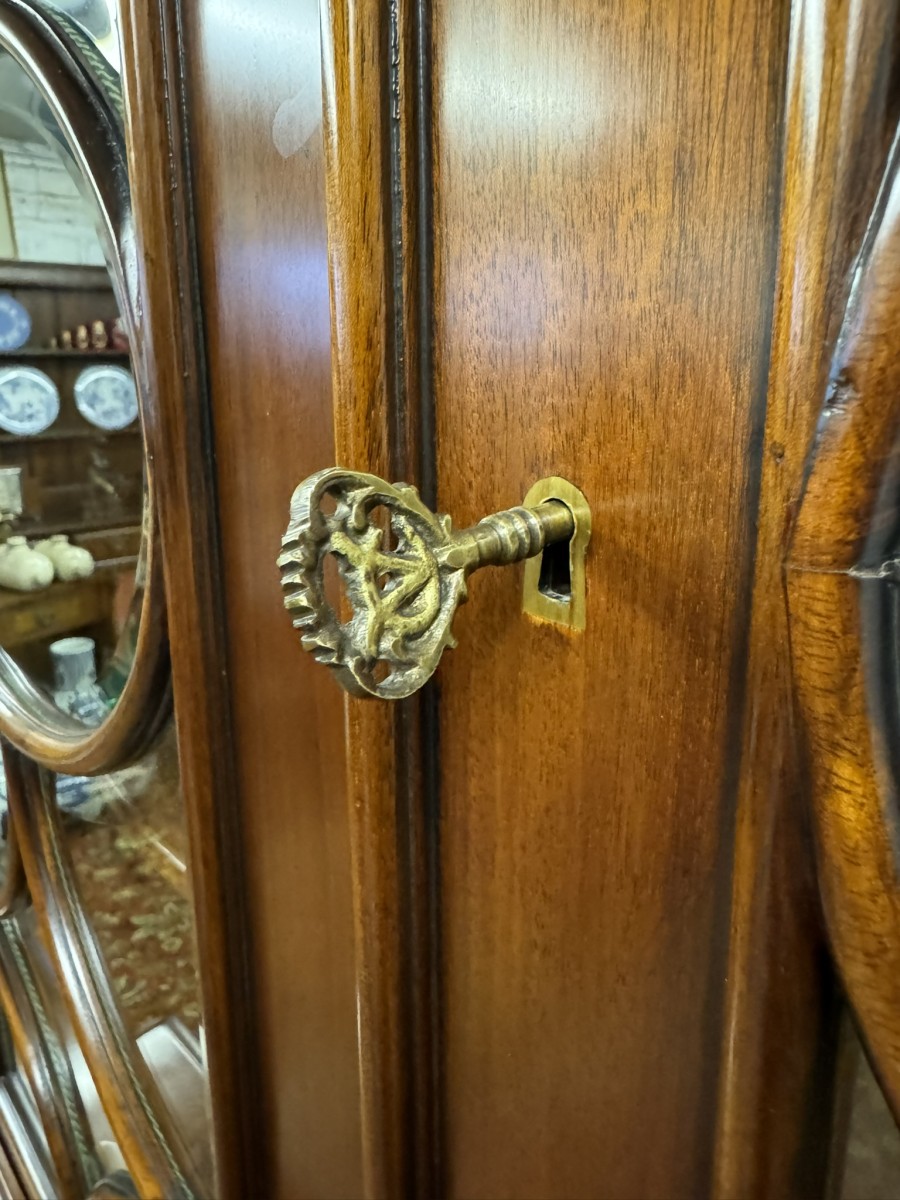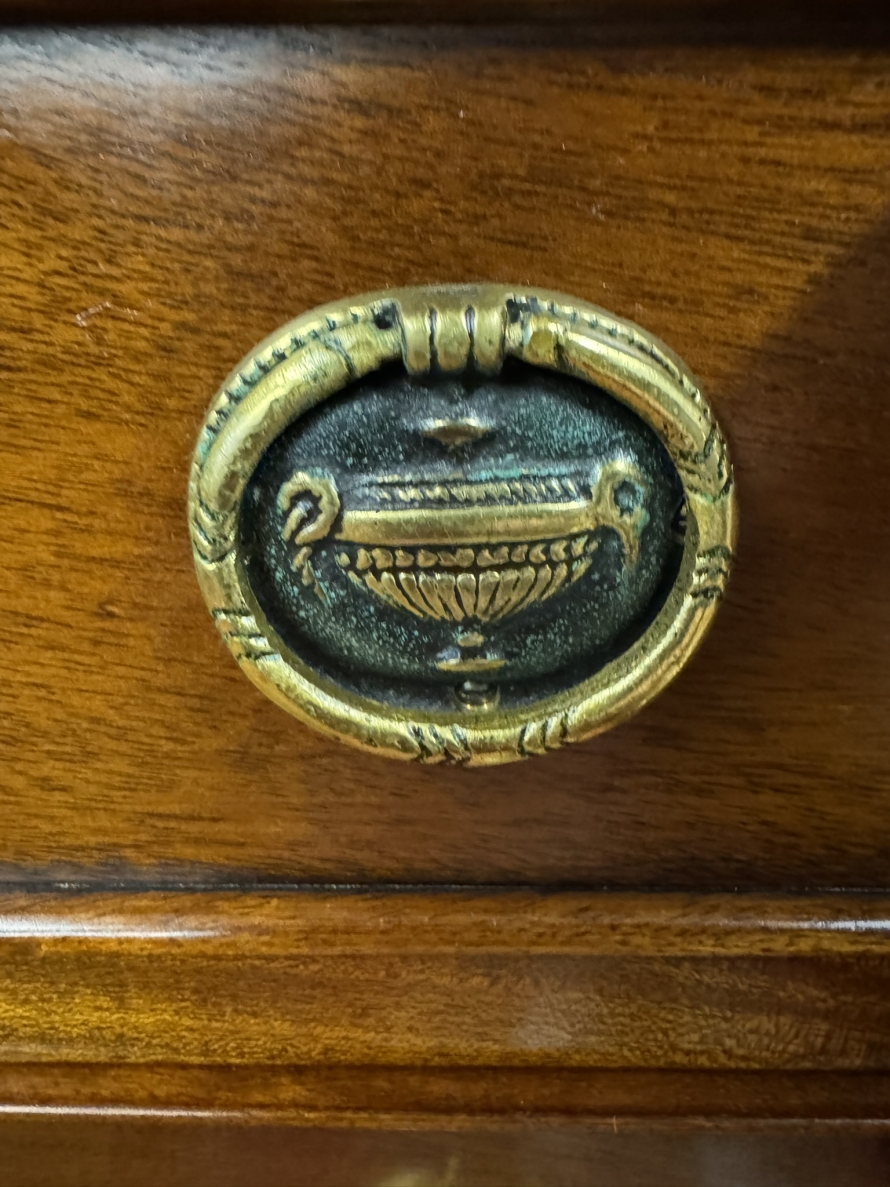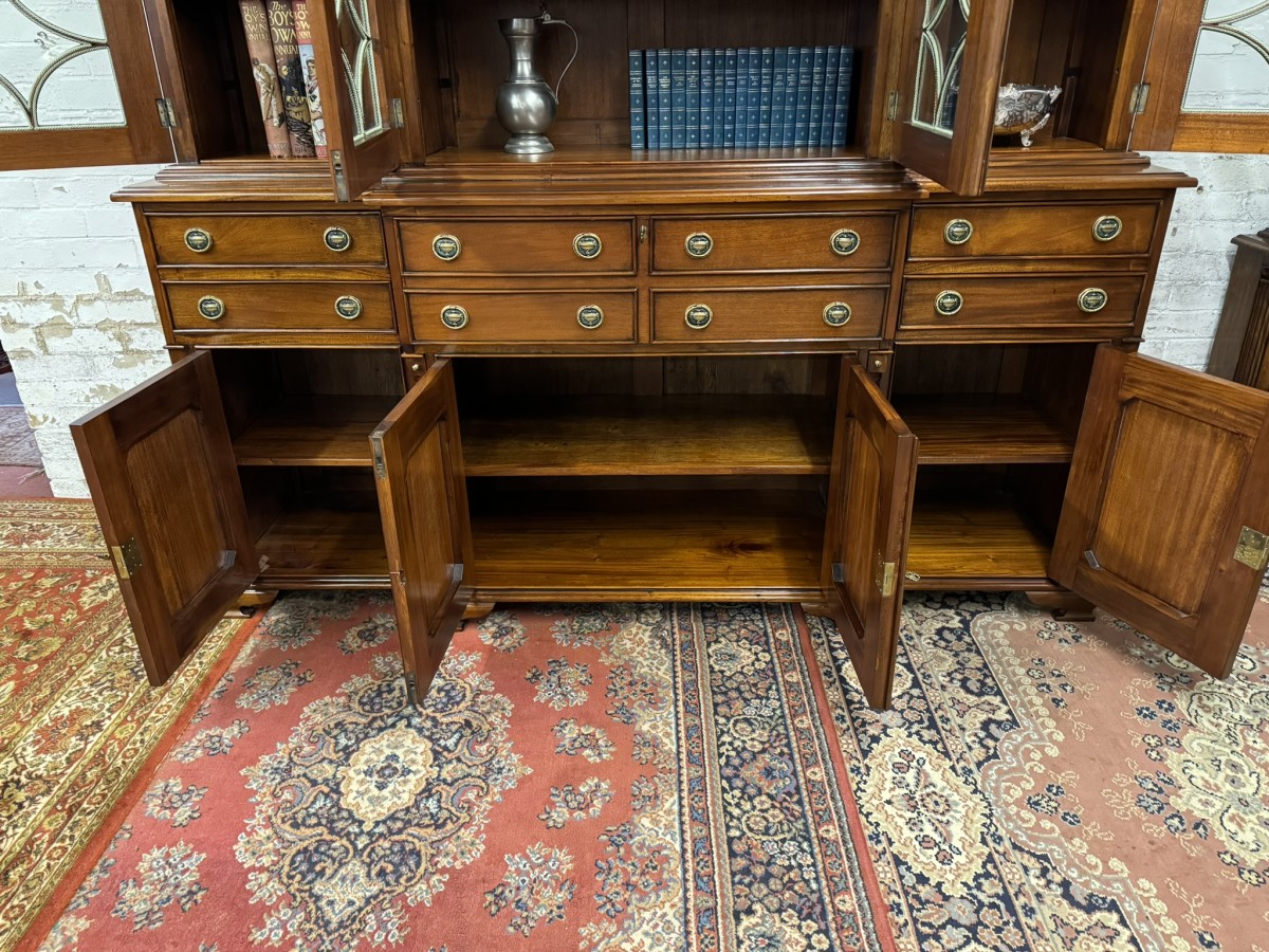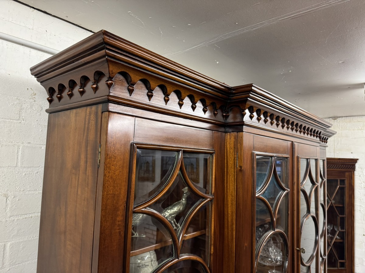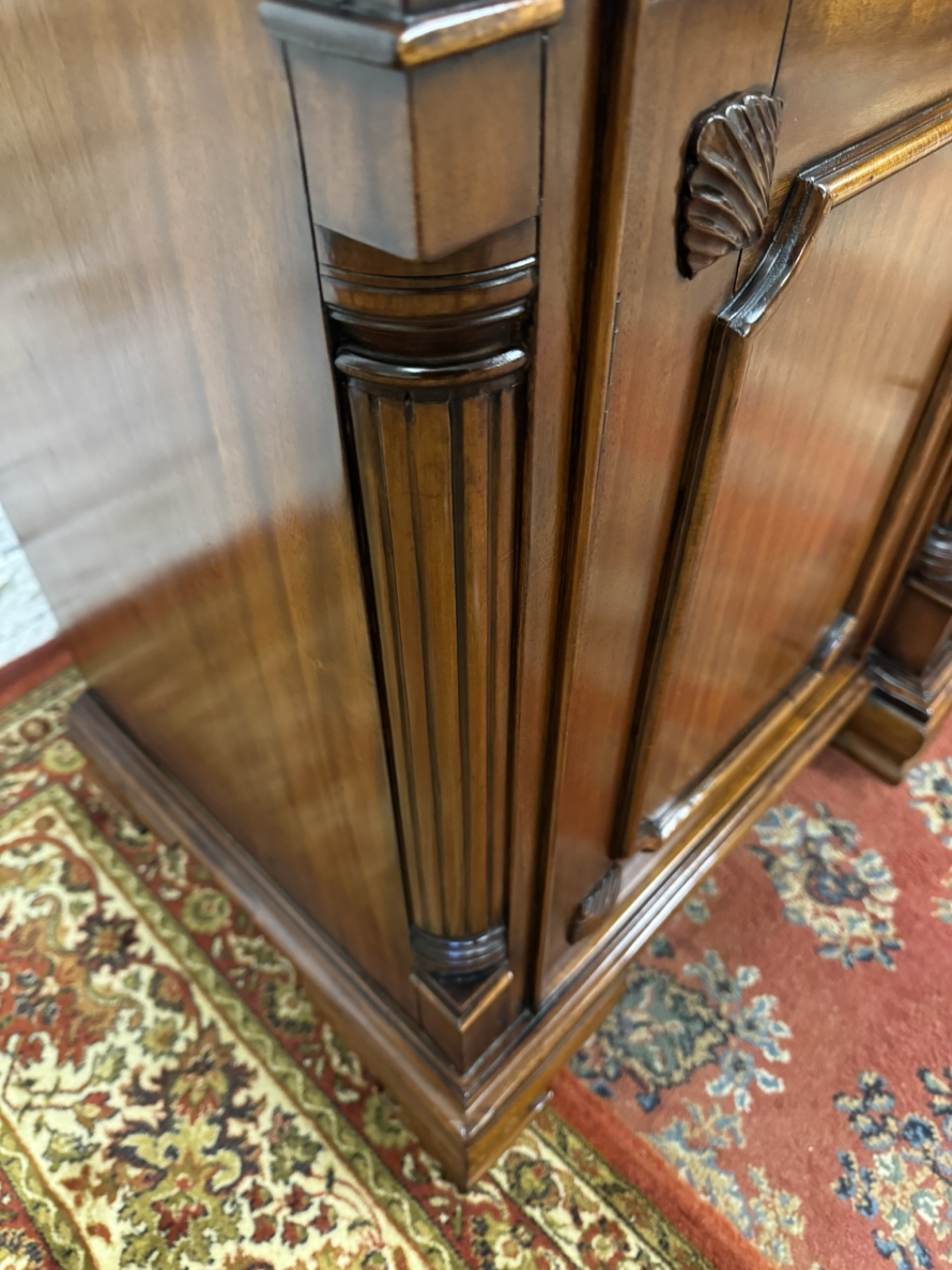 Made in outstanding quality mahogany and in excellent condition. The oversailing top has carved decoration, below are four lockable glazed doors, the central pair of doors are brakefront in design. The doors have stylish wood barring decoration and bevelled glass, a sure sign of quality. The two central lockable dummy drawers drop down and sit on retractable rests, when open it reveals a fabulous secretaire interior consisting of pigeonholes, drawers and a central lockable cupboard door, there are also secret compartments. The interior of the fall has a tooled leather surface. Below are a pair of lockable cupboard doors these doors open to reveal a removable shelf; the central section is flanked by a pair of drawers, each drawer having a pair of urn decorated brass handles. Below the drawers is a lockable cupboard door, the doors open to reveal a removable shelf. Four fabulous reeded columns this exquisite secretaire bookcase stands on six bracket feet. A truly spectacular bookcase.