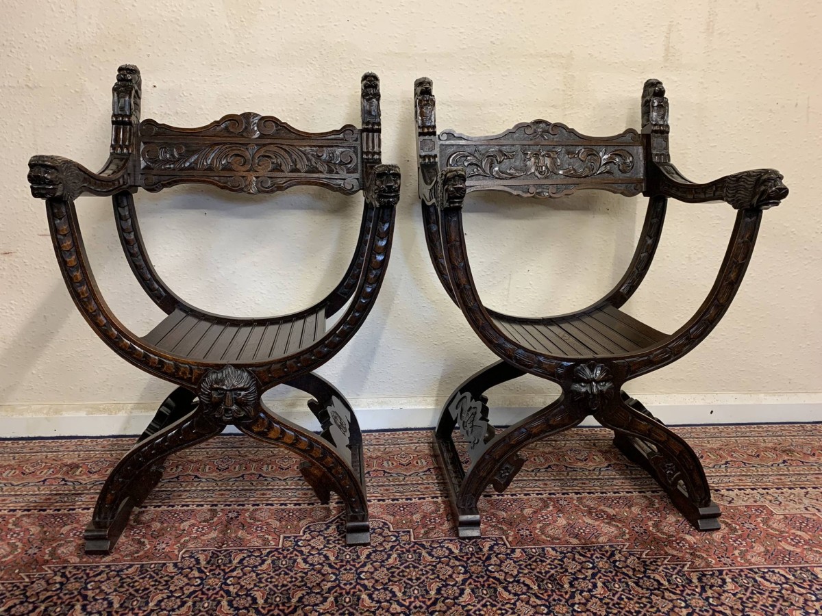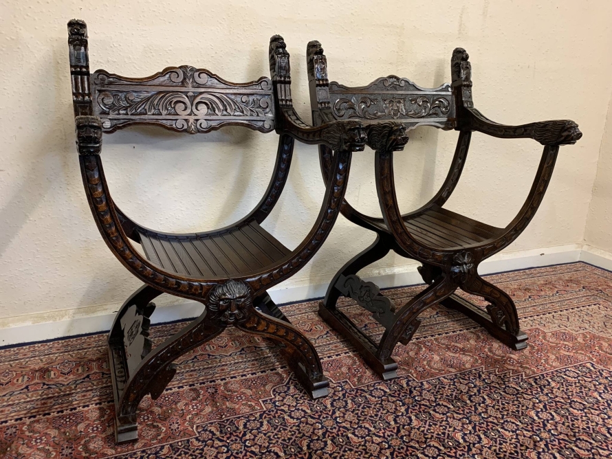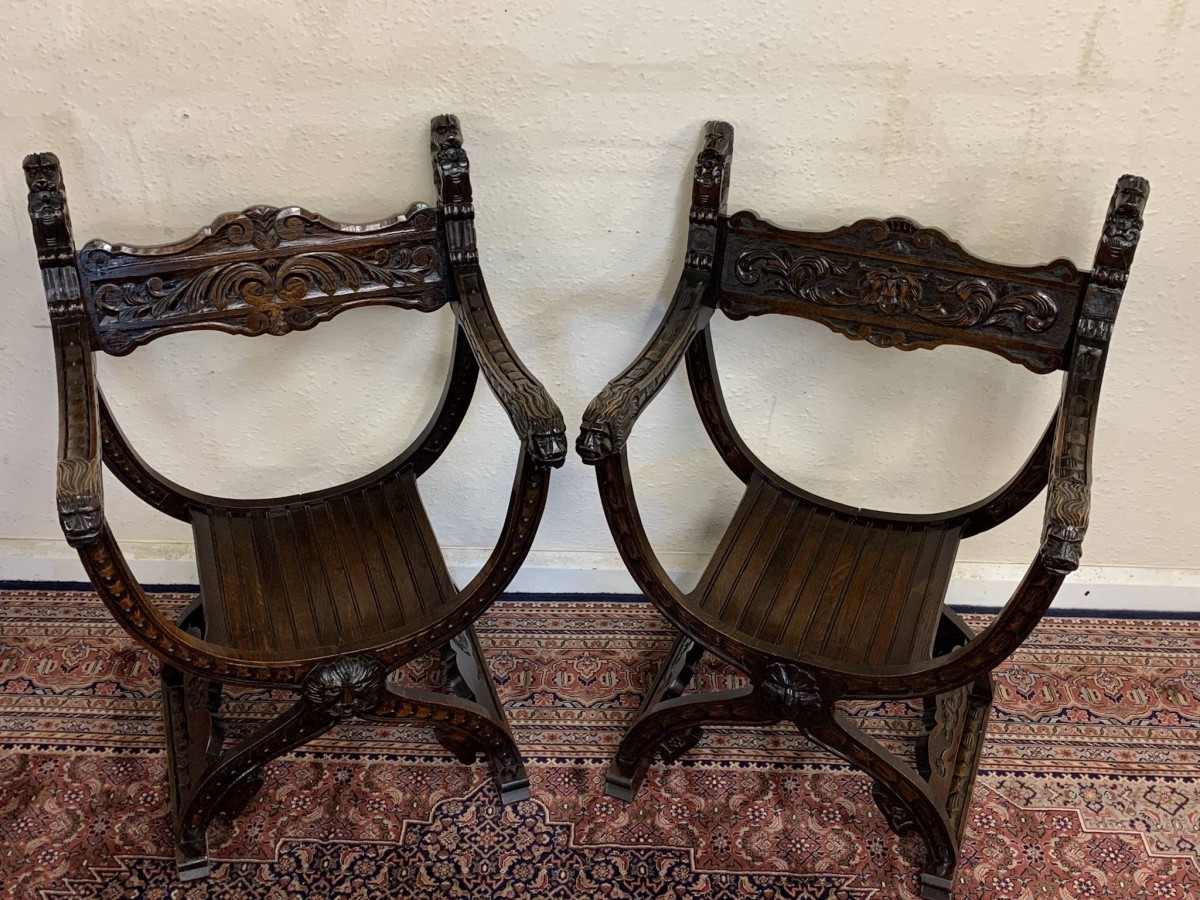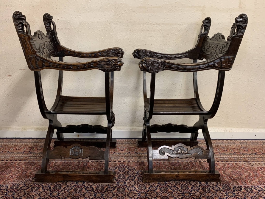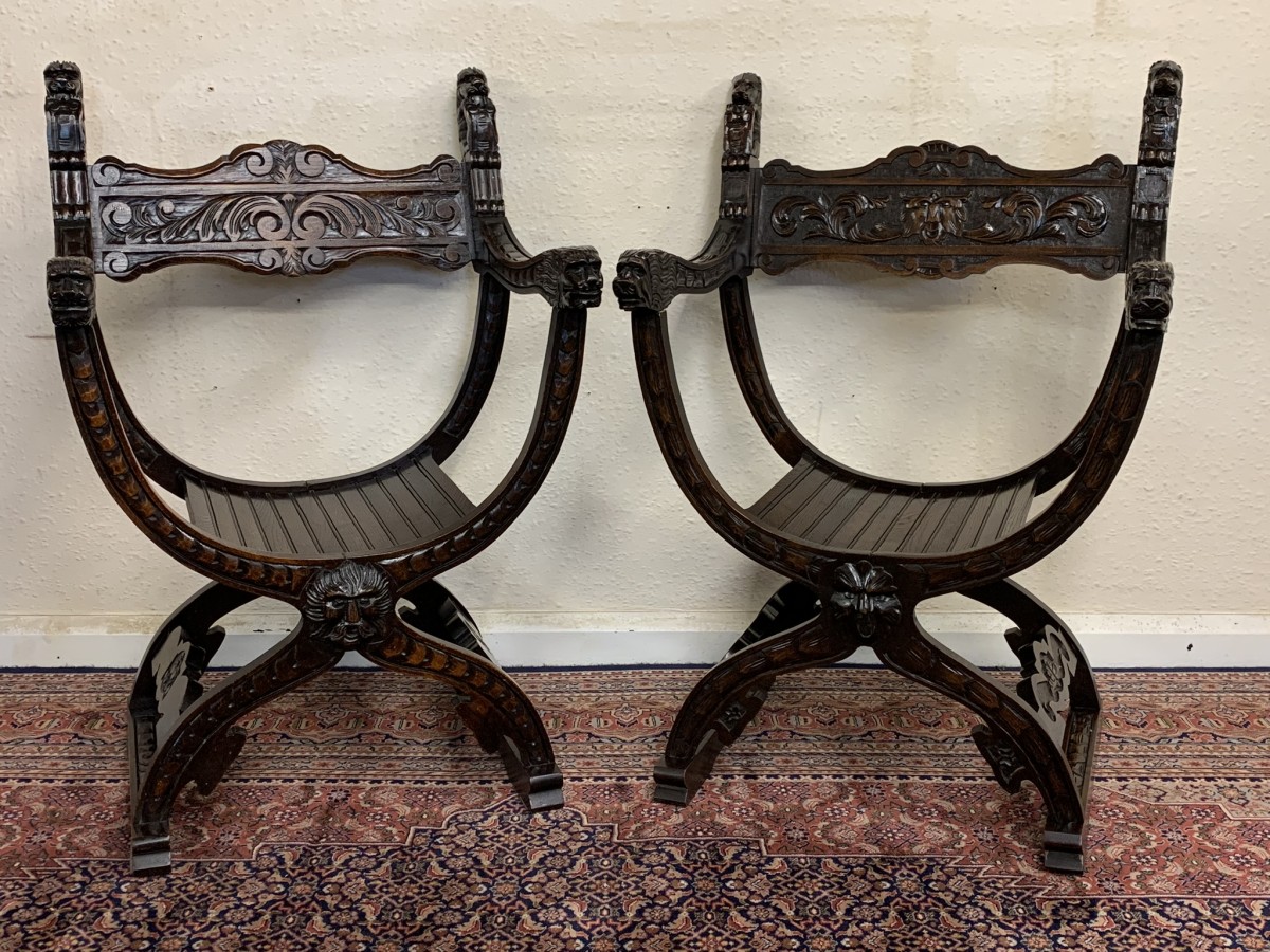 What a fabulous pair of antique French Dagobert chairs. The infamous Dagobert chair originated from the bronze throne of King Dagobert 1st. Beautifully crafted in oak and carved throughout. The chairs are a near pair as the carvings slightly differ as do the measurements.