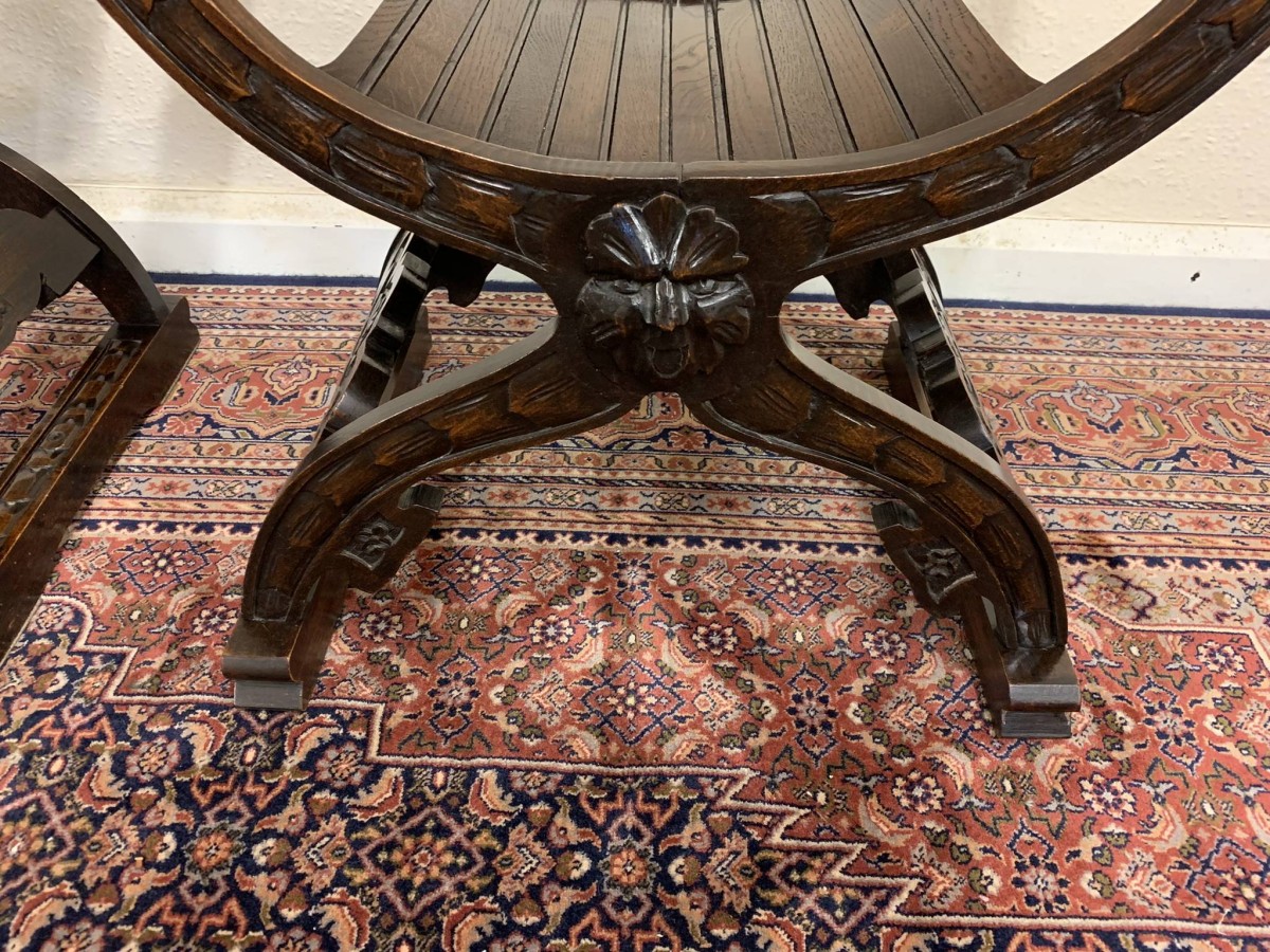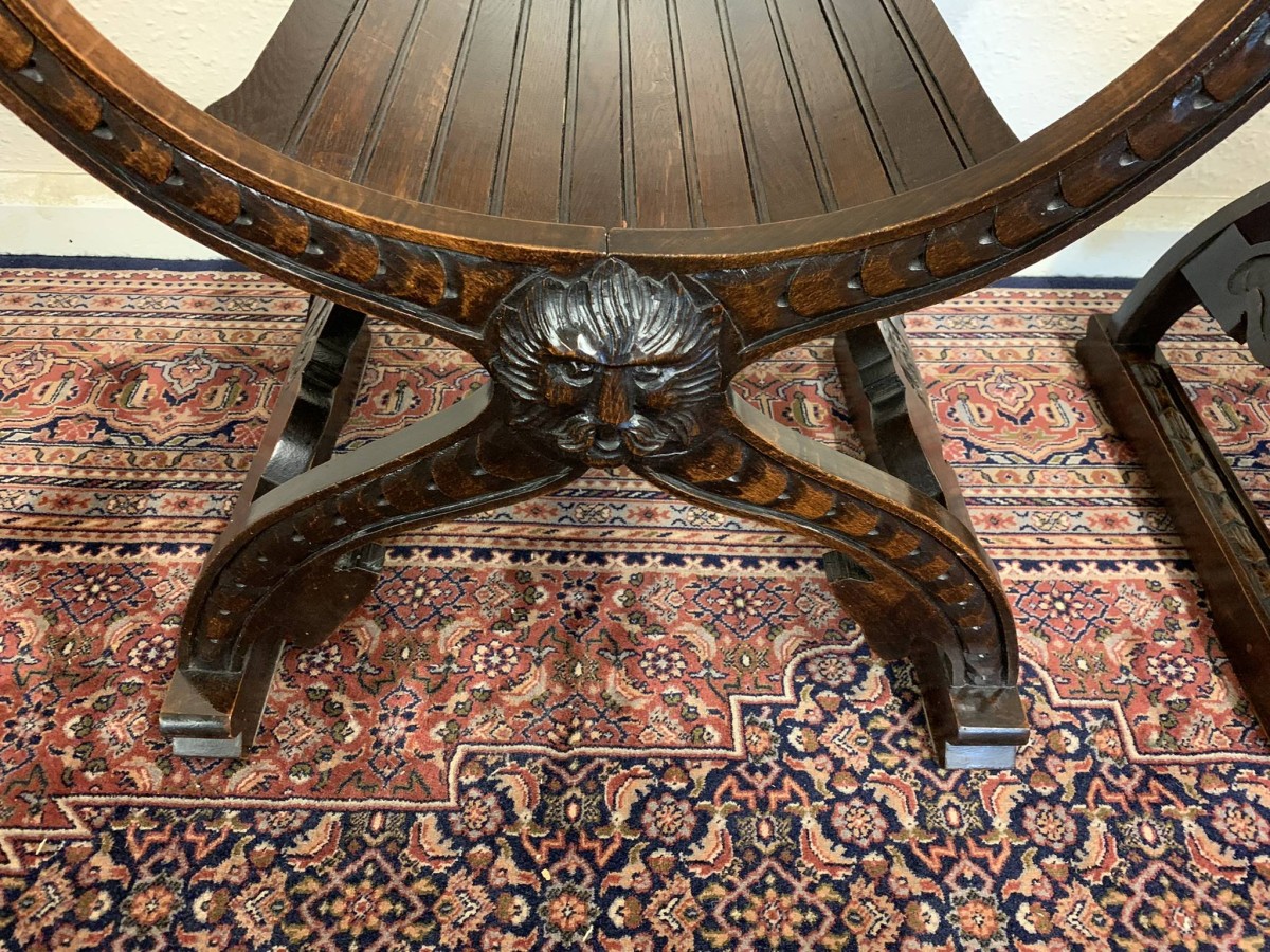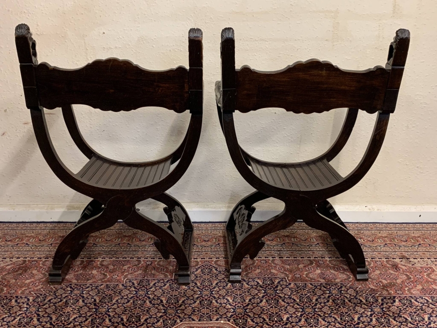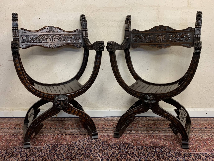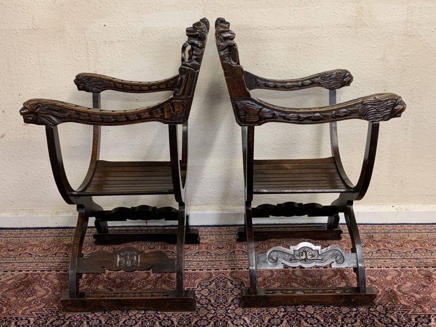 What a fabulous pair of antique French Dagobert chairs. The infamous Dagobert chair originated from the bronze throne of King Dagobert 1st. Beautifully crafted in oak and carved throughout. The chairs are a near pair as the carvings slightly differ as do the measurements.