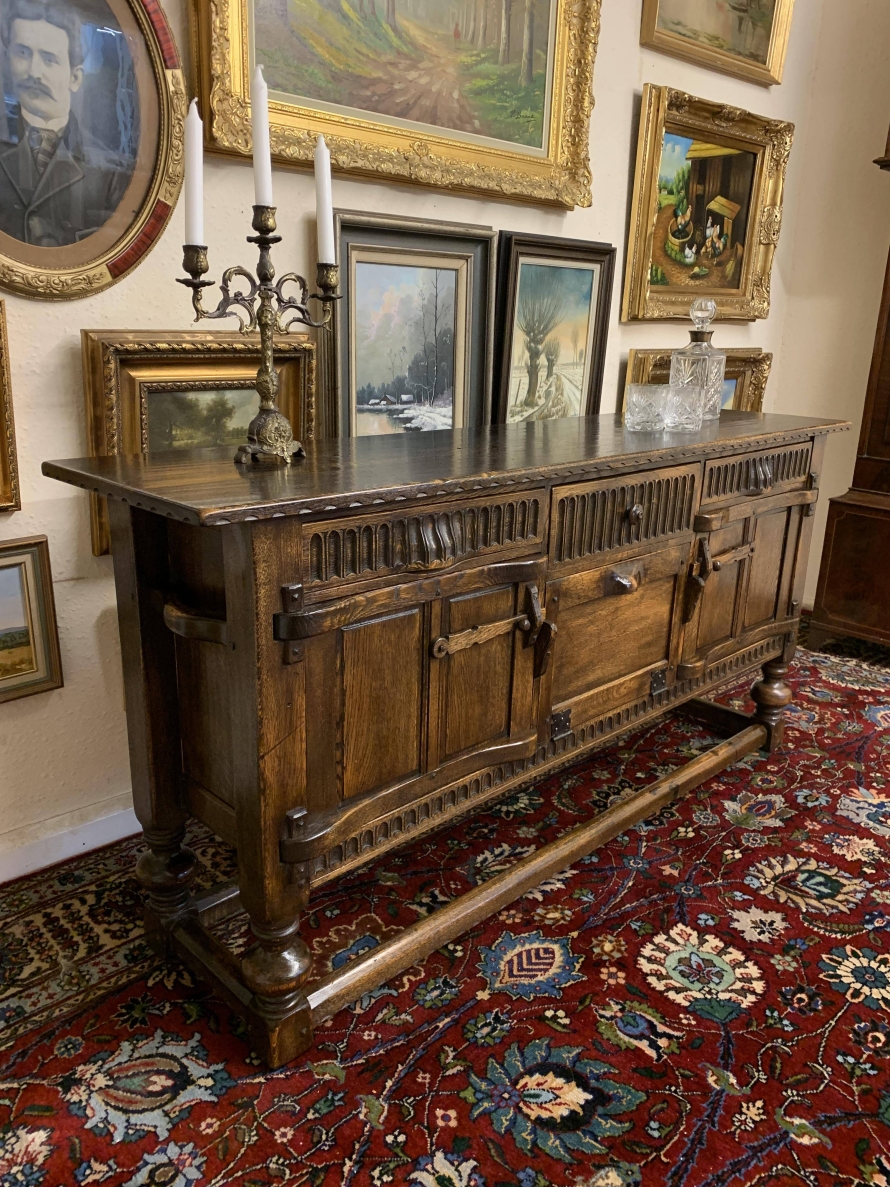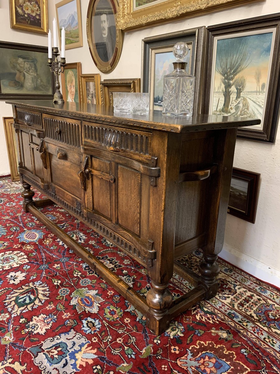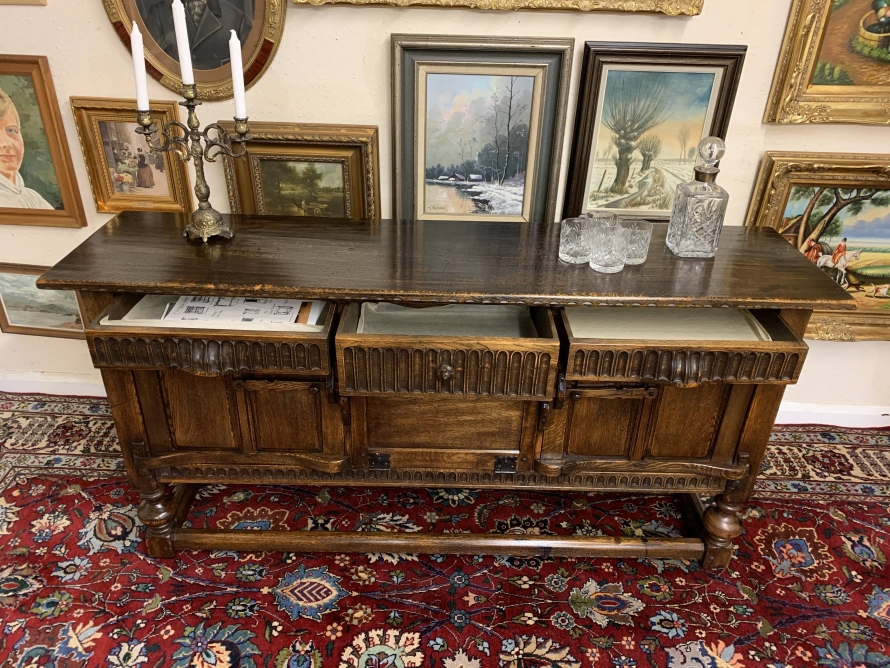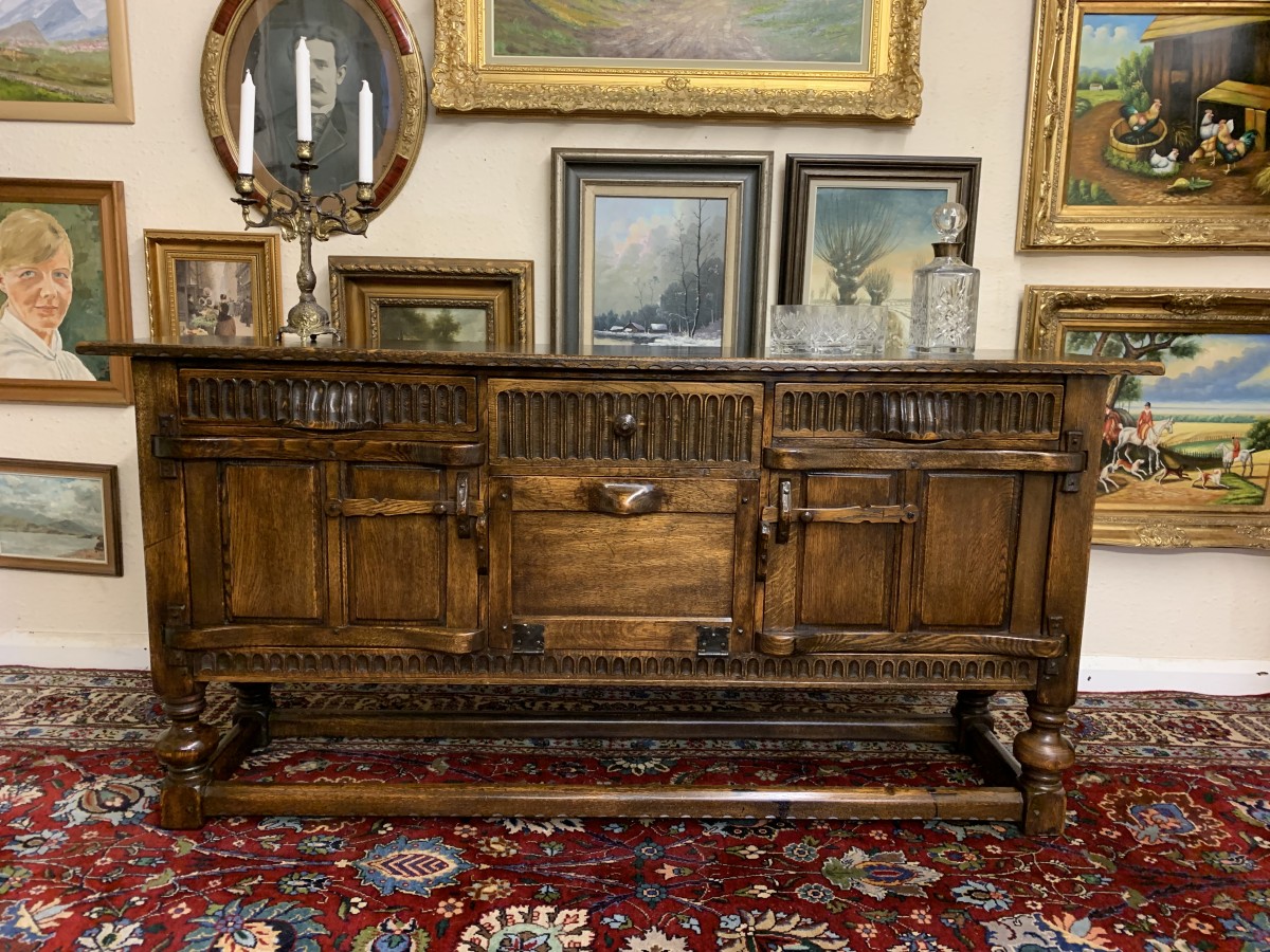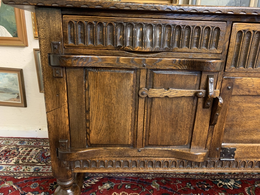 This outstanding quality solid stressed oak dresser was made by the Nigel Rupert Griffiths furniture makers. All their items are individually crafted with hand cut dovetails and also polished by hand. The oversailing top has a carved edging. Below are three drawers, each drawer with the trademark eyebrow handle. Below the central drawer is a pulldown cupboard which is flanked by two fielded panelled cupboard doors. Each door having a locking latch. The doors open to reveal a removable shelf. Standing on four turned legs with shaped stretcher supports. Fabulous.