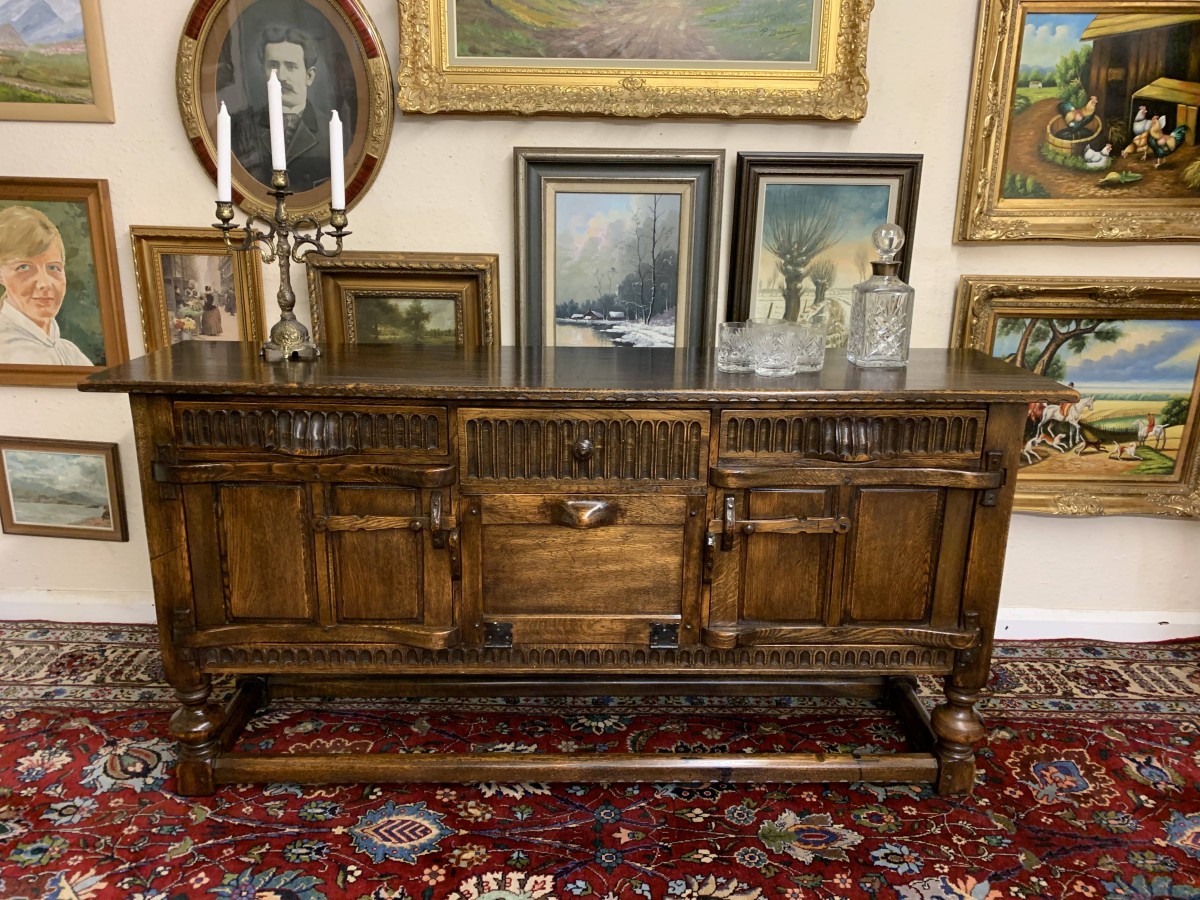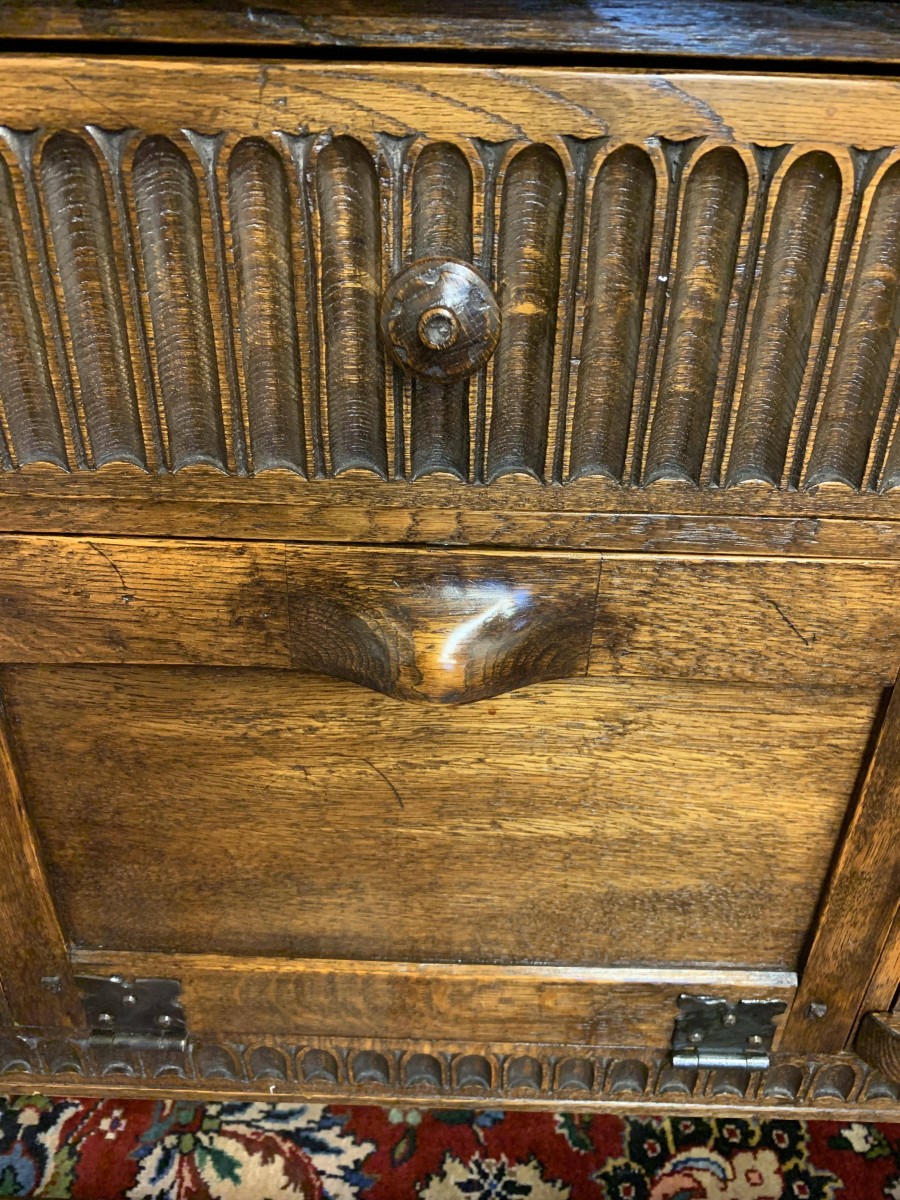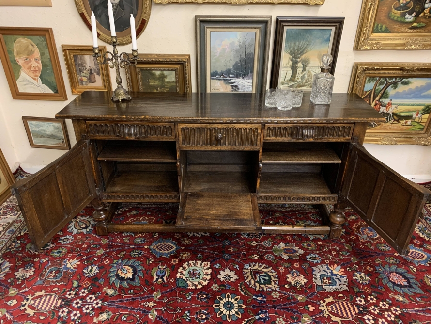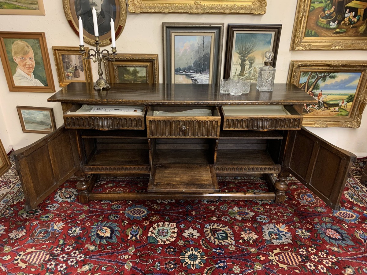 This outstanding quality solid stressed oak dresser was made by the Nigel Rupert Griffiths furniture makers. All their items are individually crafted with hand cut dovetails and also polished by hand. The oversailing top has a carved edging. Below are three drawers, each drawer with the trademark eyebrow handle. Below the central drawer is a pulldown cupboard which is flanked by two fielded panelled cupboard doors. Each door having a locking latch. The doors open to reveal a removable shelf. Standing on four turned legs with shaped stretcher supports. Fabulous.