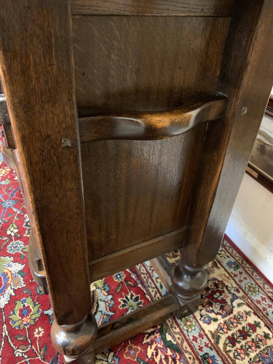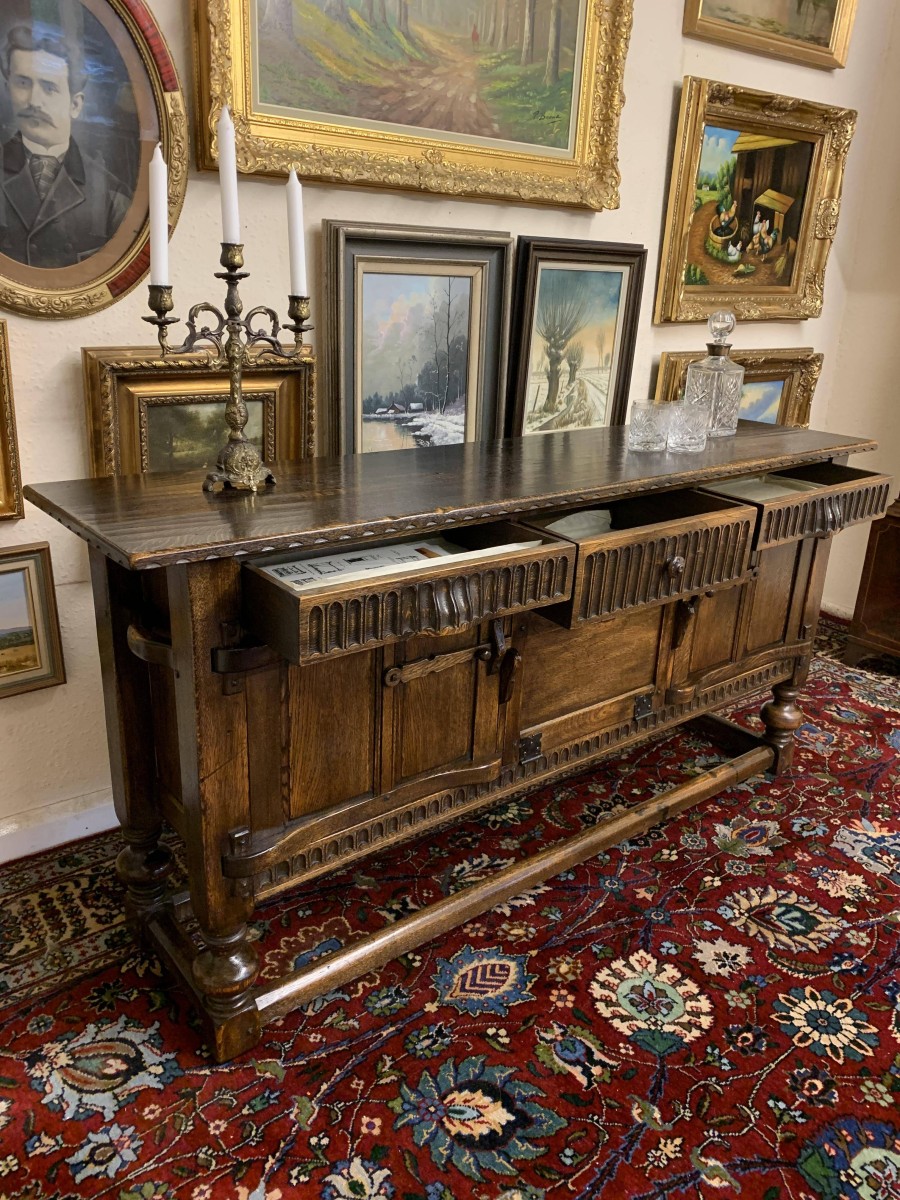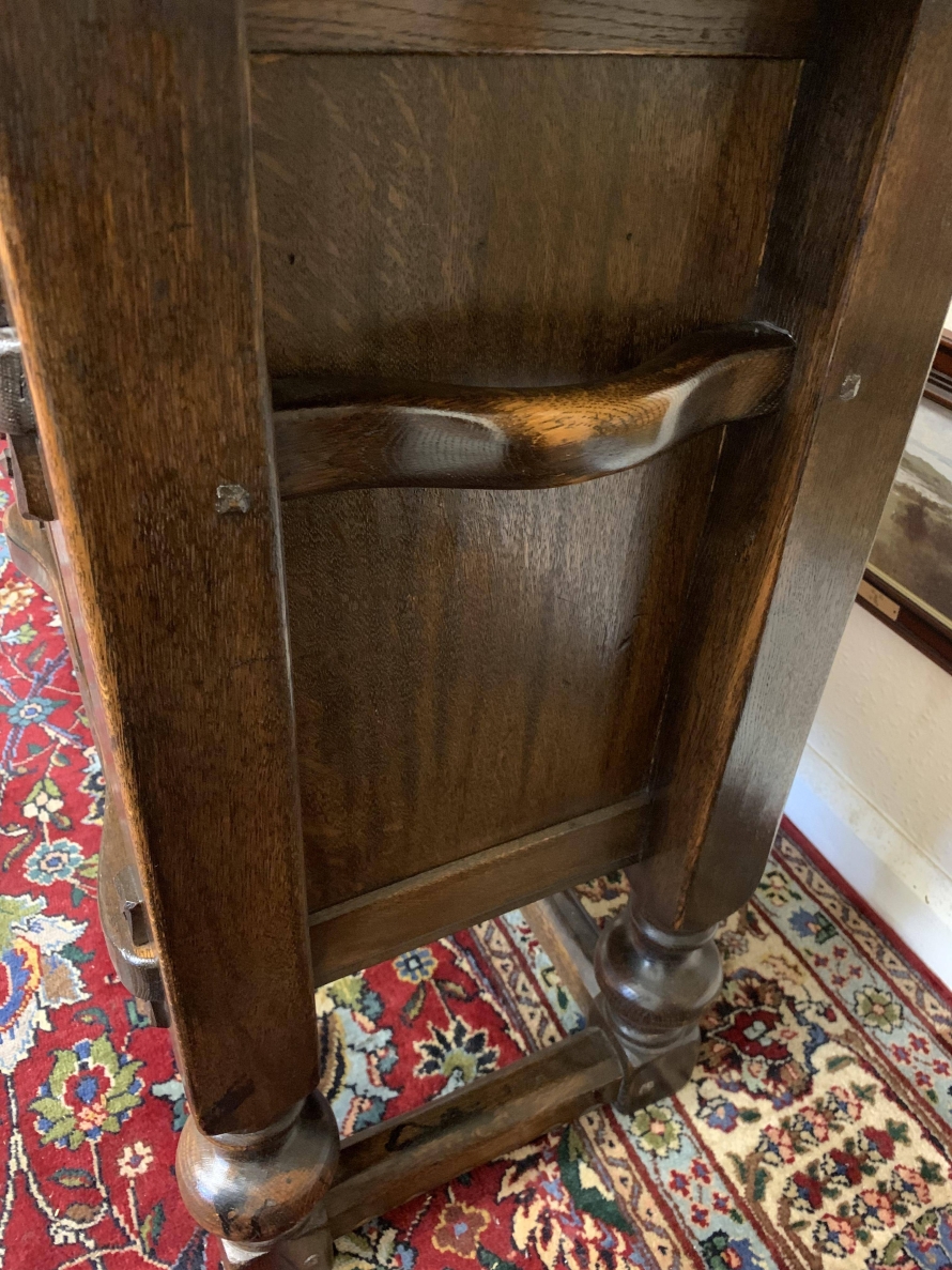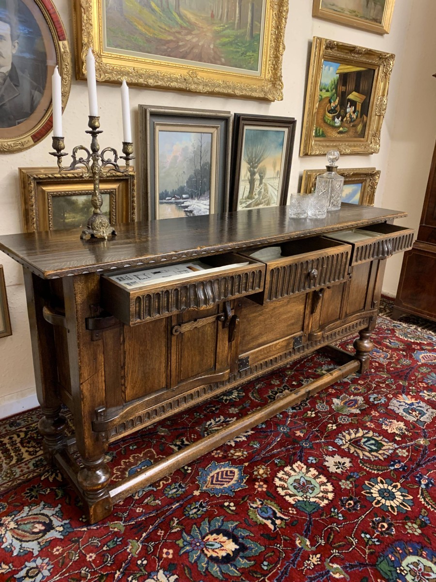 This outstanding quality solid stressed oak dresser was made by the Nigel Rupert Griffiths furniture makers. All their items are individually crafted with hand cut dovetails and also polished by hand. The oversailing top has a carved edging. Below are three drawers, each drawer with the trademark eyebrow handle. Below the central drawer is a pulldown cupboard which is flanked by two fielded panelled cupboard doors. Each door having a locking latch. The doors open to reveal a removable shelf. Standing on four turned legs with shaped stretcher supports. Fabulous.