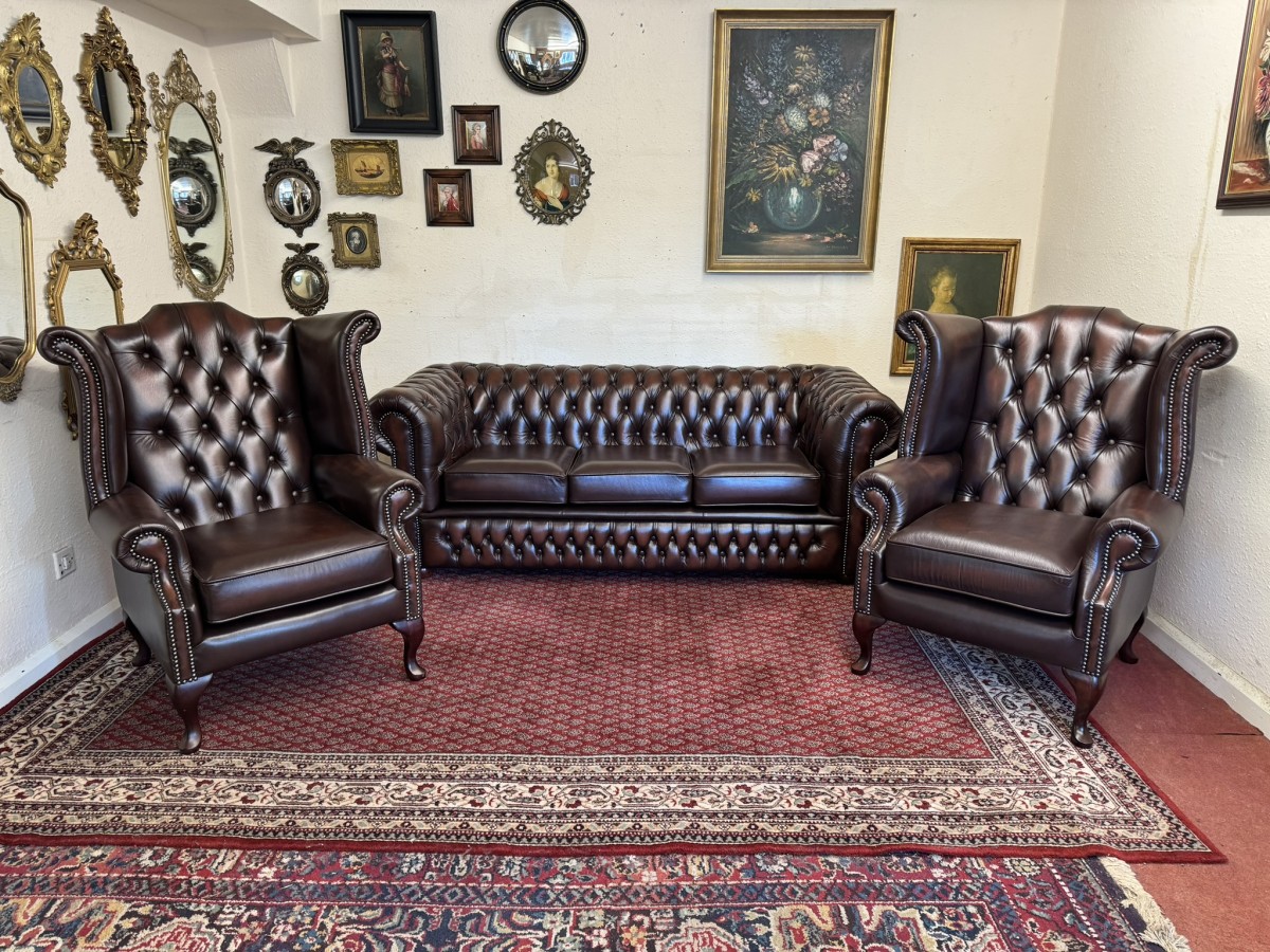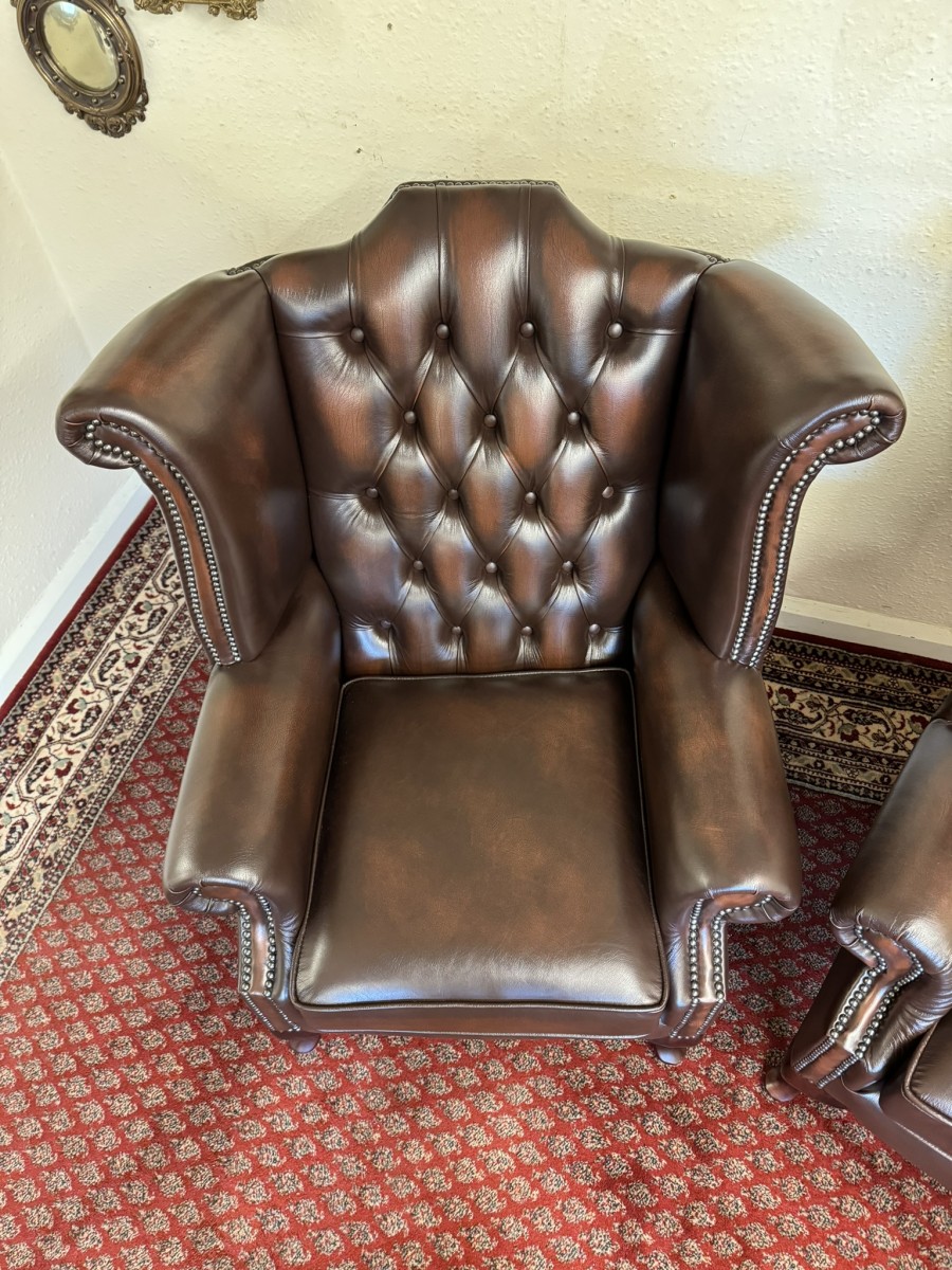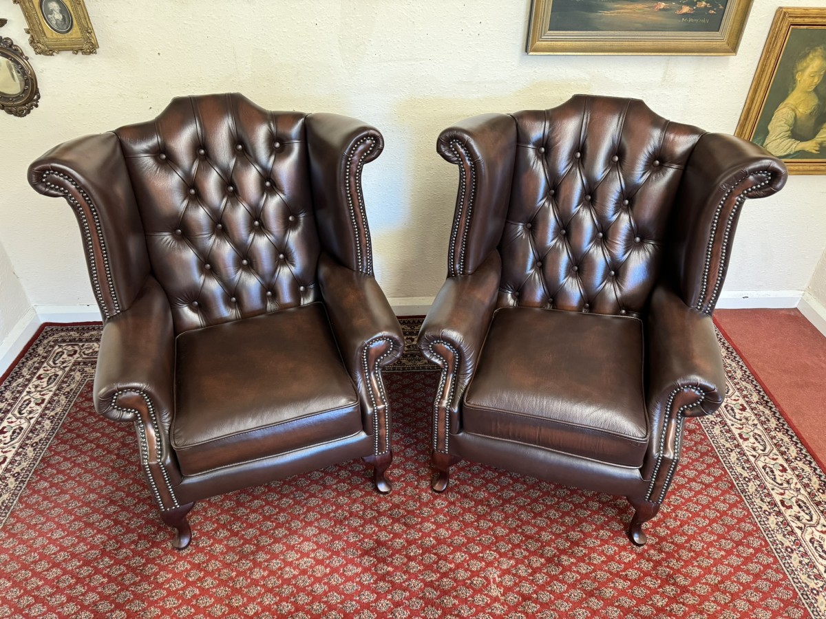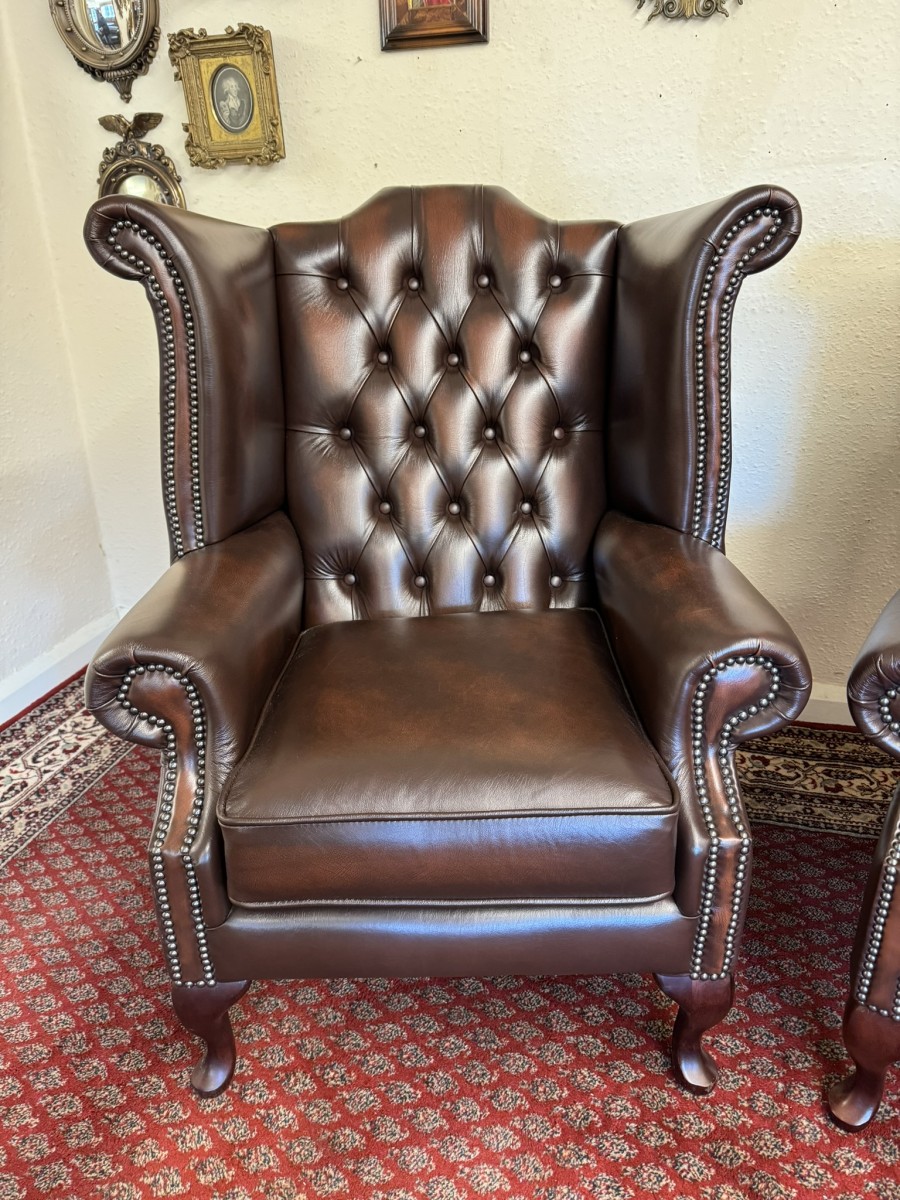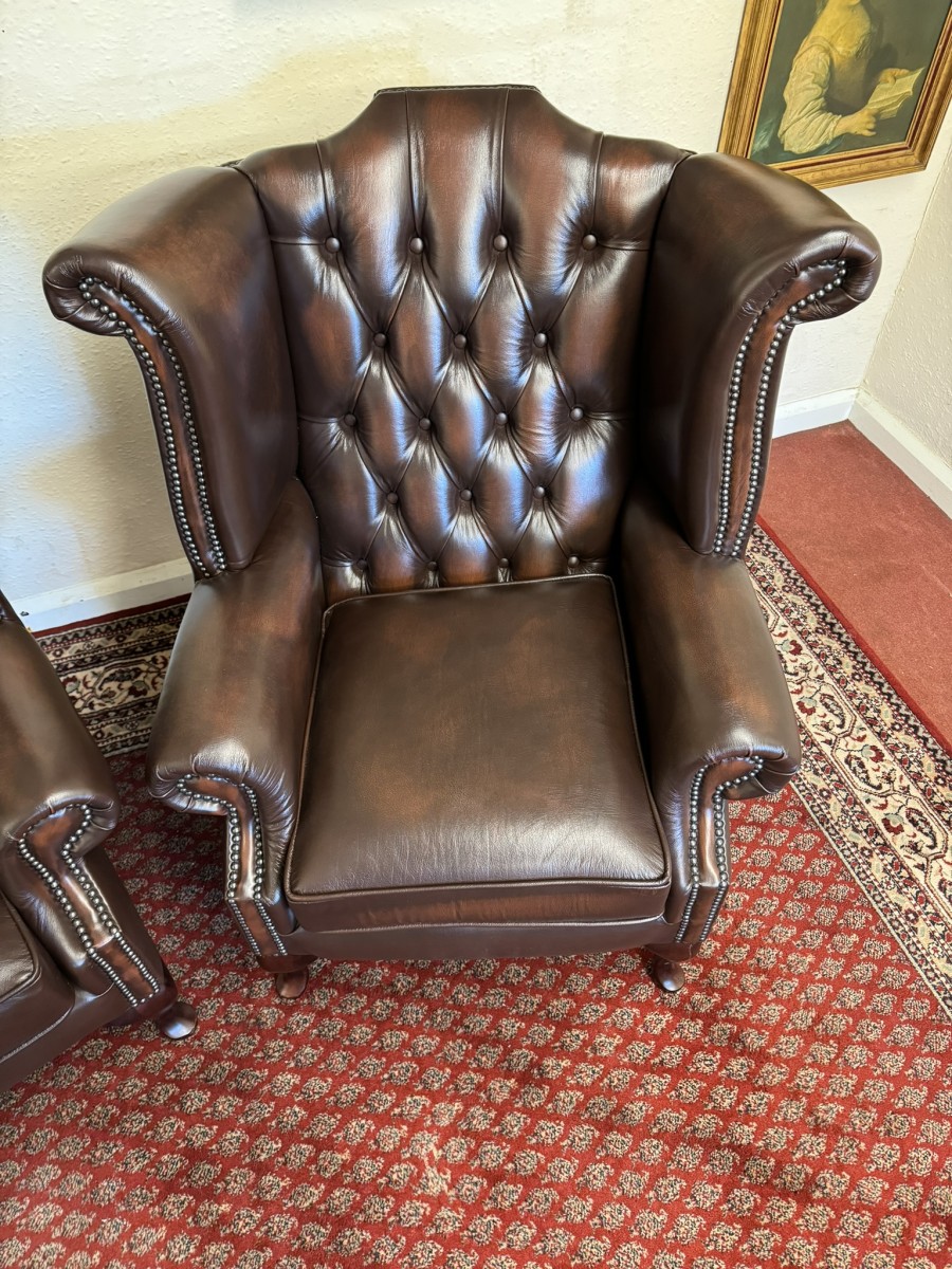 Deep buttoned back, studied wing arms, scroll armrests, removable seat cushion, brass studded decoration to the front and standing on four cabriole shaped legs. Please note we are also listing a matching antique brown leather three seater Chesterfield settee.