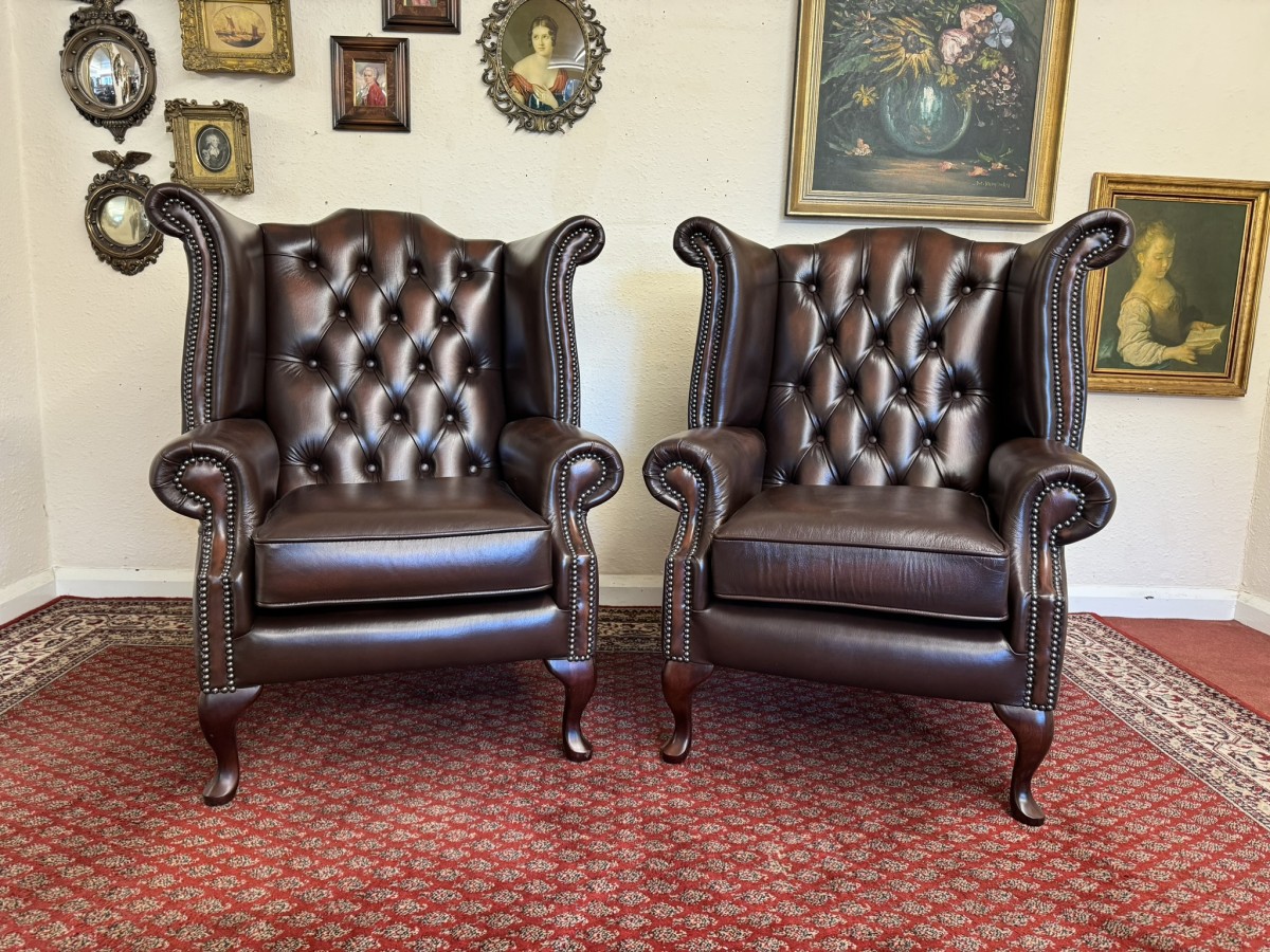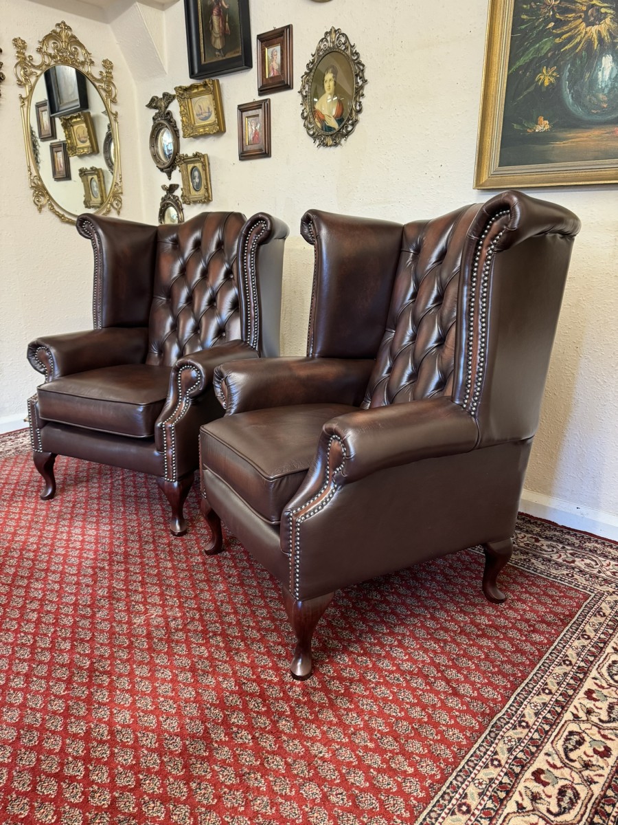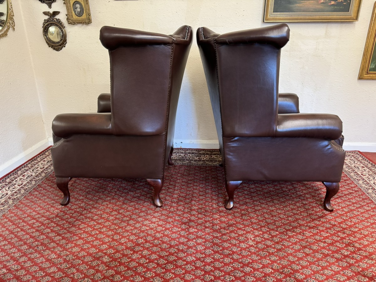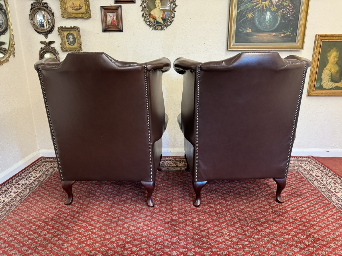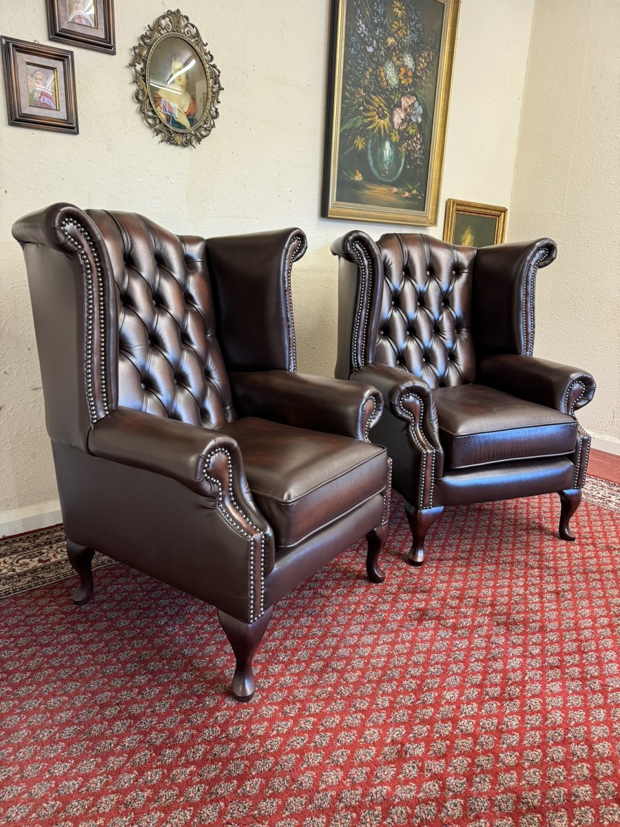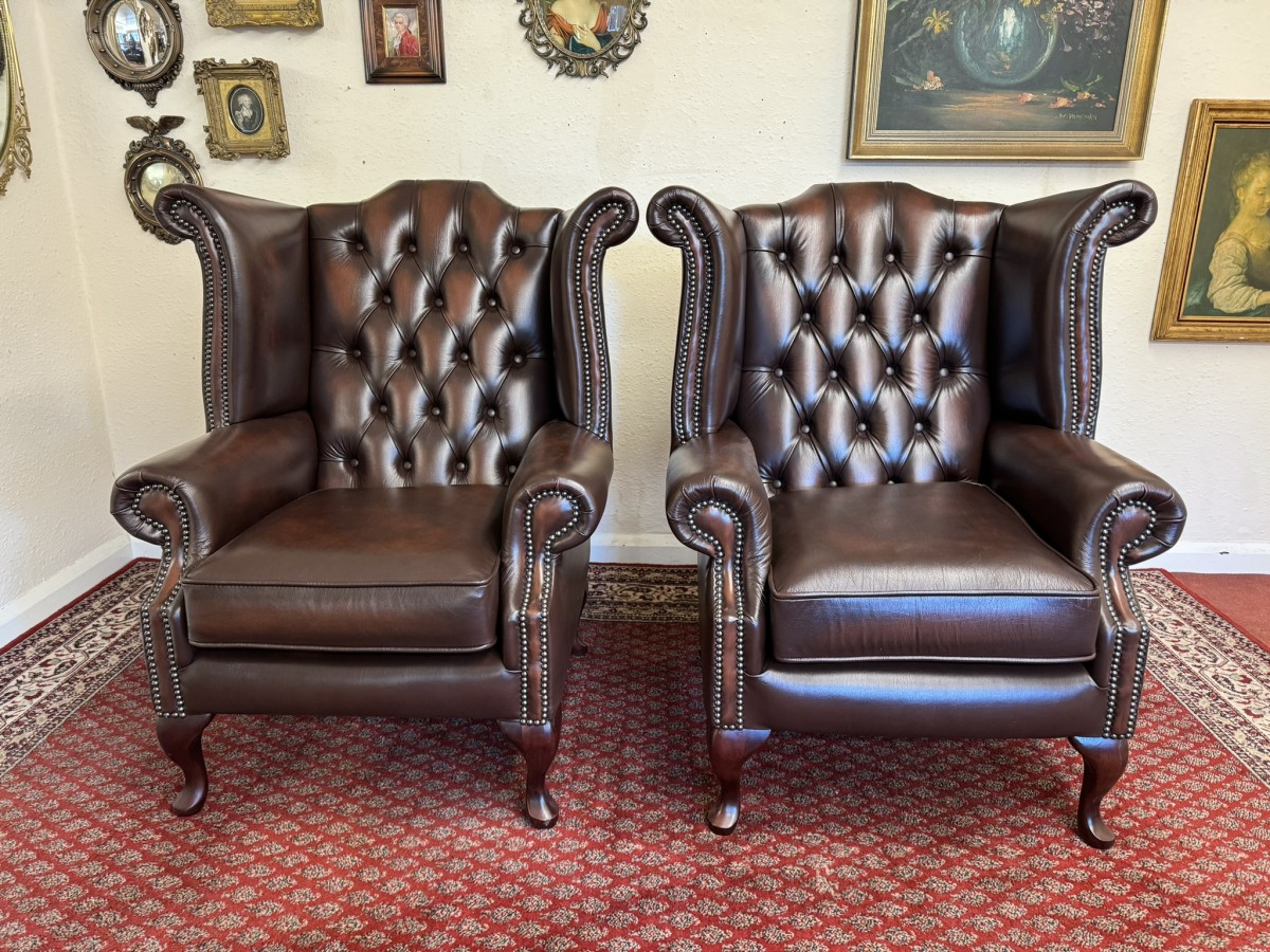 Deep buttoned back, studied wing arms, scroll armrests, removable seat cushion, brass studded decoration to the front and standing on four cabriole shaped legs. Please note we are also listing a matching antique brown leather three seater Chesterfield settee.