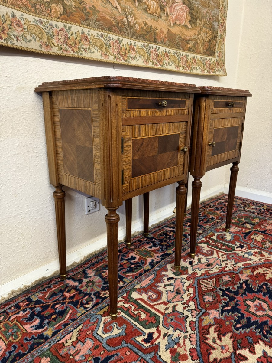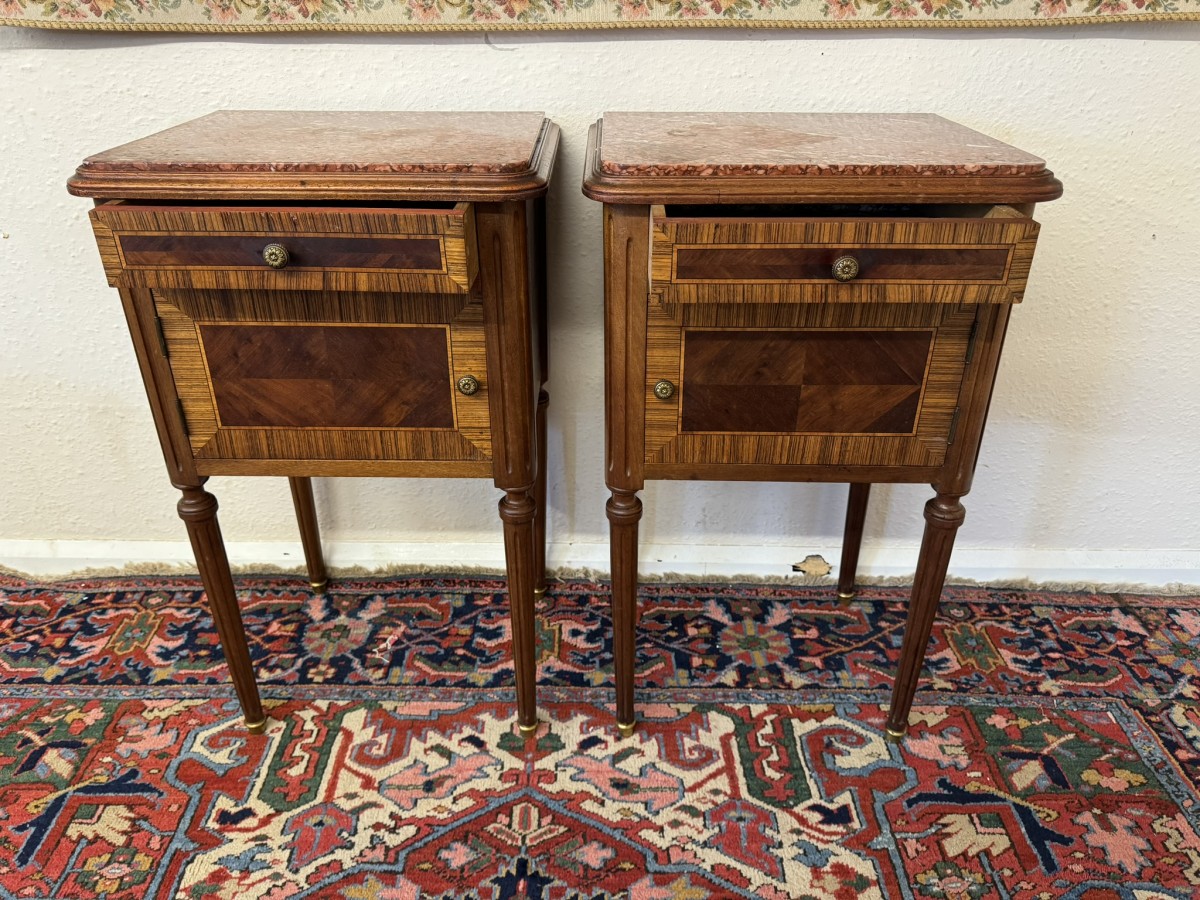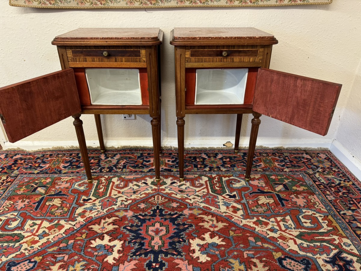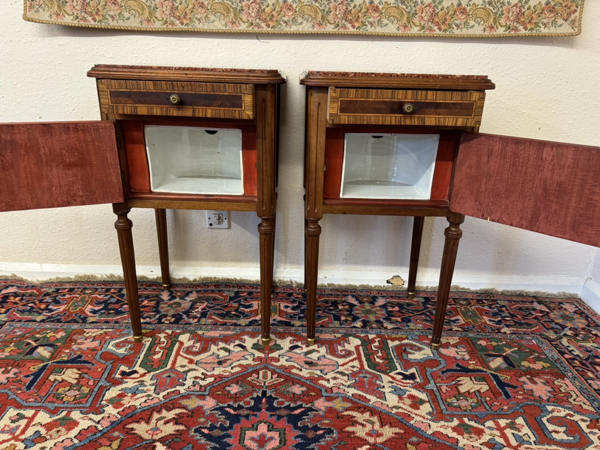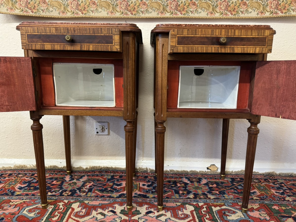These fabulous quality French antique bedside cabinets dates circa 1890. The marble top sits above a drawer, the drawer having an ornate brass handle, below is a fabulous kingwood inlaid cupboard door, the door also having an ornate brass knob handle. The doors open to reveal the original porcelain interiors. Recessed panelled sides standing on four elegant reeded turned legs with brass capped feet.