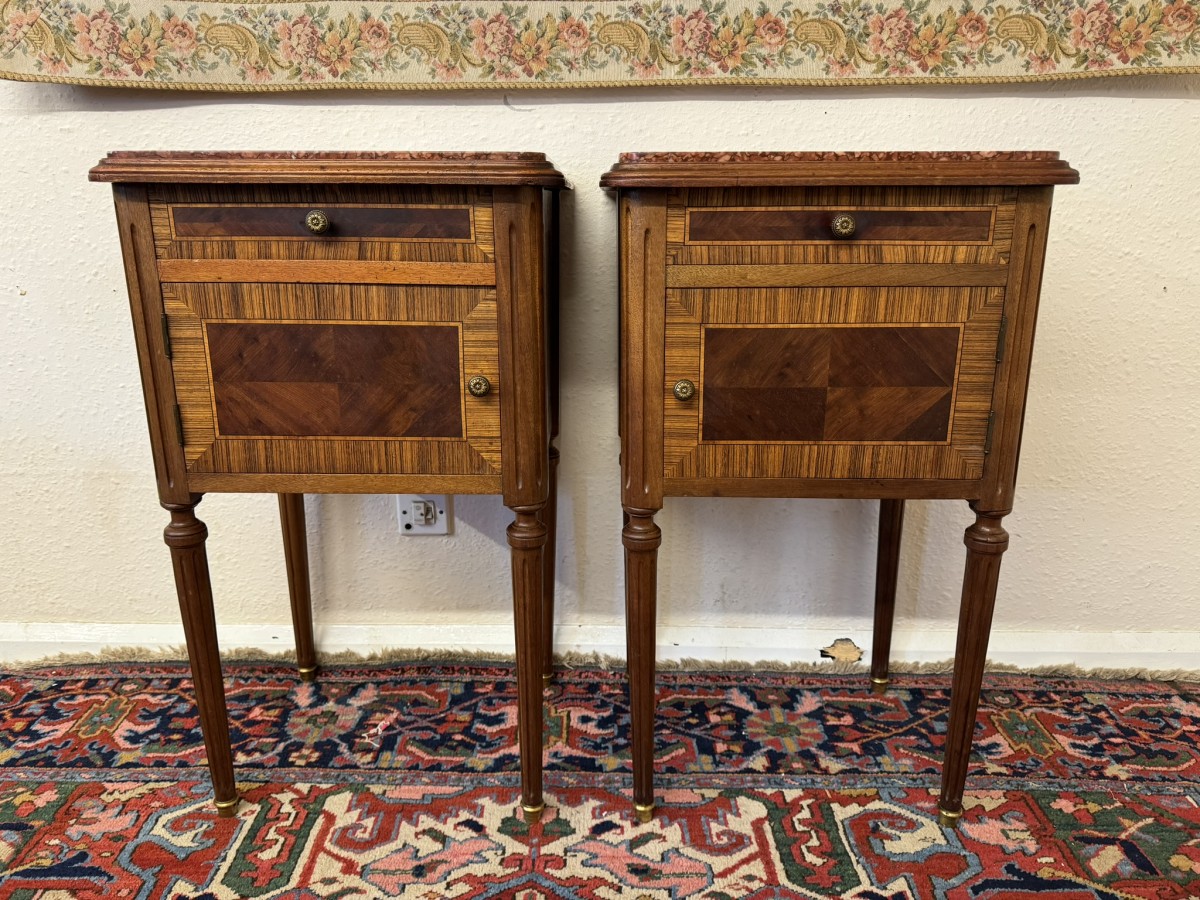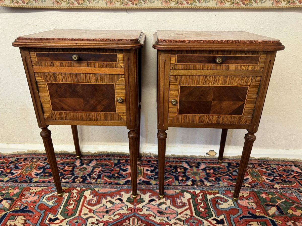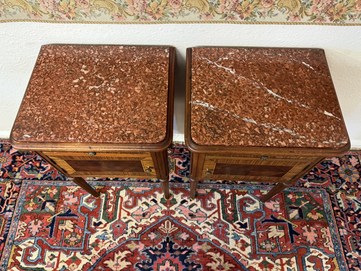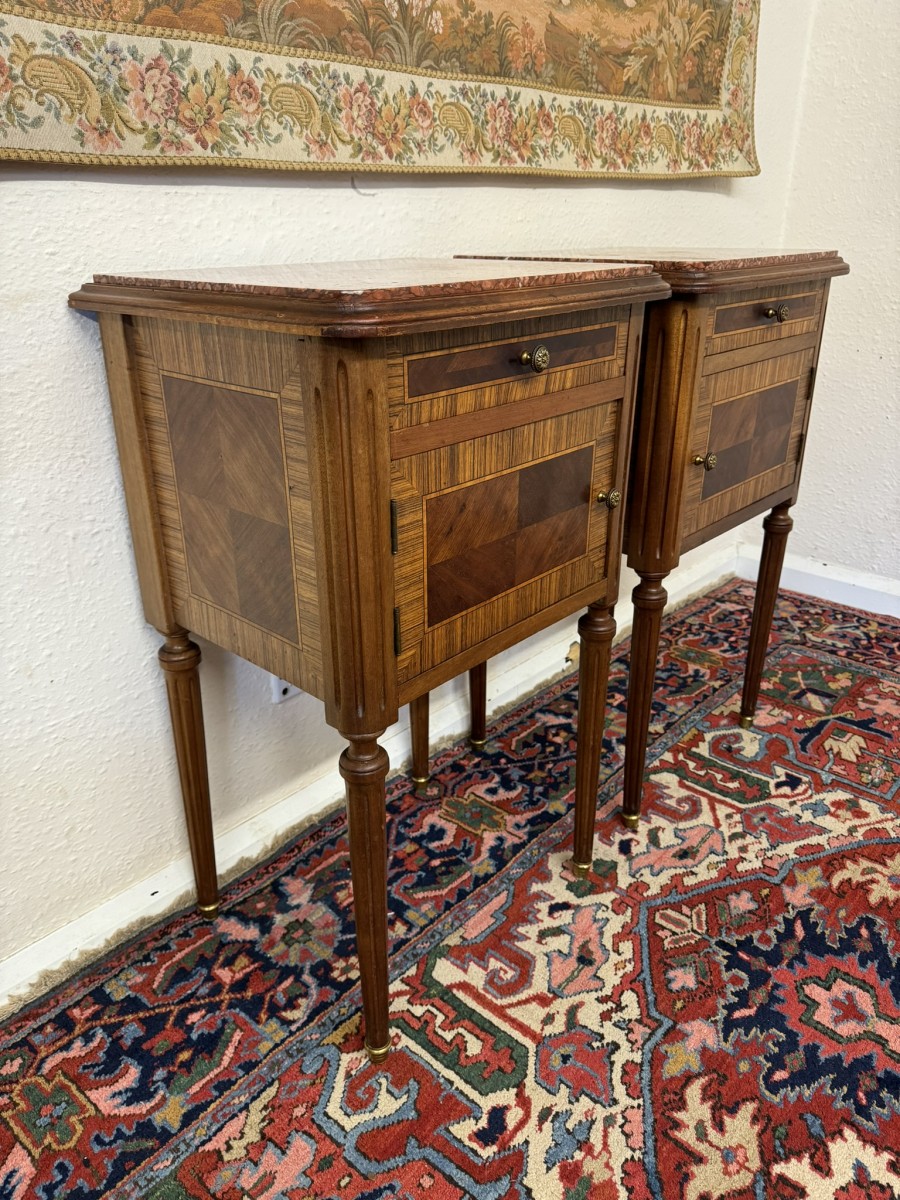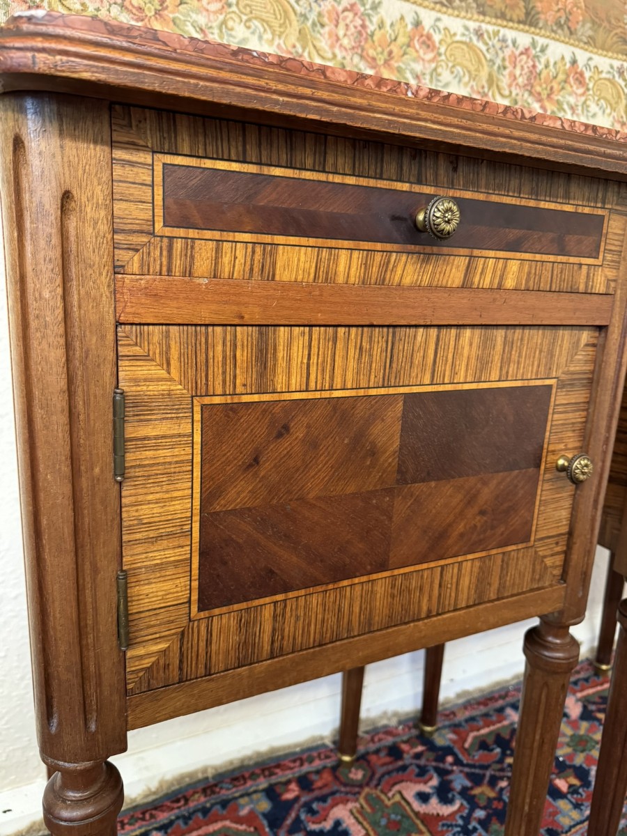 These fabulous quality French antique bedside cabinets dates circa 1890. The marble top sits above a drawer, the drawer having an ornate brass handle, below is a fabulous kingwood inlaid cupboard door, the door also having an ornate brass knob handle. The doors open to reveal the original porcelain interiors. Recessed panelled sides standing on four elegant reeded turned legs with brass capped feet.