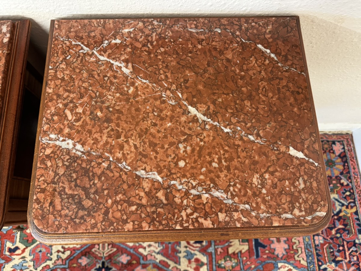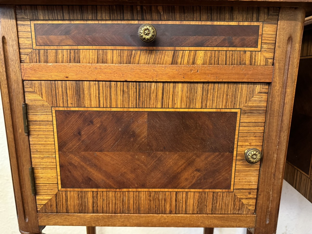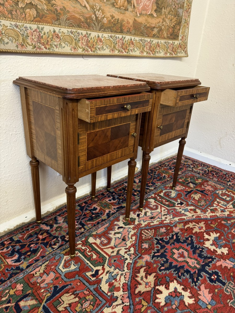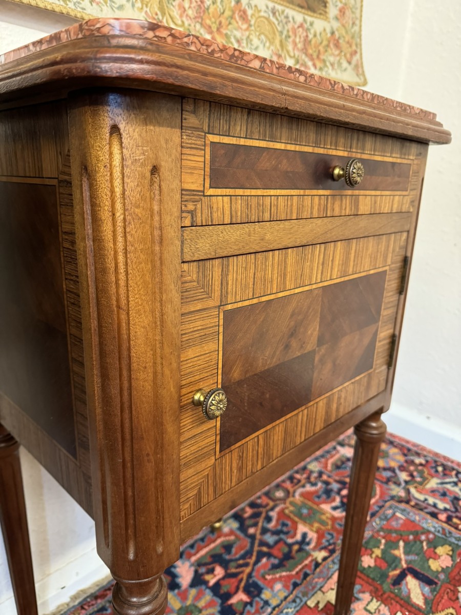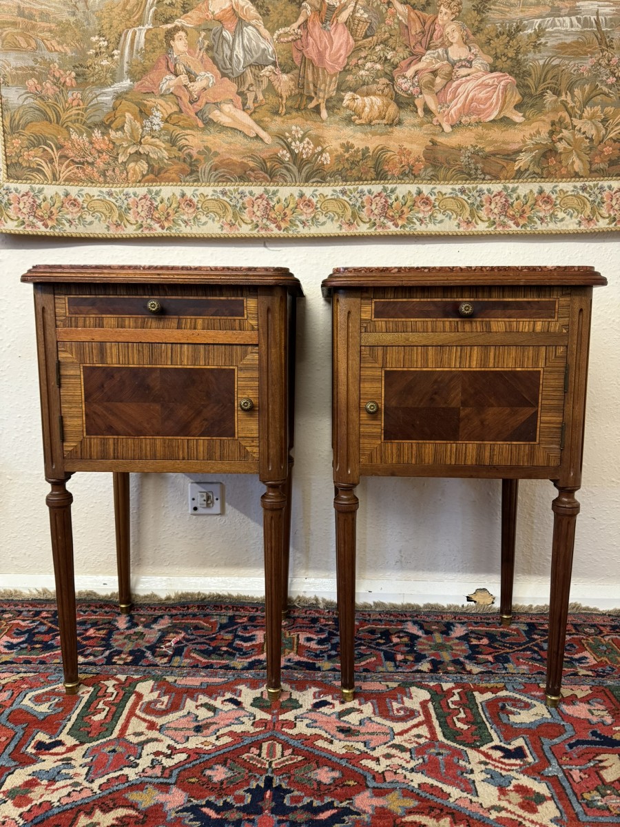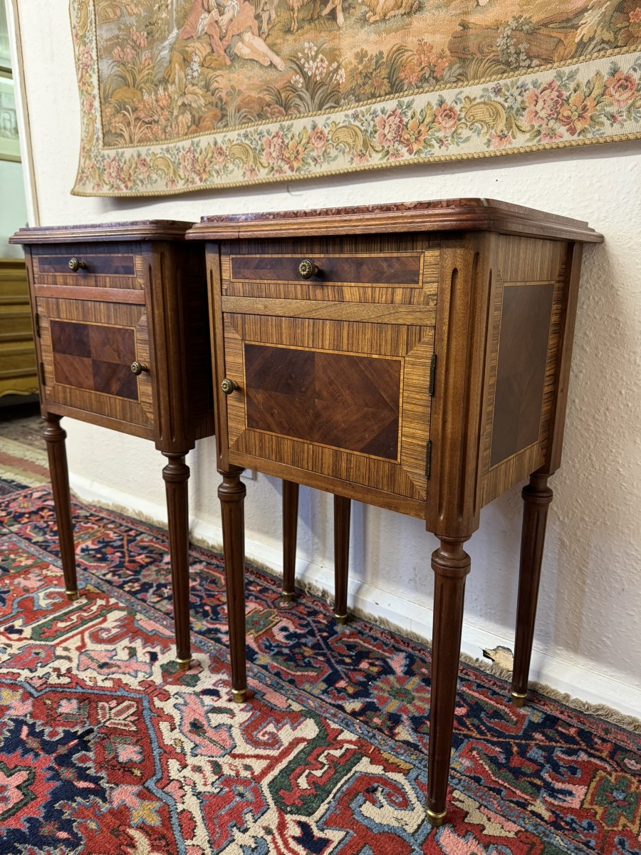 These fabulous quality French antique bedside cabinets dates circa 1890. The marble top sits above a drawer, the drawer having an ornate brass handle, below is a fabulous kingwood inlaid cupboard door, the door also having an ornate brass knob handle. The doors open to reveal the original porcelain interiors. Recessed panelled sides standing on four elegant reeded turned legs with brass capped feet.