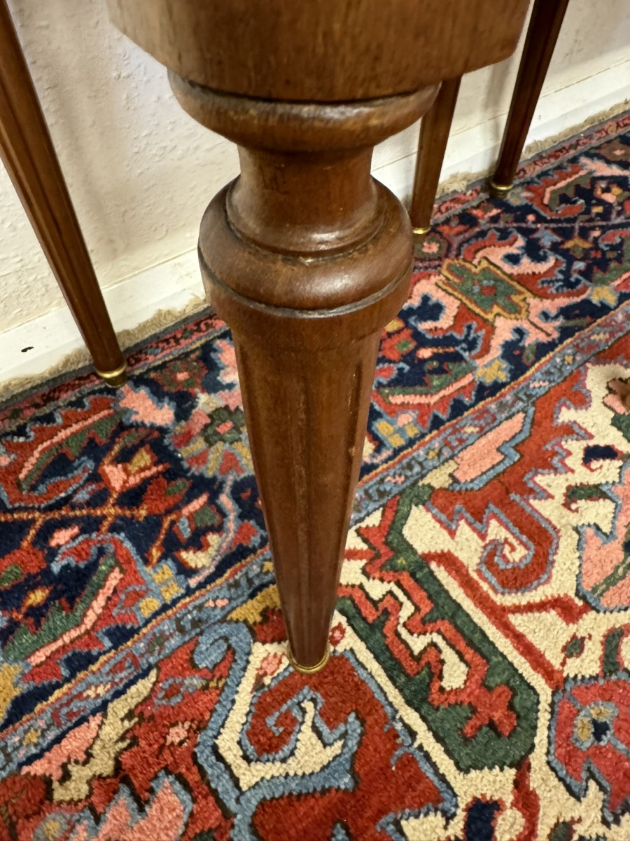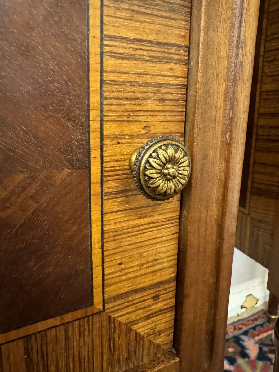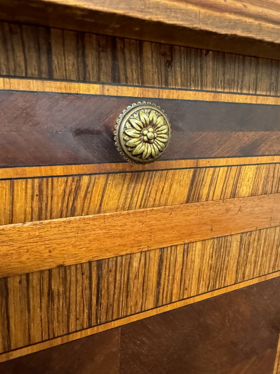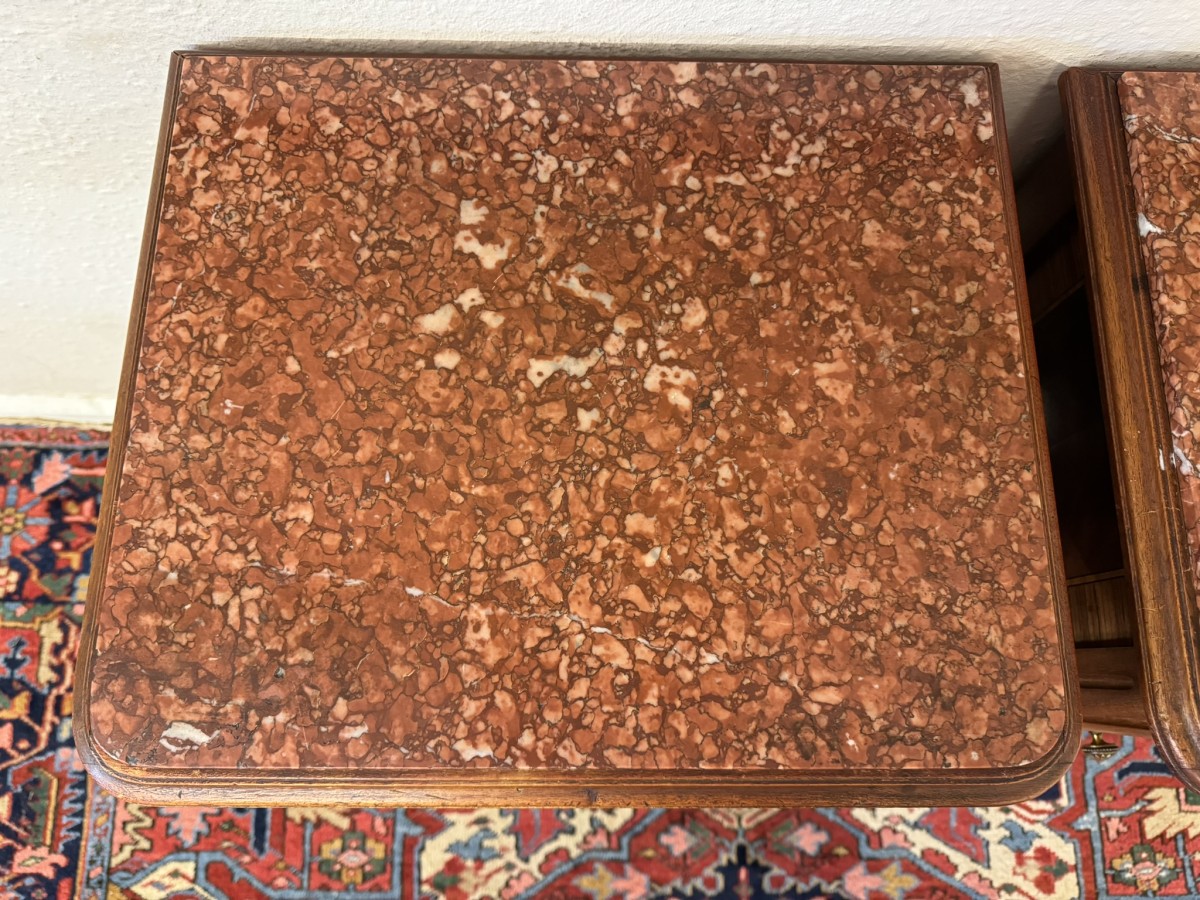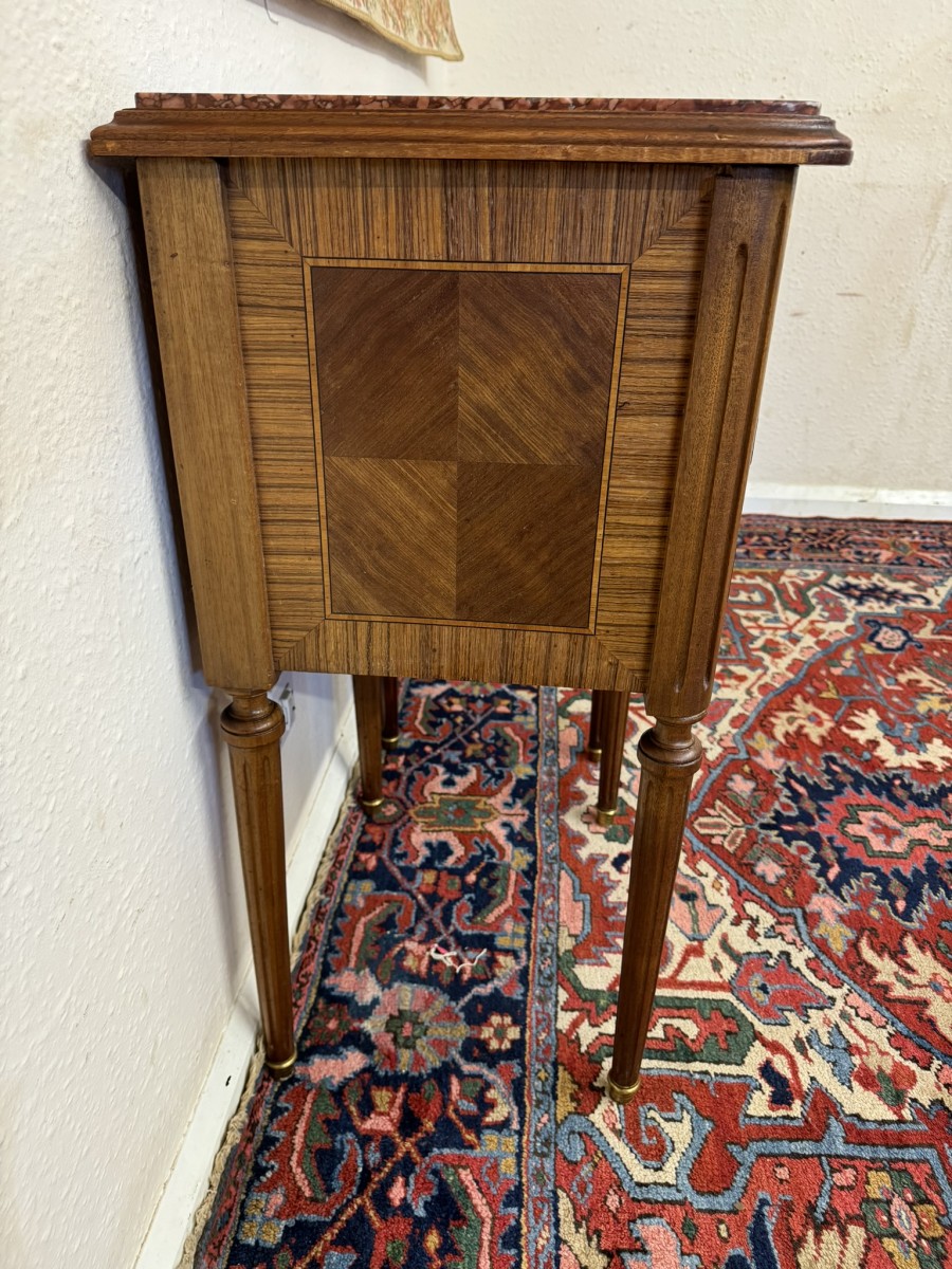 These fabulous quality French antique bedside cabinets dates circa 1890. The marble top sits above a drawer, the drawer having an ornate brass handle, below is a fabulous kingwood inlaid cupboard door, the door also having an ornate brass knob handle. The doors open to reveal the original porcelain interiors. Recessed panelled sides standing on four elegant reeded turned legs with brass capped feet.