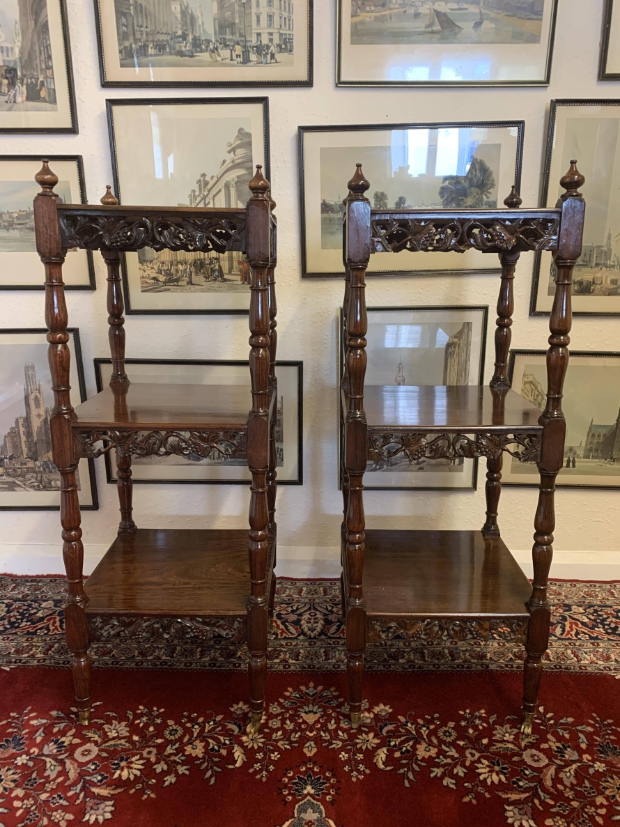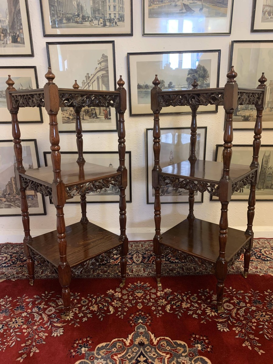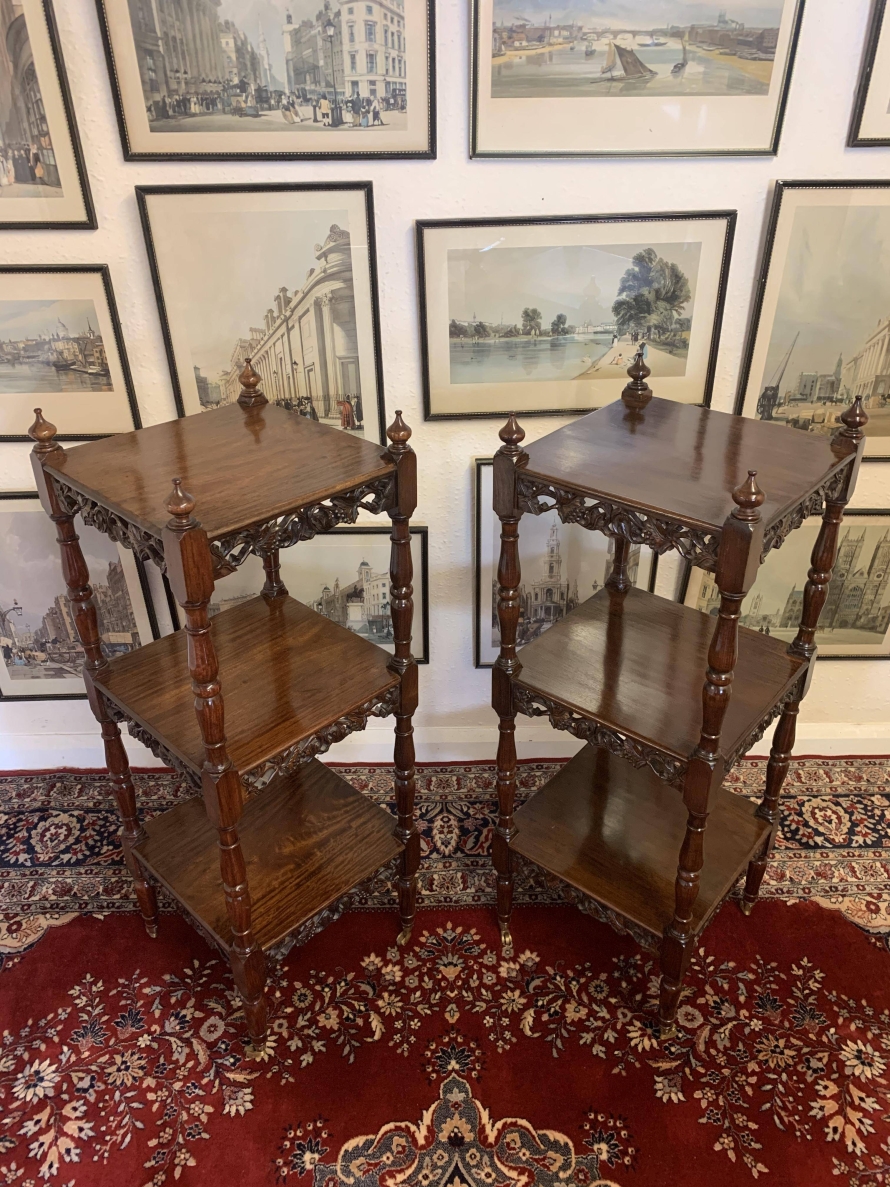 Stunning Pair Of Carved Mahogany Three Tier What Nots/stands/sidetables/display – Now Sold