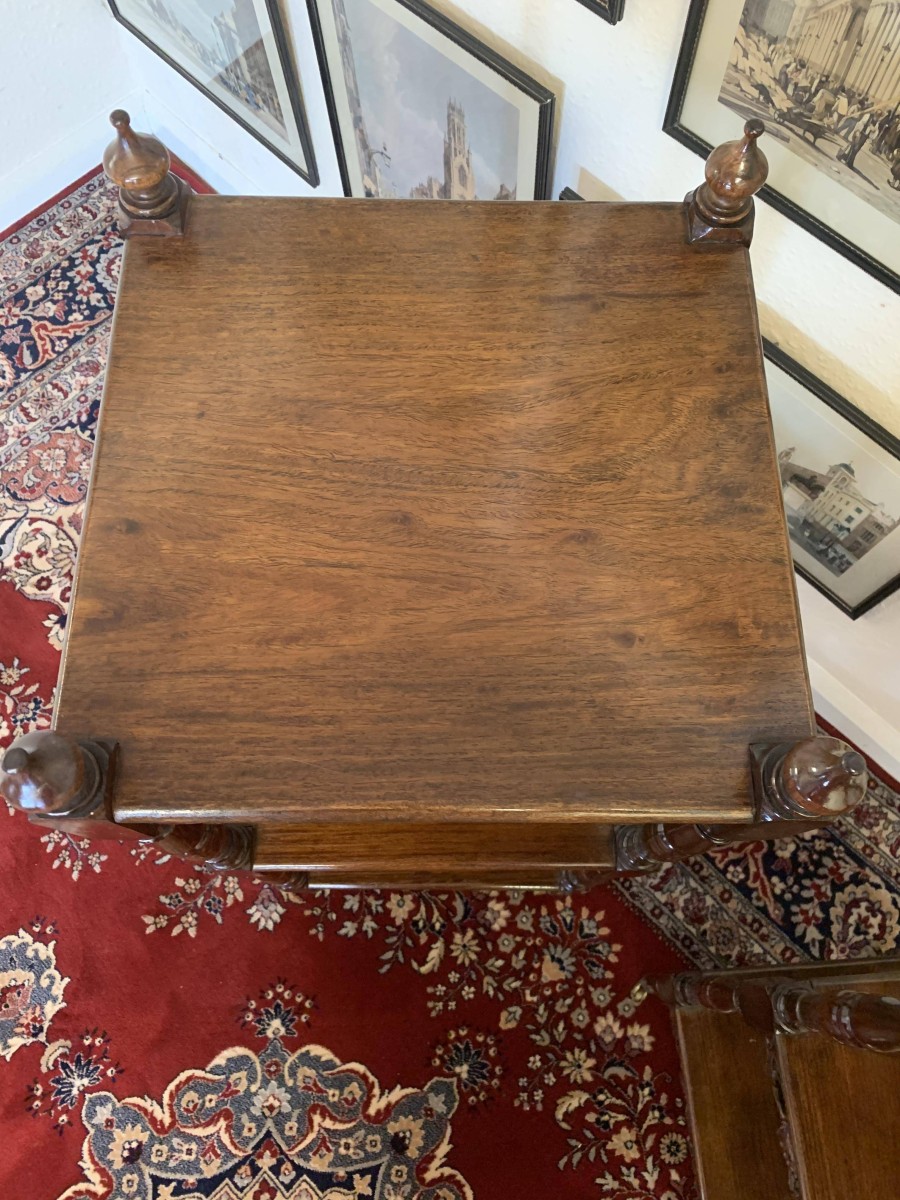 Made in glorious mahogany, each stand has four turned finials to the top tier. There are three tiers for displaying, below each tier are finely carved vine frieze's. Supported by four elegantly turned columns, each stand has four original brass casters. Fantastic to find a pair which are in EXCELLENT condition.