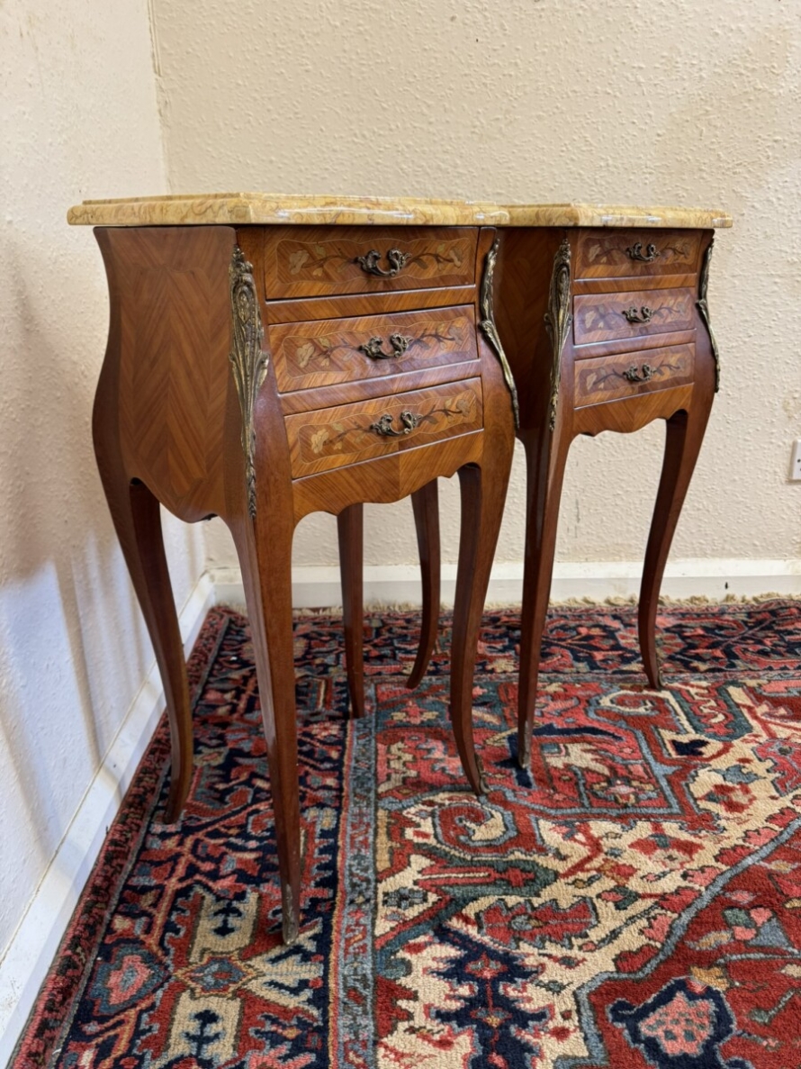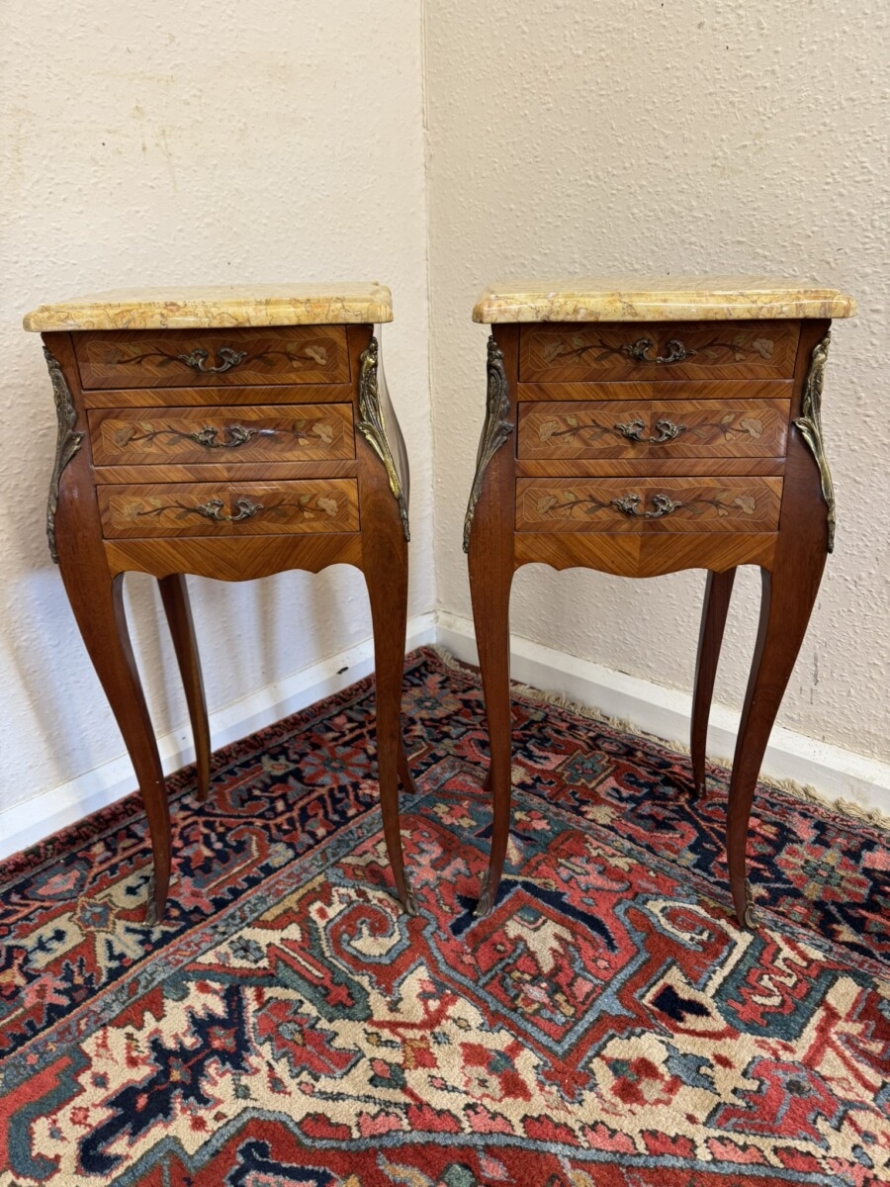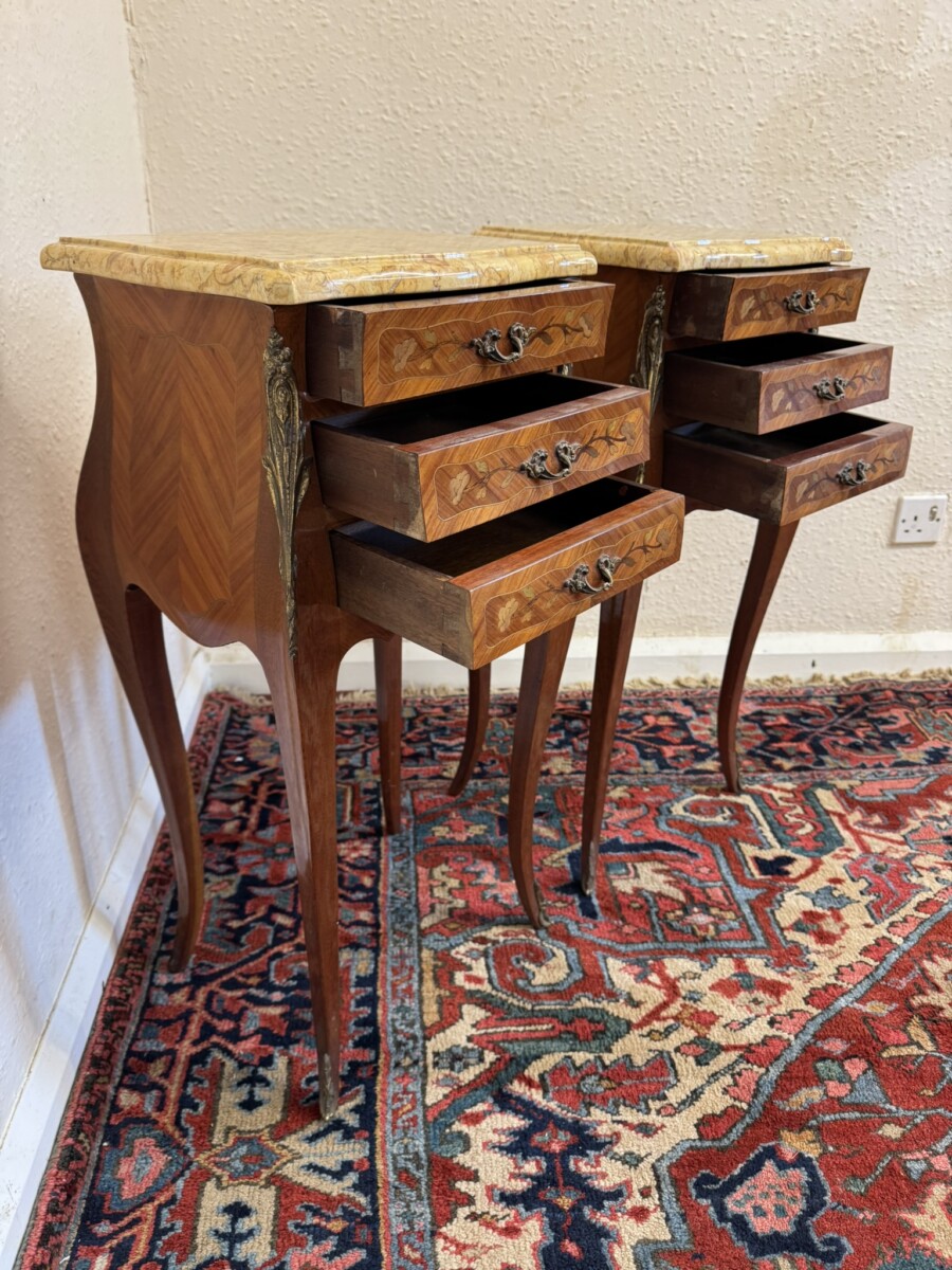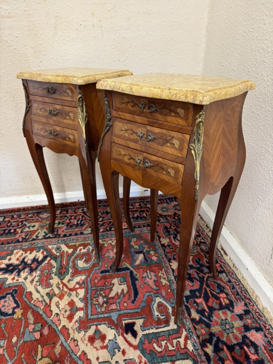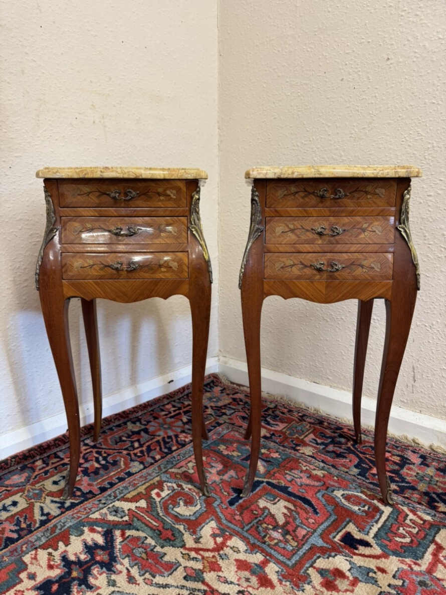 This attractive pair of French bedside cabinets are in fabulous condition. The shaped removable marble top sits above three marquetry inlaid drawers, each drawer having a decorative gilt brass handle. Shaped sides and standing on four cabriole shaped legs with gilt mount decoration.