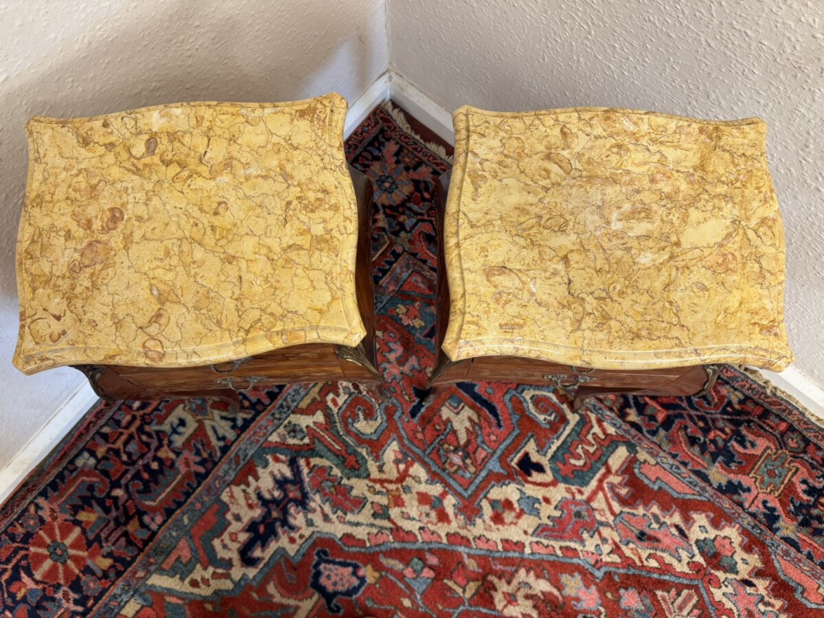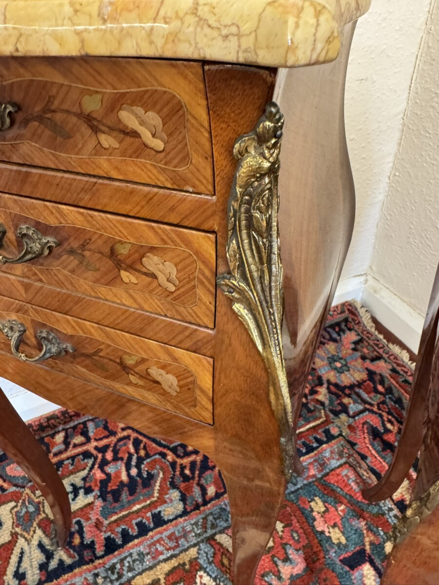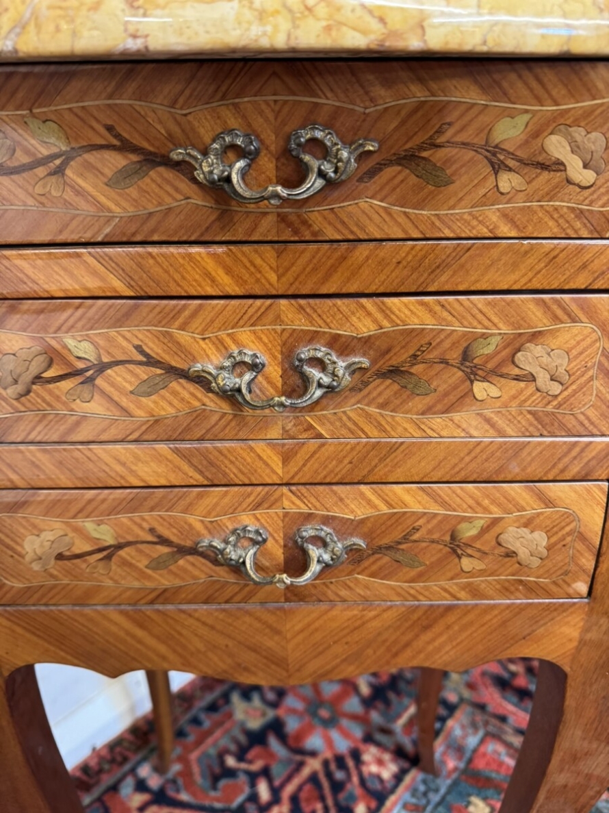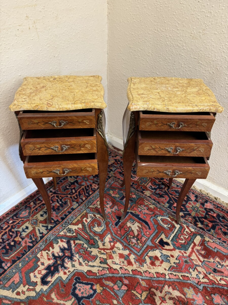 This attractive pair of French bedside cabinets are in fabulous condition. The shaped removable marble top sits above three marquetry inlaid drawers, each drawer having a decorative gilt brass handle. Shaped sides and standing on four cabriole shaped legs with gilt mount decoration.