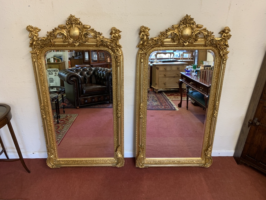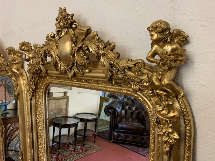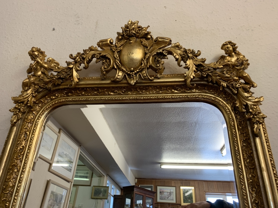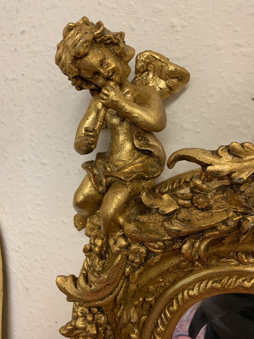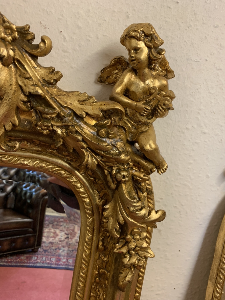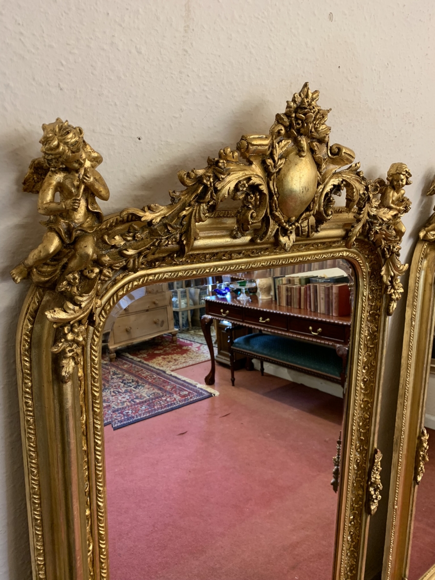 The mirrors are in excellent condition. The bevel edged mirror sits in an exquisetly carved relief frame. Having floral decoration and two carved cherub figures.