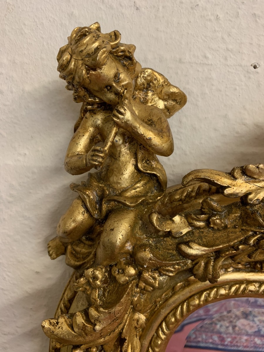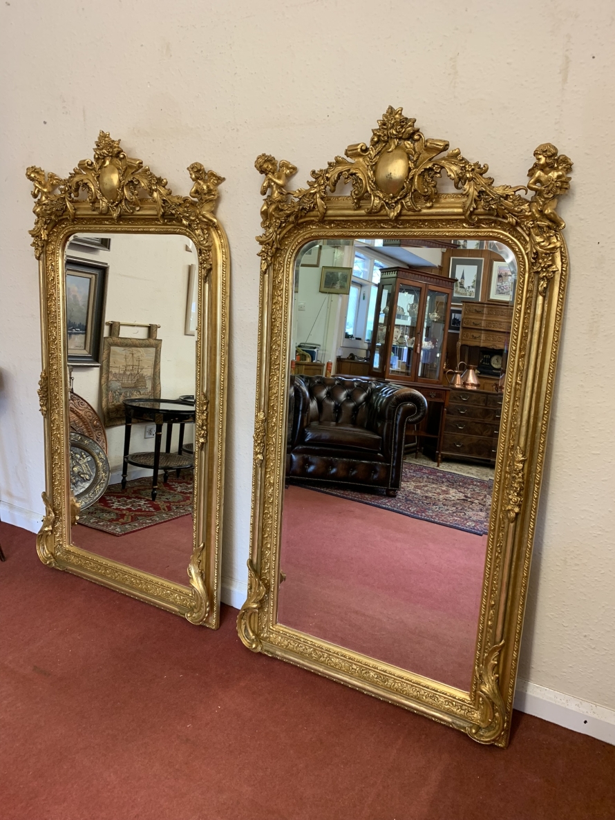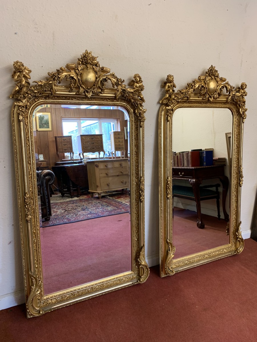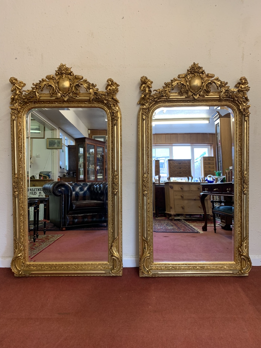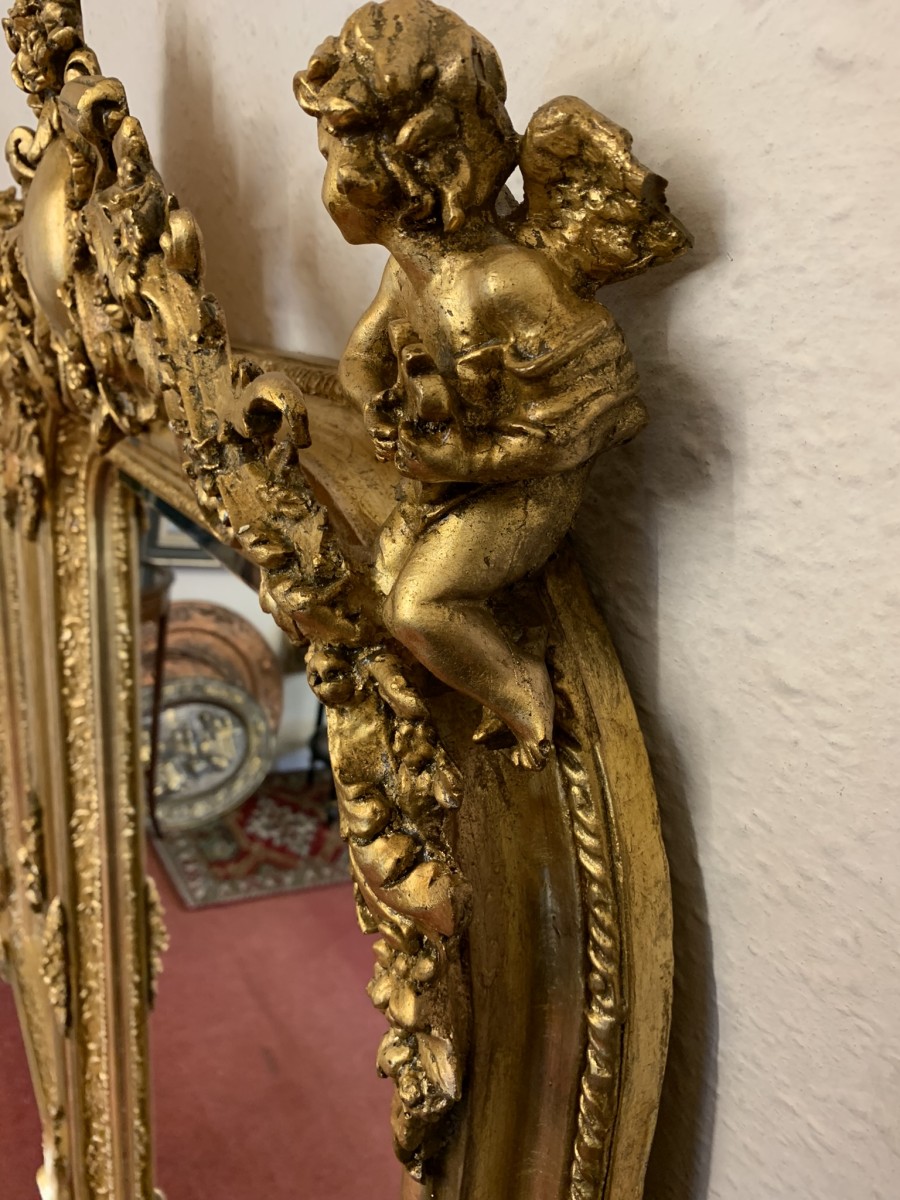 The mirrors are in excellent condition. The bevel edged mirror sits in an exquisetly carved relief frame. Having floral decoration and two carved cherub figures.