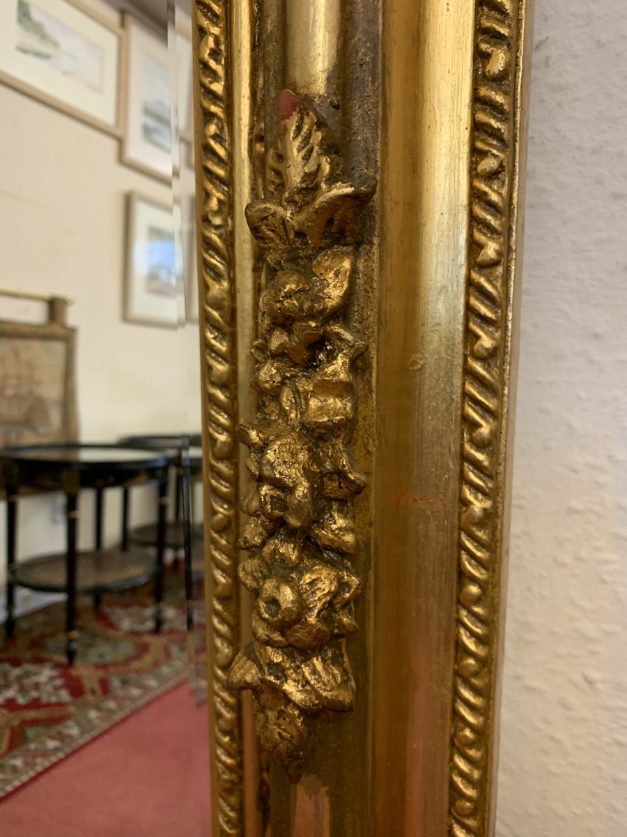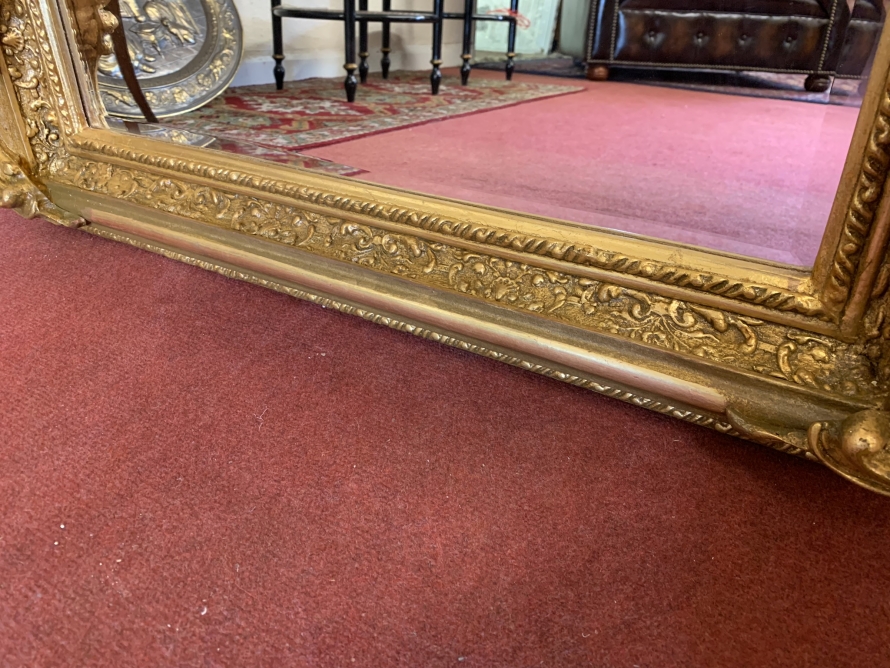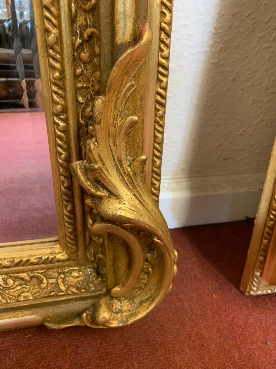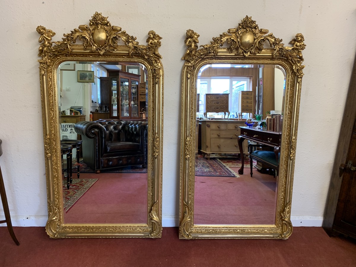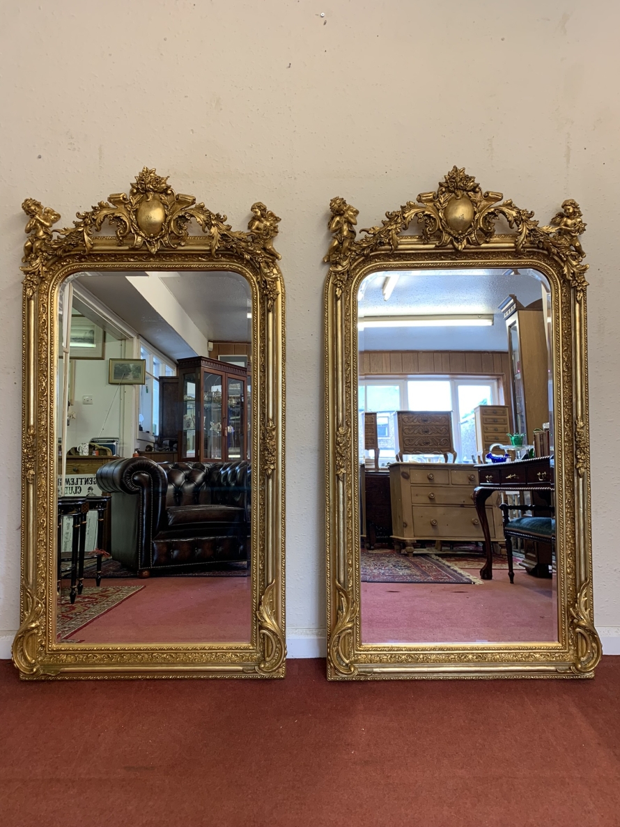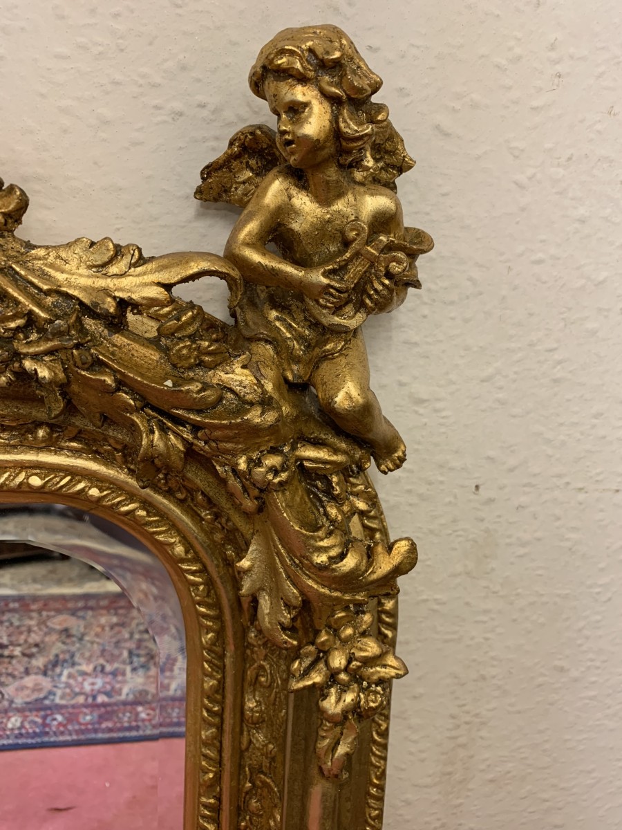 The mirrors are in excellent condition. The bevel edged mirror sits in an exquisetly carved relief frame. Having floral decoration and two carved cherub figures.