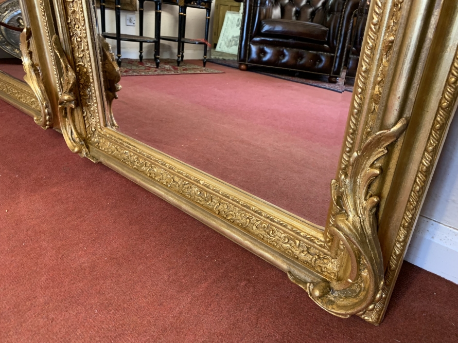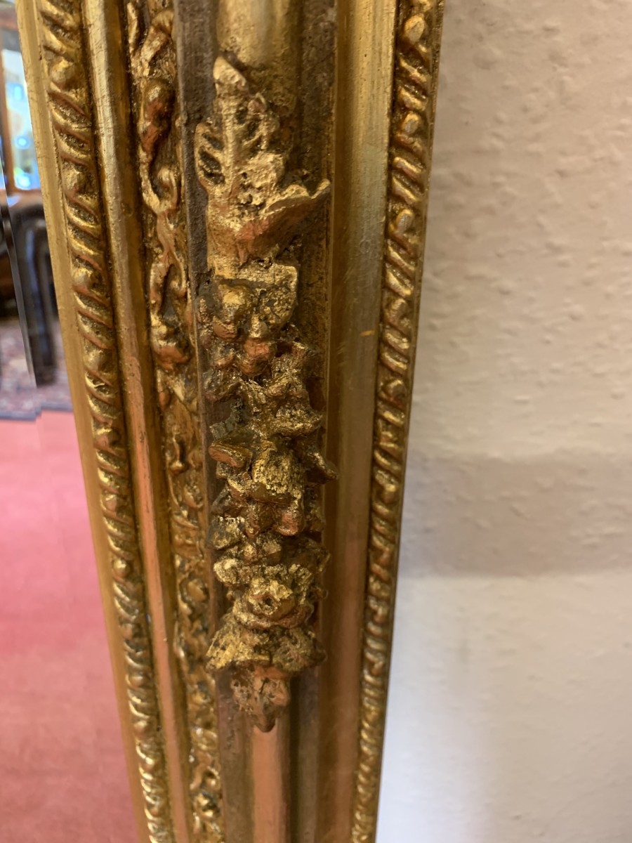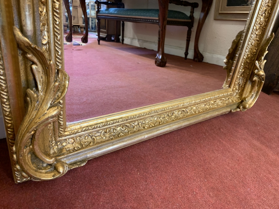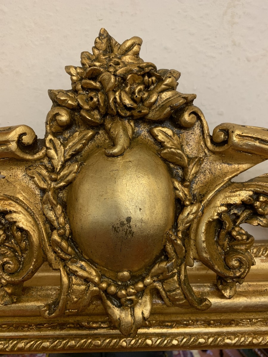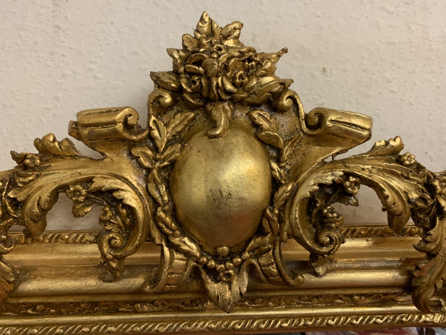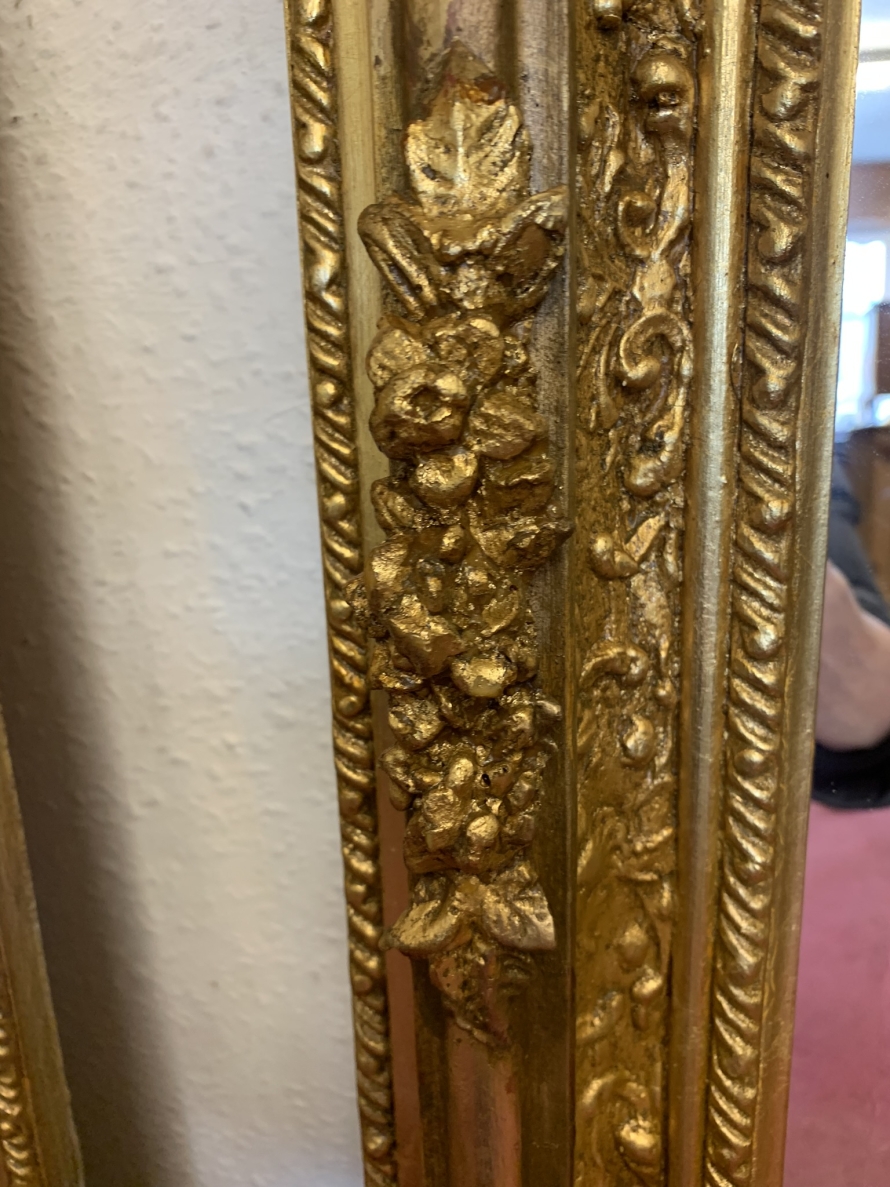 The mirrors are in excellent condition. The bevel edged mirror sits in an exquisetly carved relief frame. Having floral decoration and two carved cherub figures.