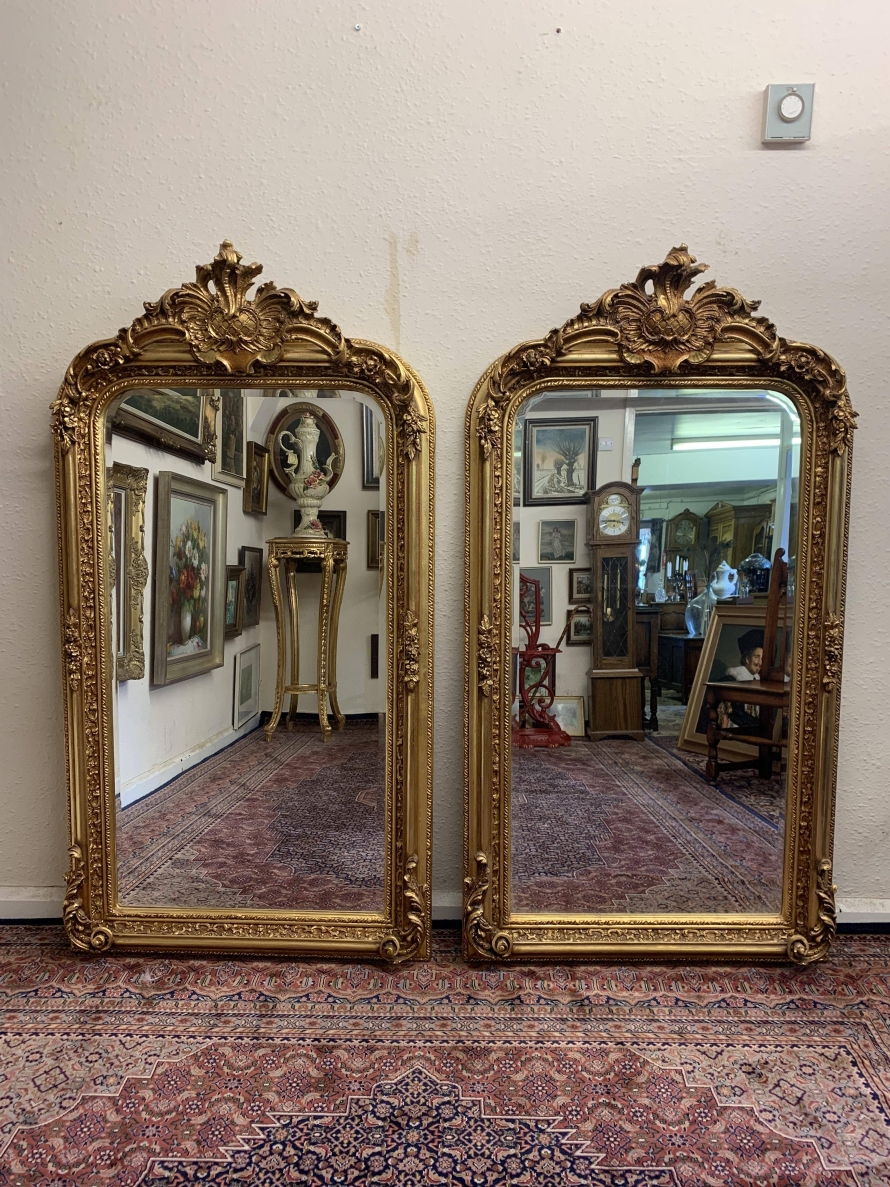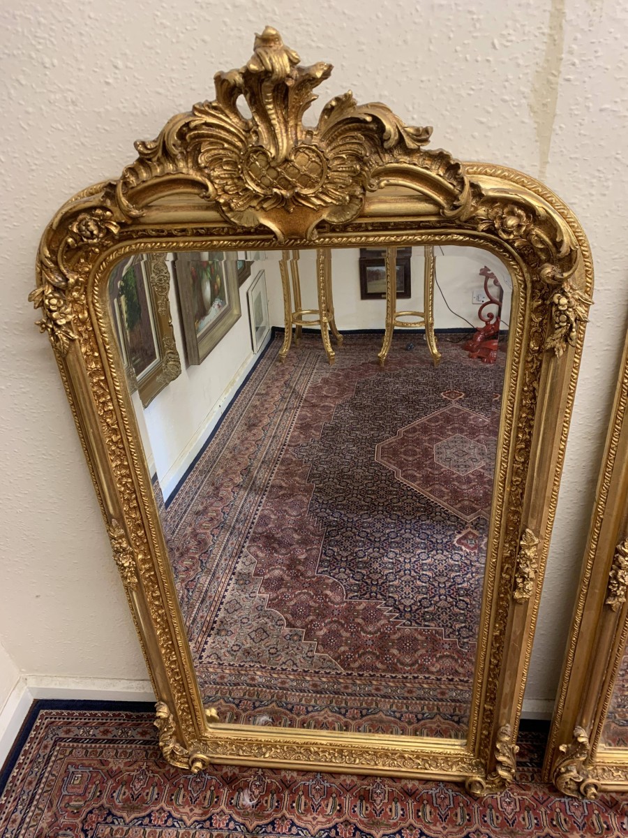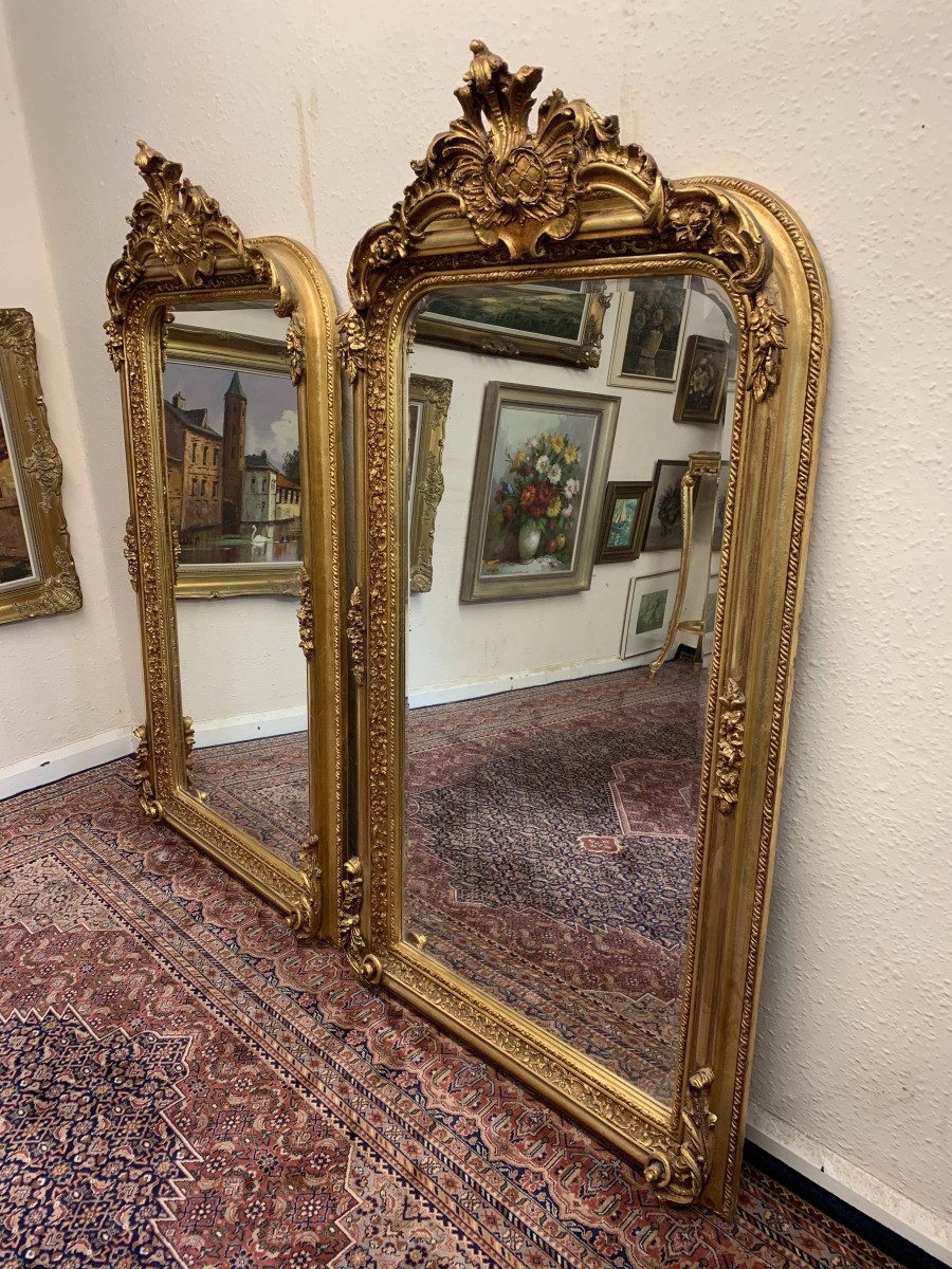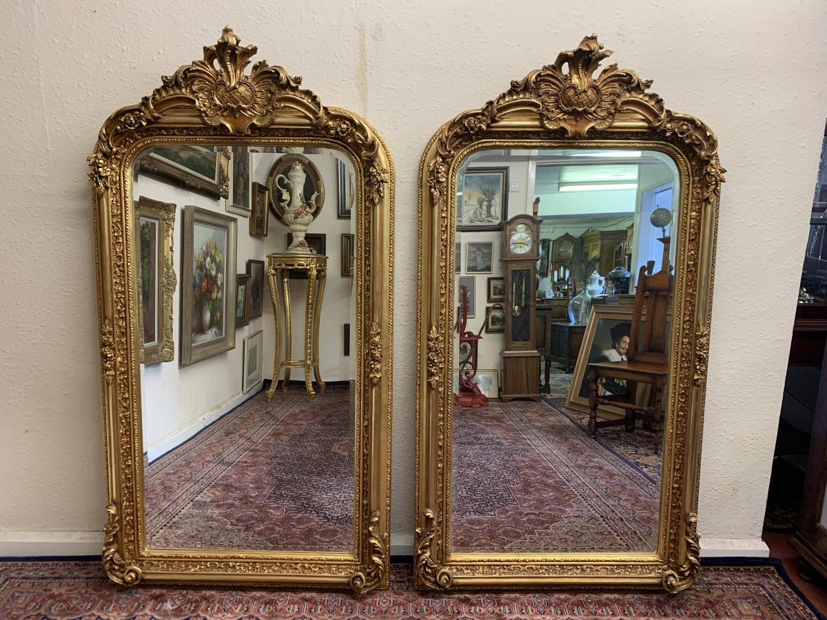 This fabulous pair of gilt mirrors are in excellent condition. Each mirror rises to a central carving. The bevel edged mirror sits in a beautifully carved frame.