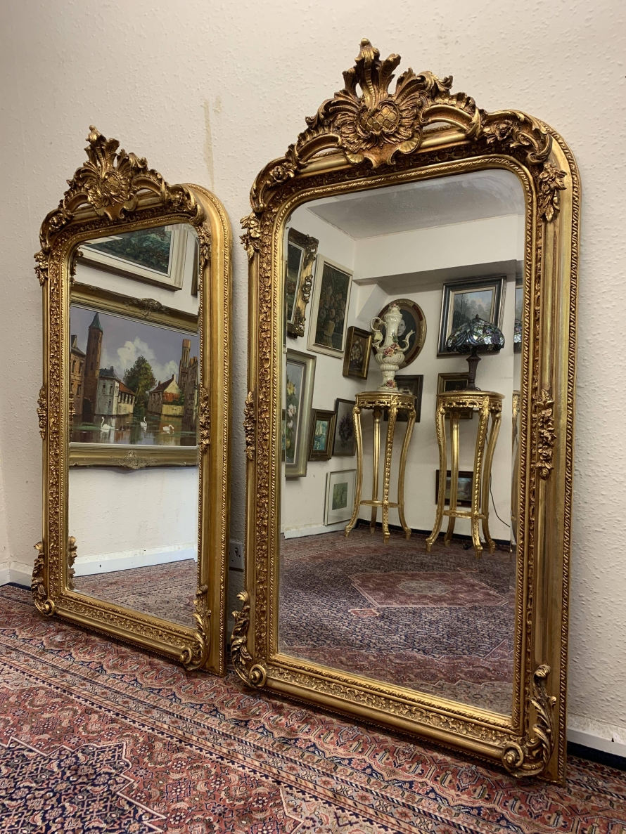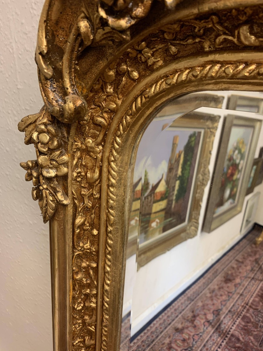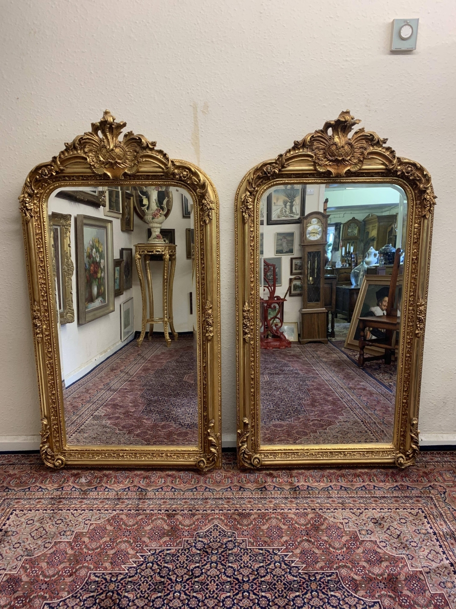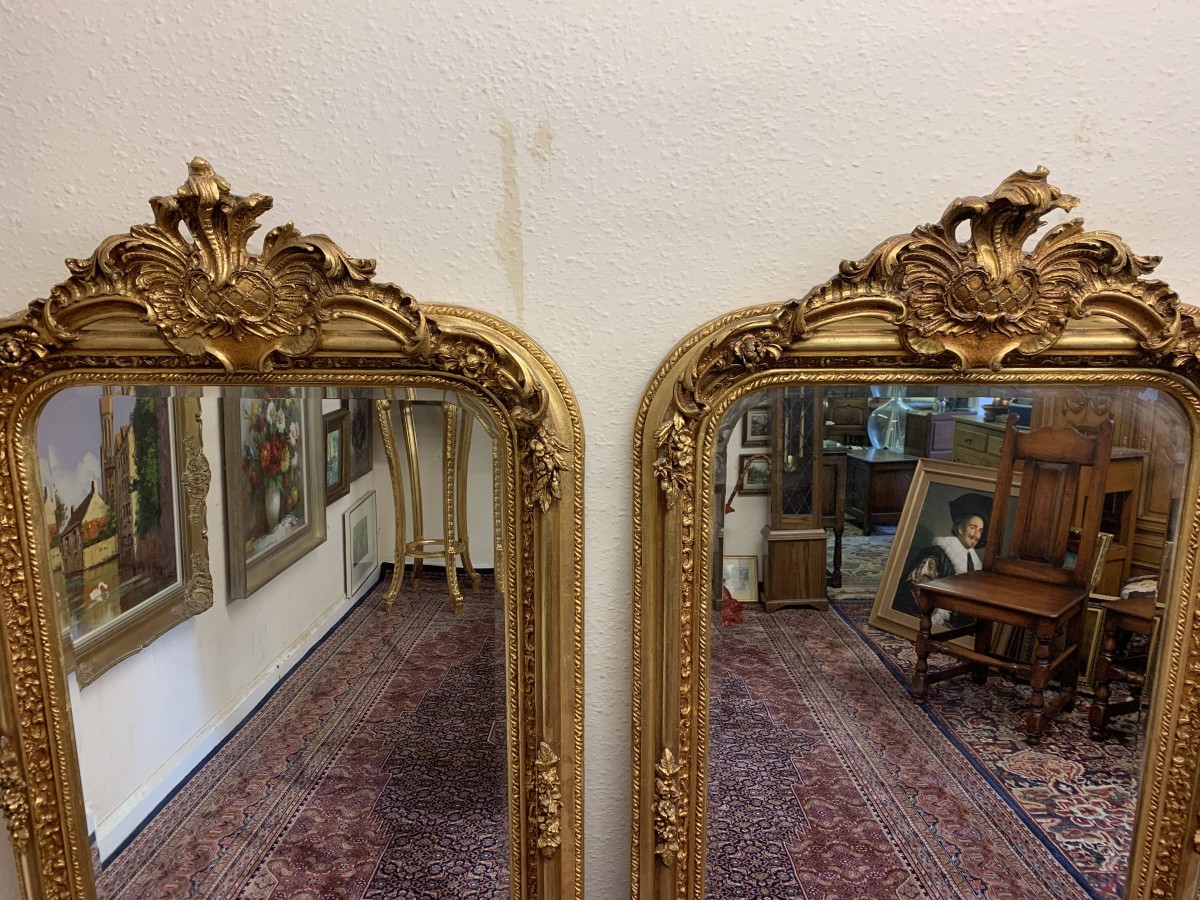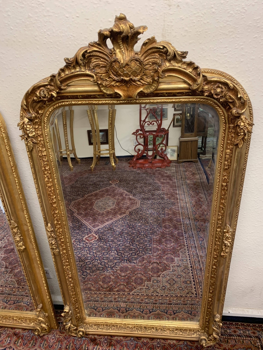 This fabulous pair of gilt mirrors are in excellent condition. Each mirror rises to a central carving. The bevel edged mirror sits in a beautifully carved frame.