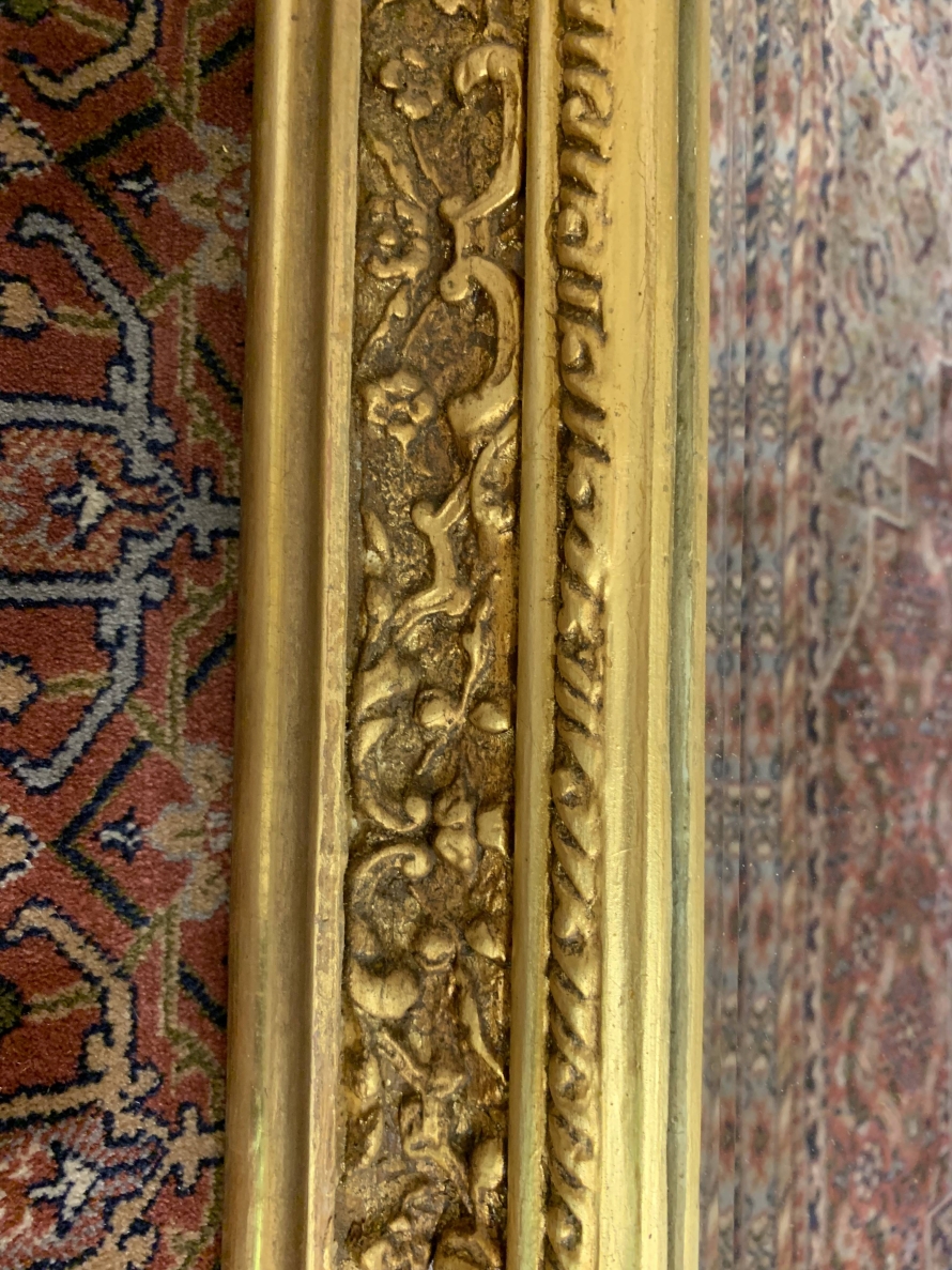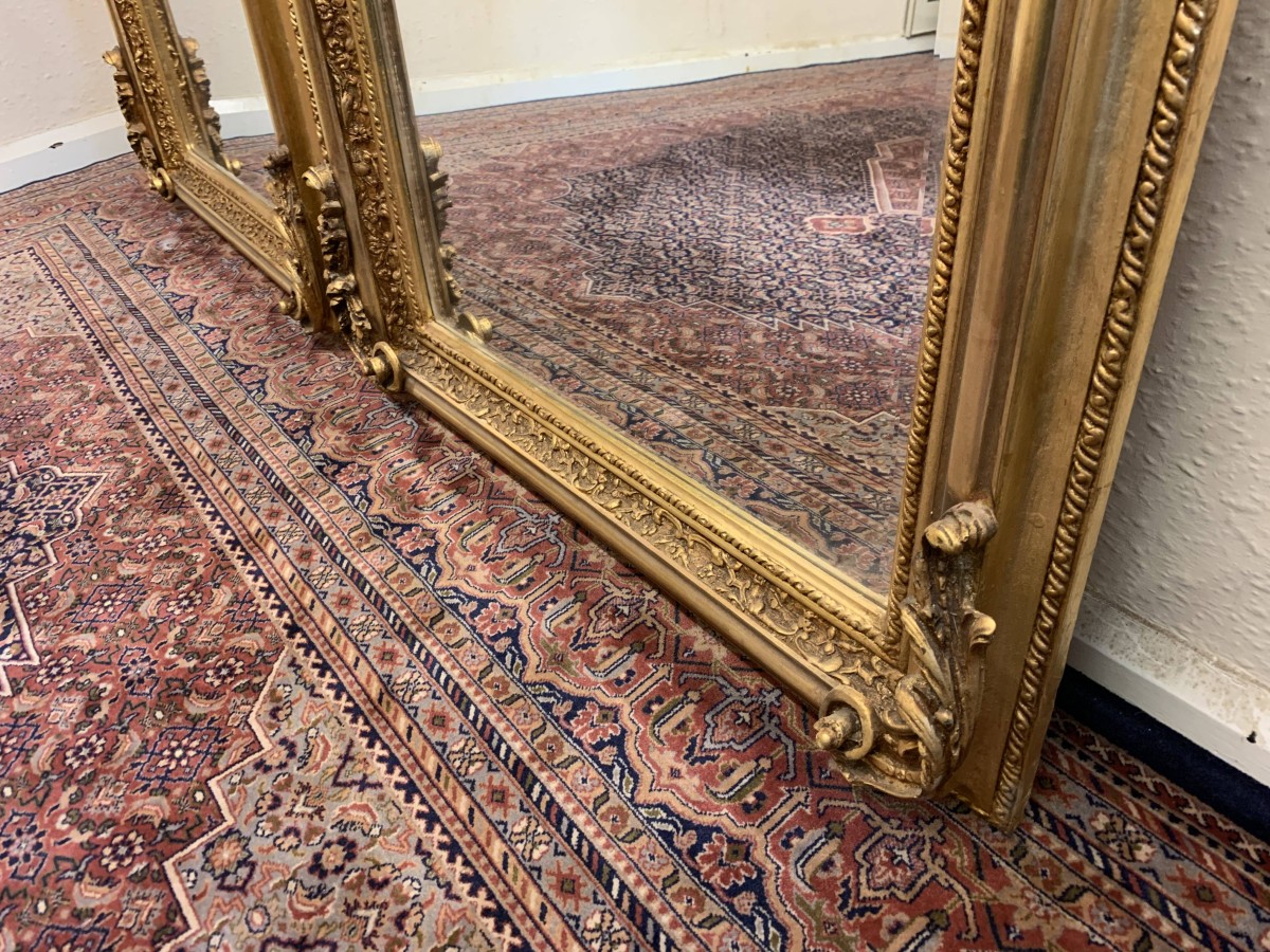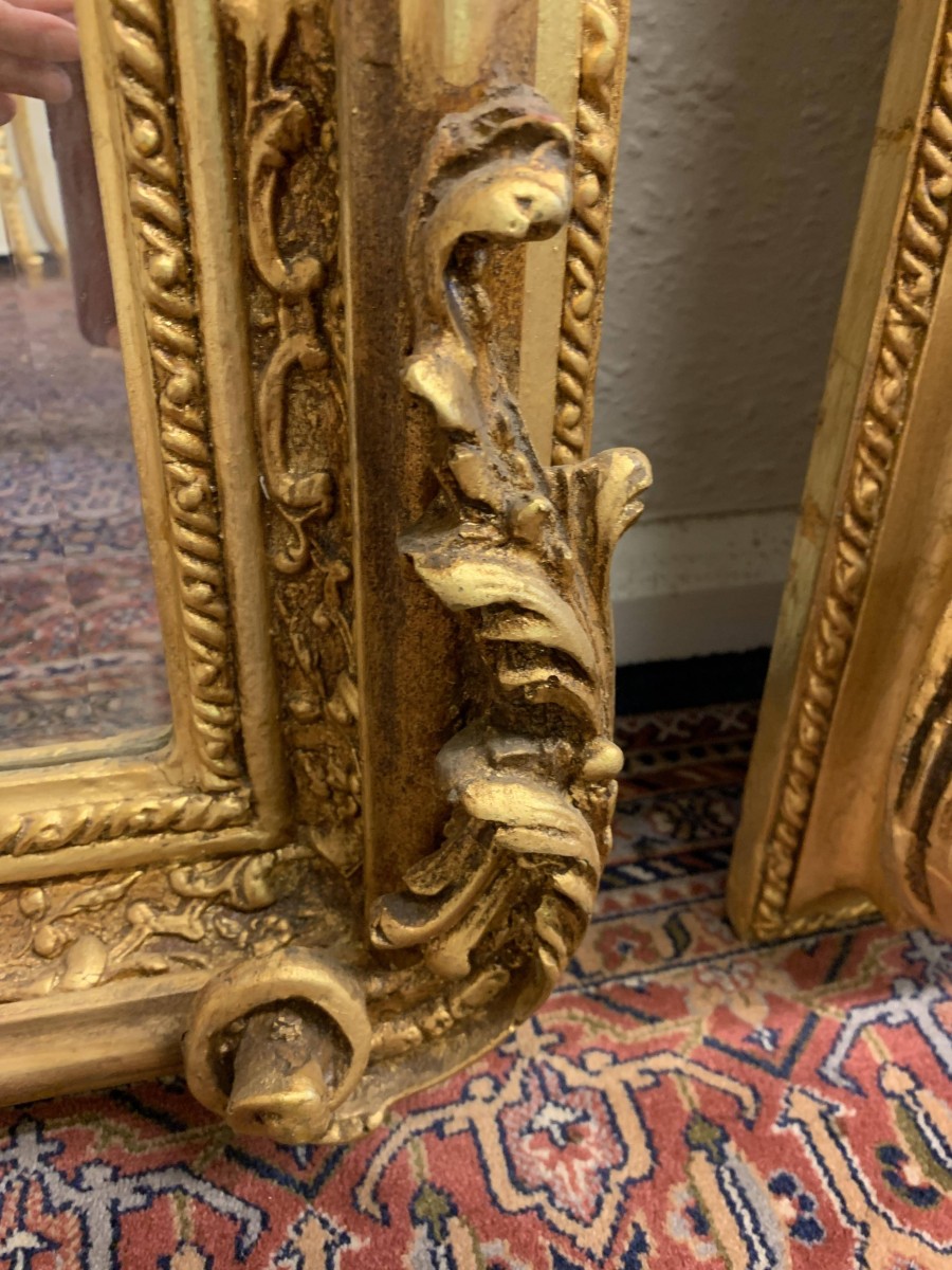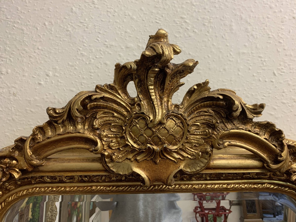 This fabulous pair of gilt mirrors are in excellent condition. Each mirror rises to a central carving. The bevel edged mirror sits in a beautifully carved frame.