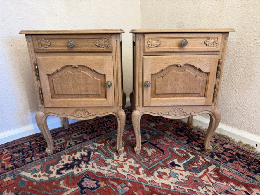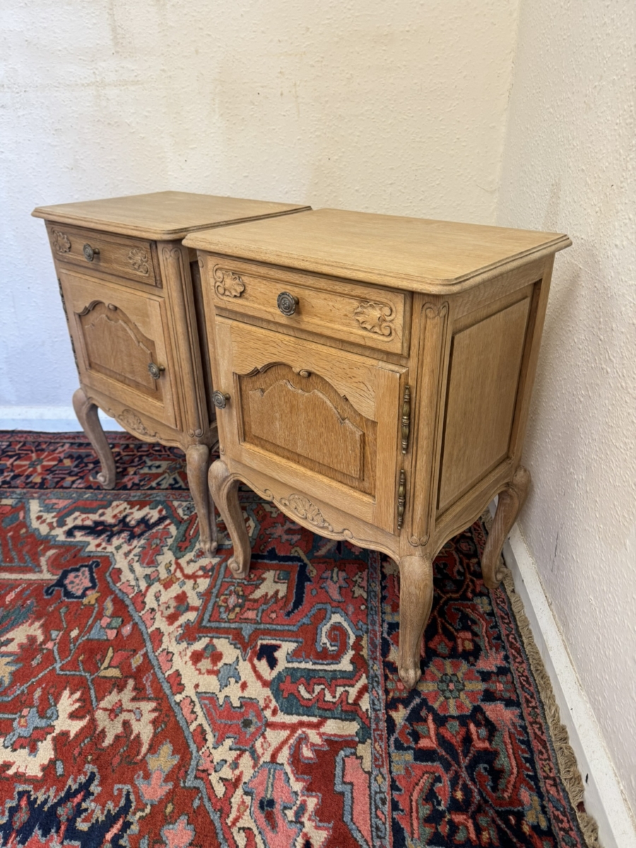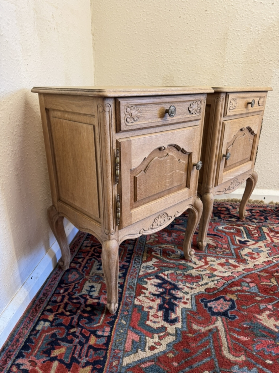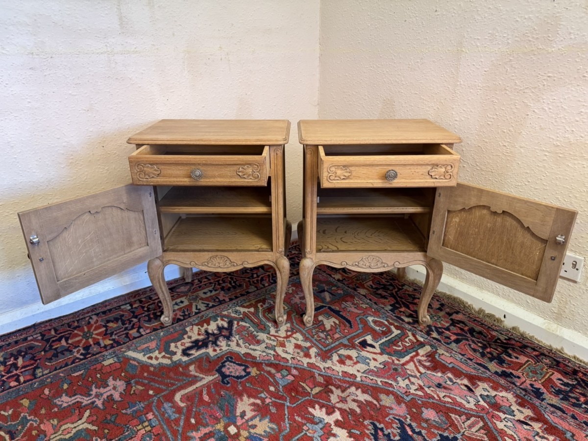Each of these beautiful natural oak cupboards has an over sailing top with carved drawer below, the drawer having an ornate brass handle. Below the drawer is a shaped recessed panelled cupboard door, the doors having brass hinges and ornate brass handle. The doors open to reveal a removable shelf. Recessed panelled sides, shaped skirt with central carving and standing on four carved cabriole shaped legs.