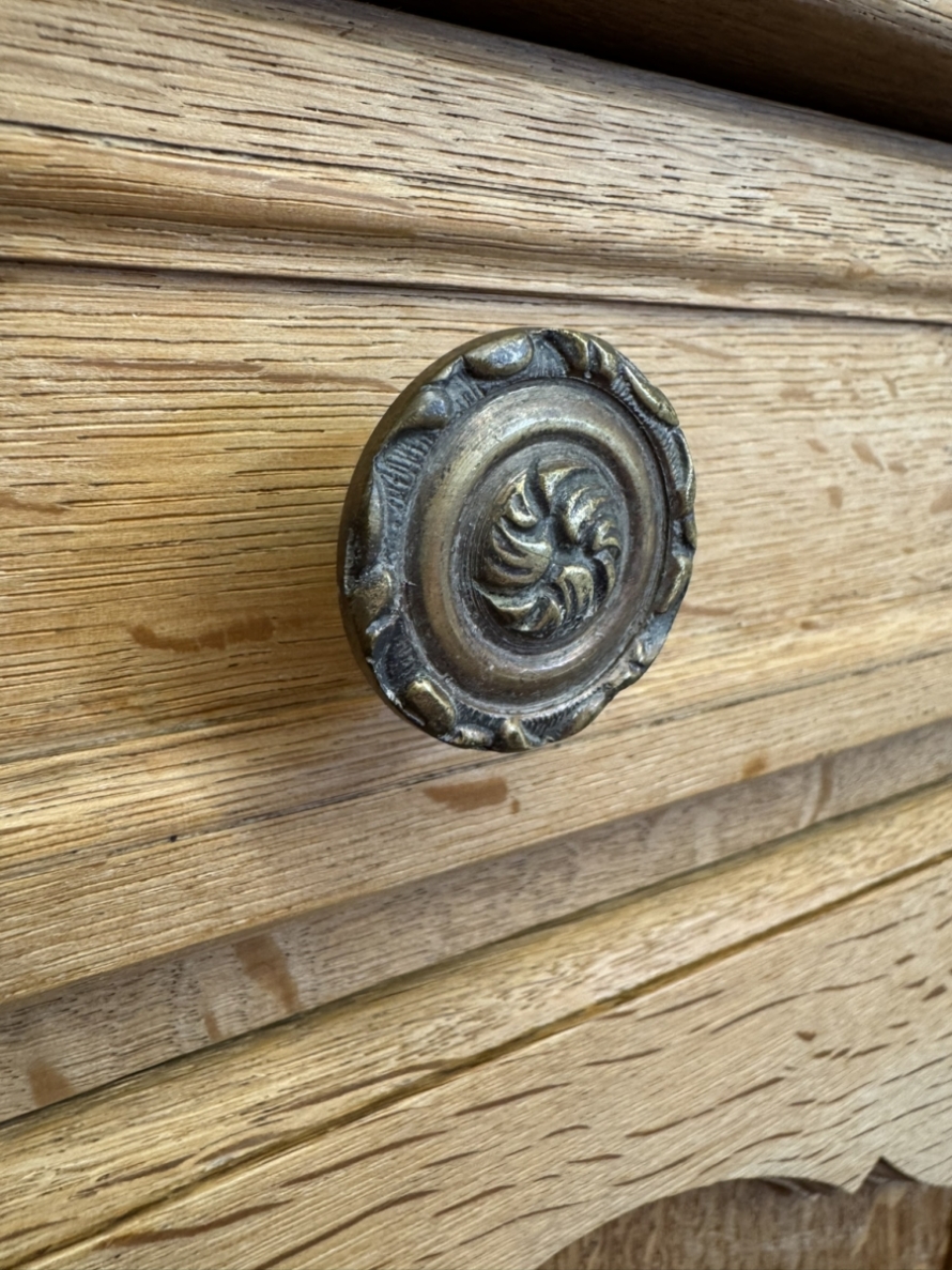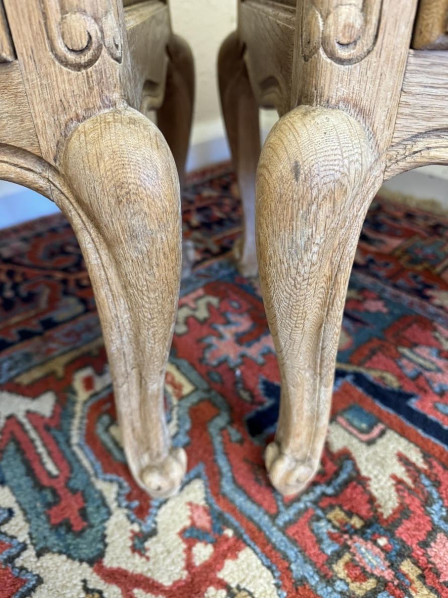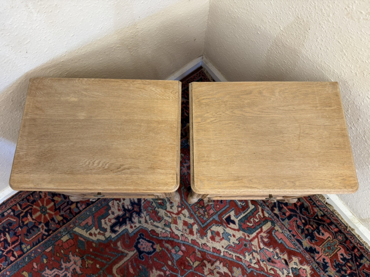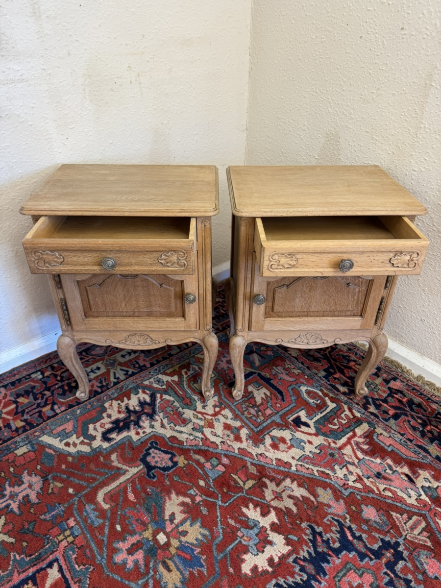 Each of these beautiful natural oak cupboards has an over sailing top with carved drawer below, the drawer having an ornate brass handle. Below the drawer is a shaped recessed panelled cupboard door, the doors having brass hinges and ornate brass handle. The doors open to reveal a removable shelf. Recessed panelled sides, shaped skirt with central carving and standing on four carved cabriole shaped legs.