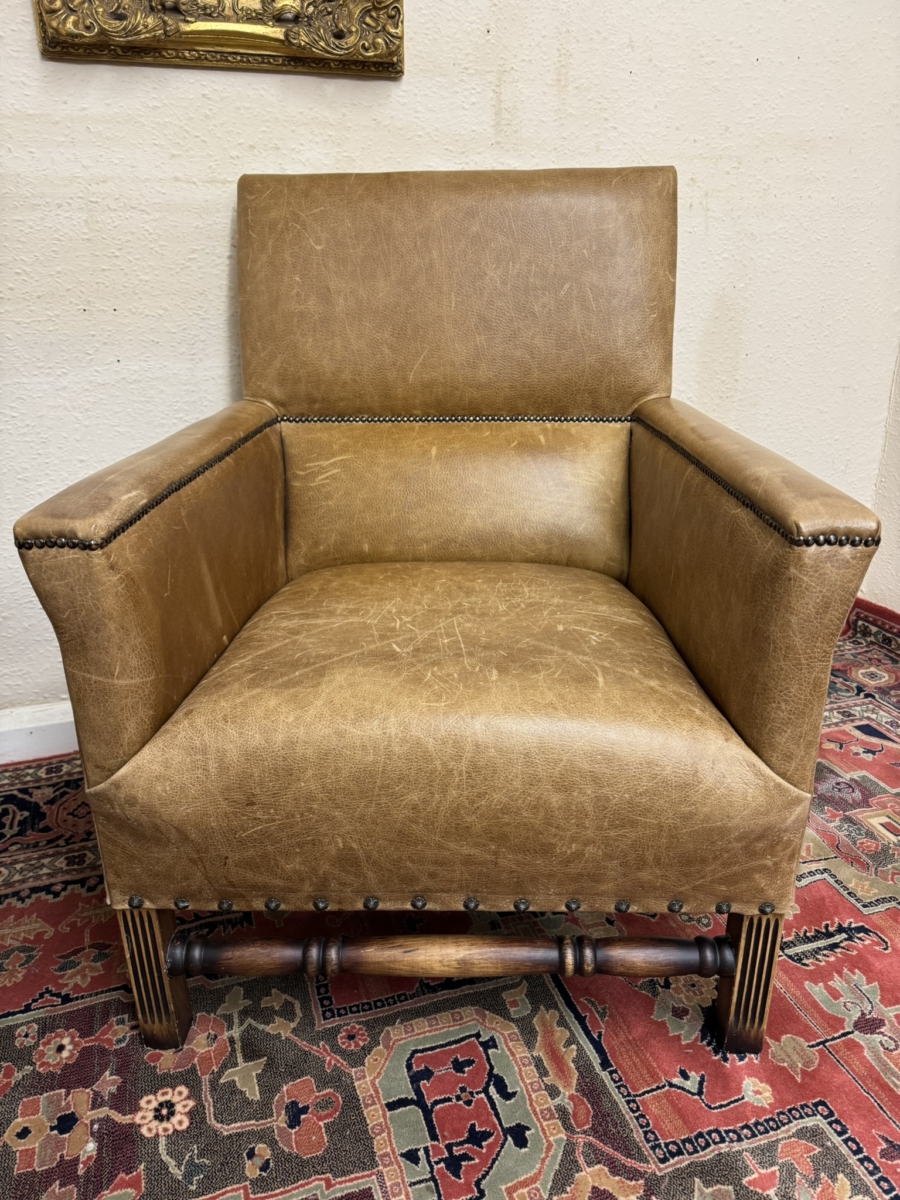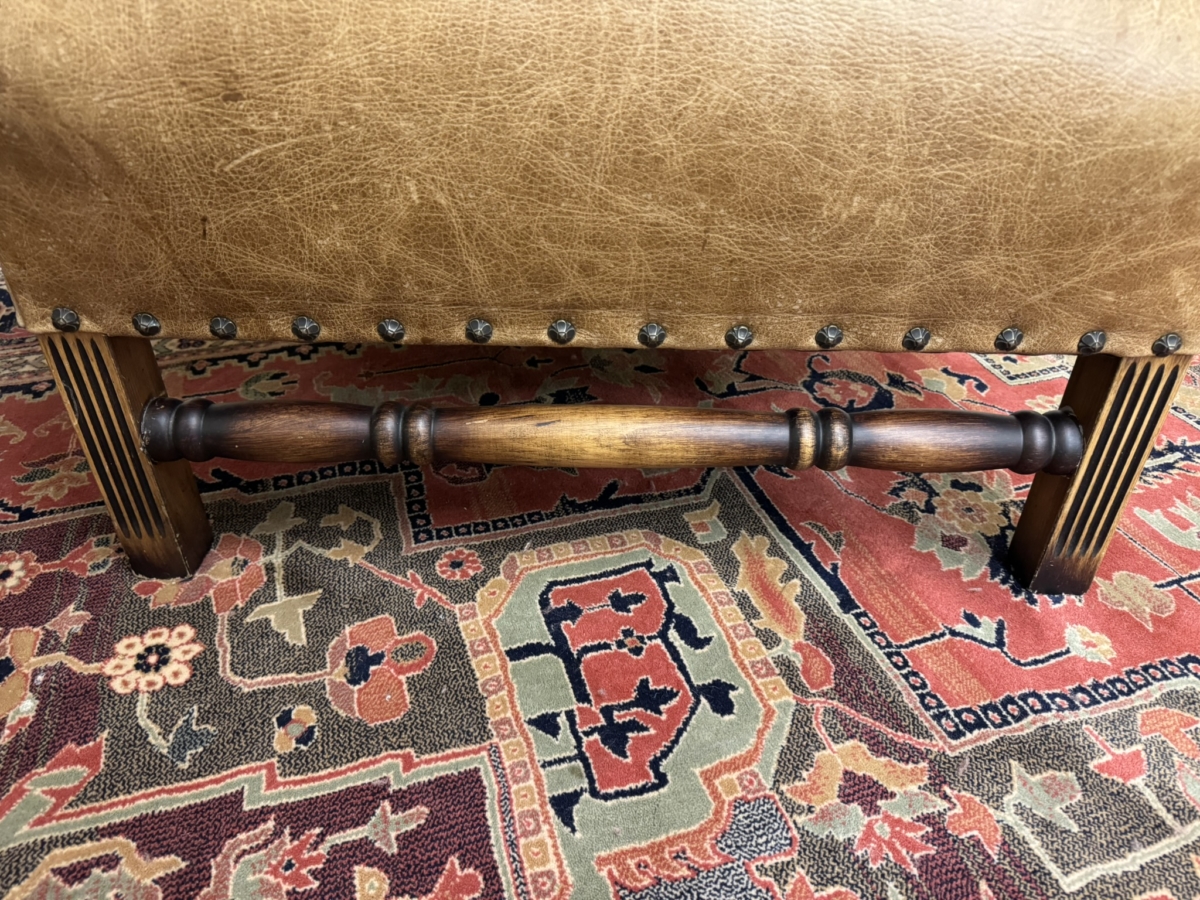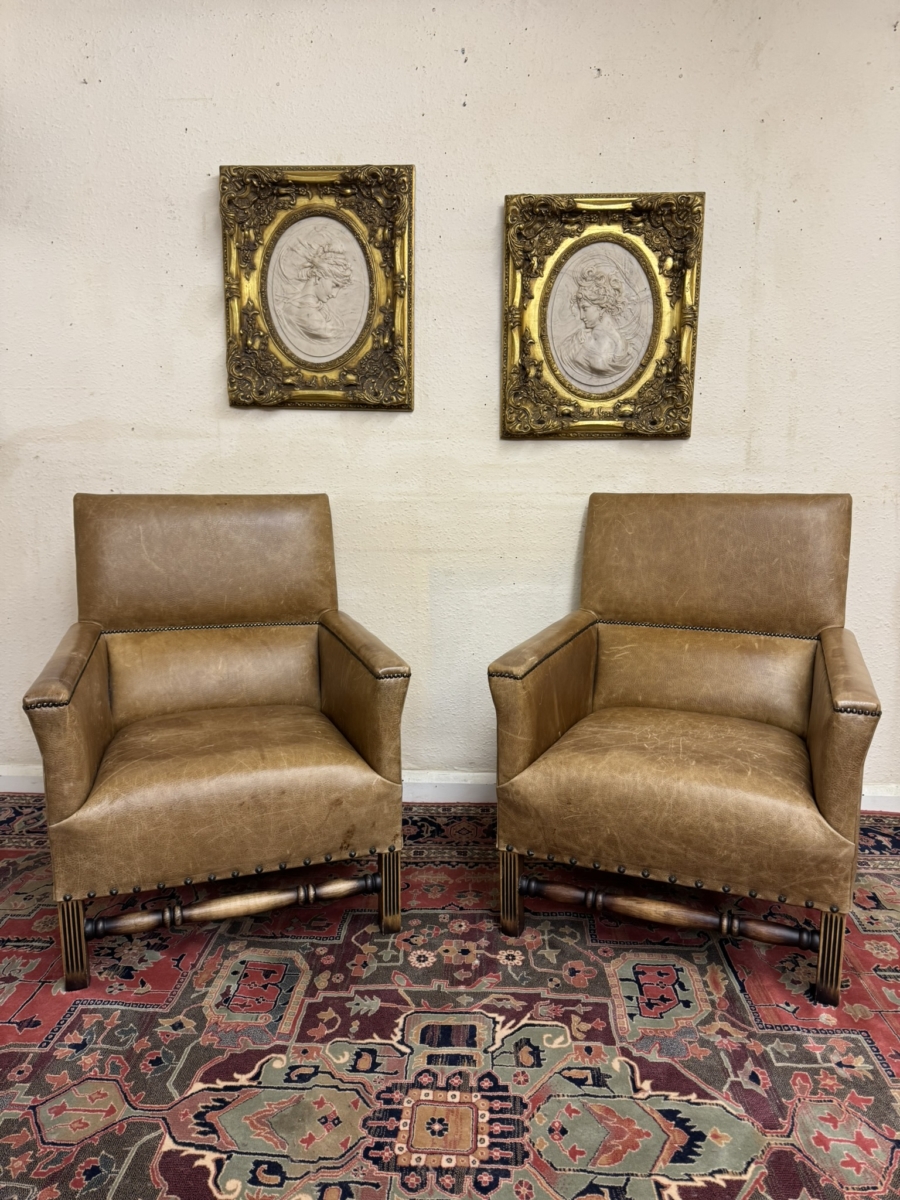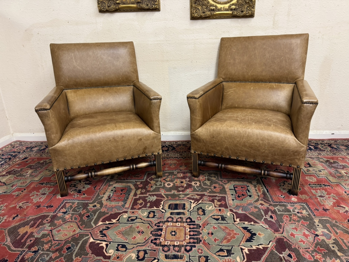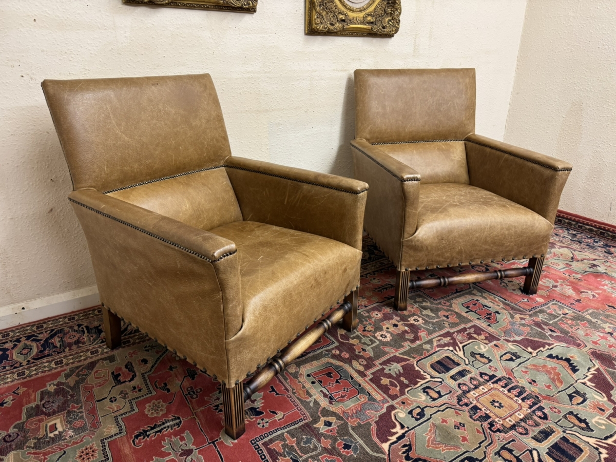 This stunning pair of chairs have tan leather upholstery with brass studded decoration. Four oak legs, the front two with carving with a front turned stretcher support.