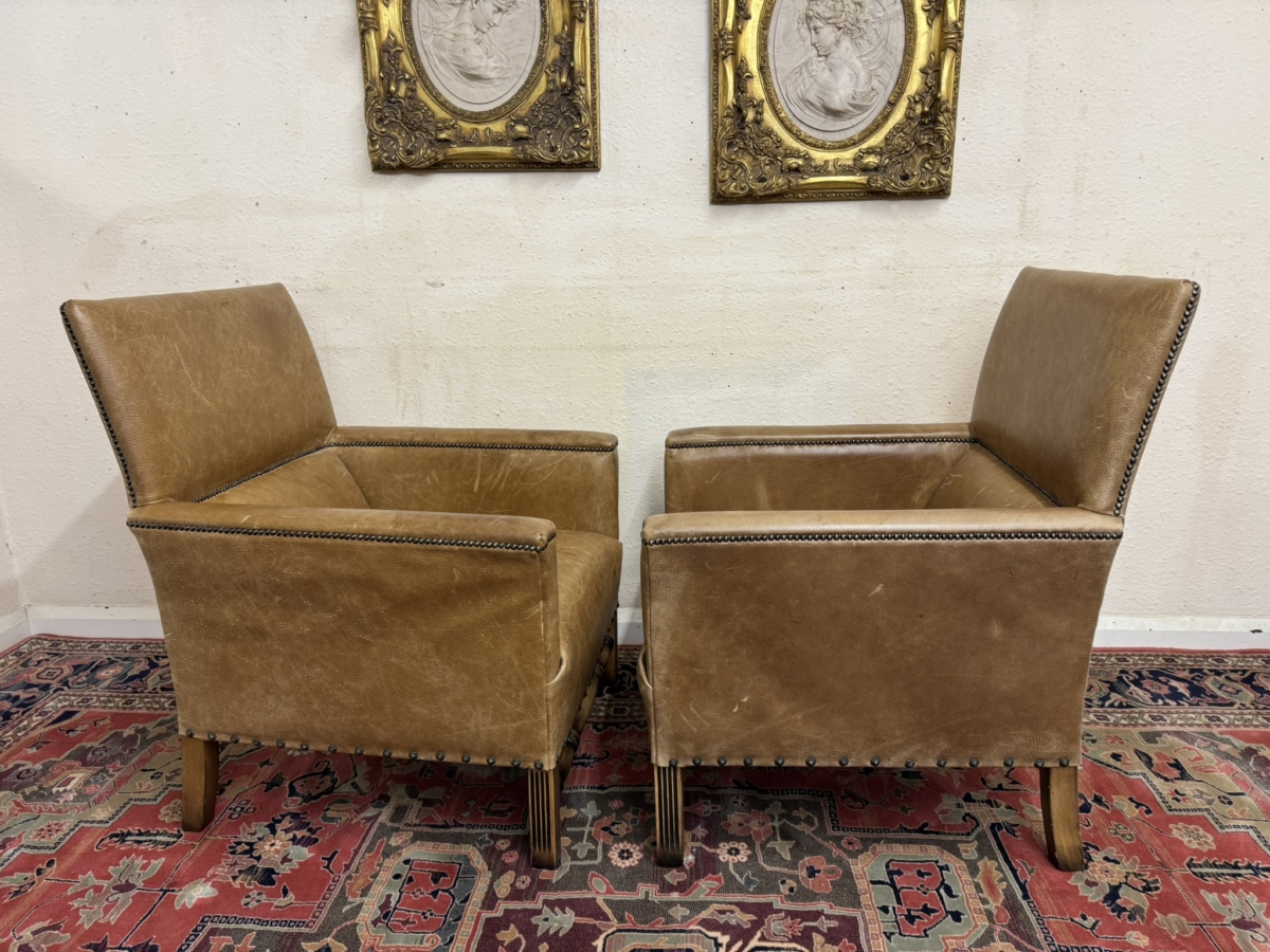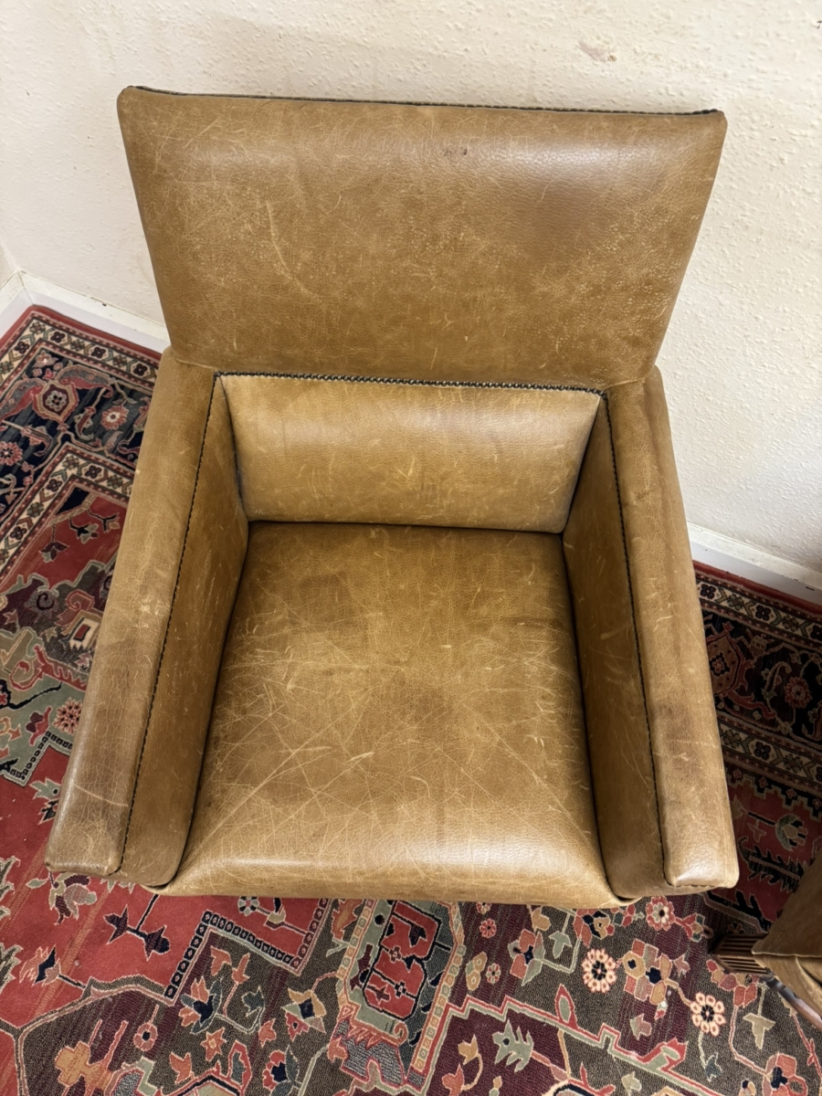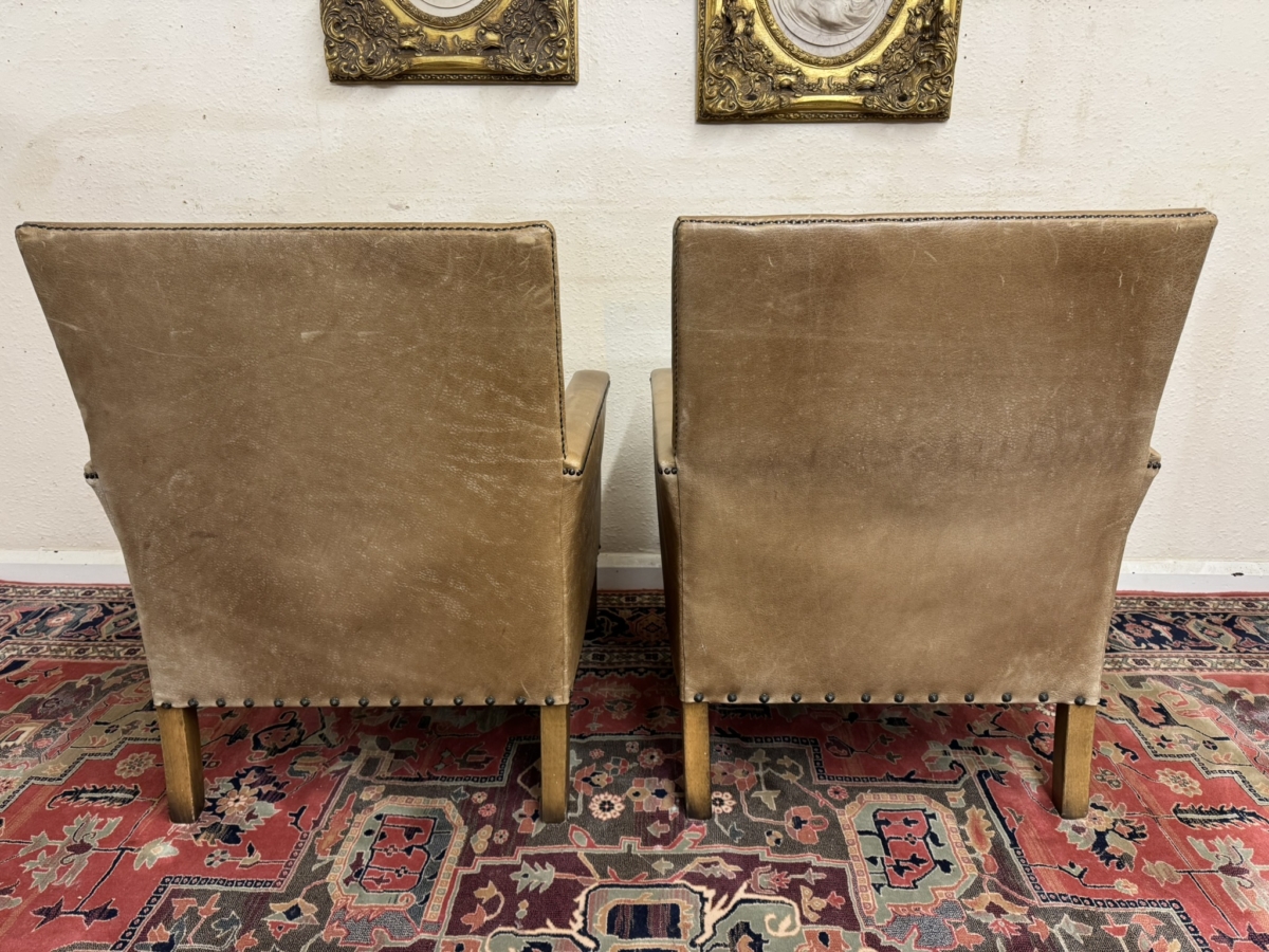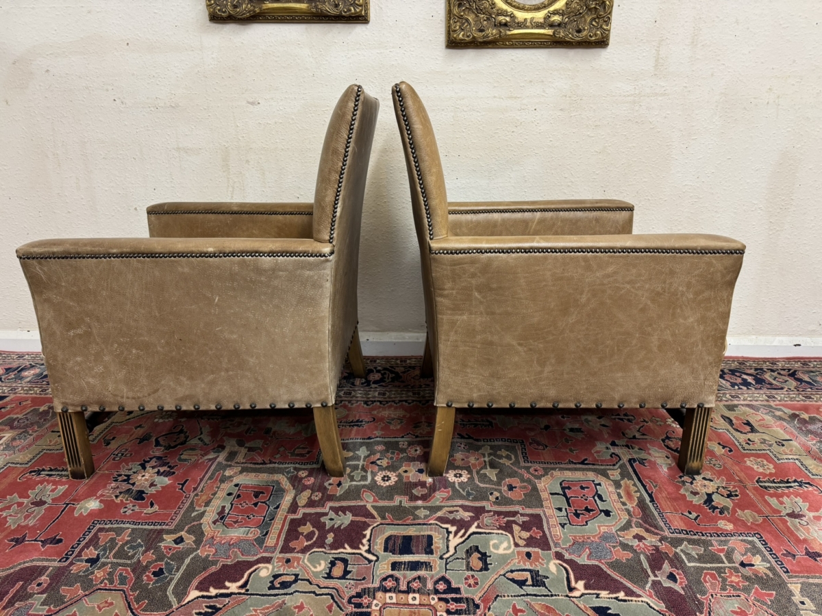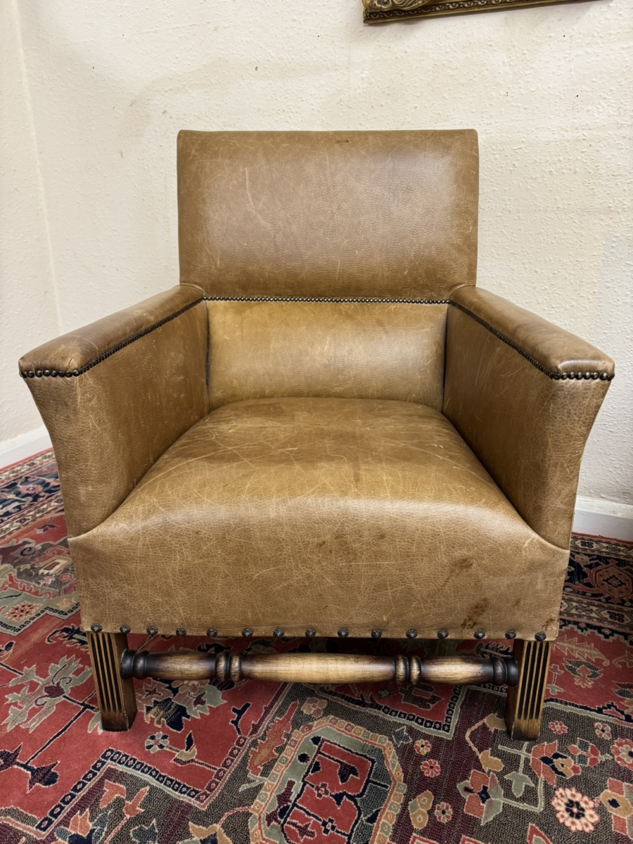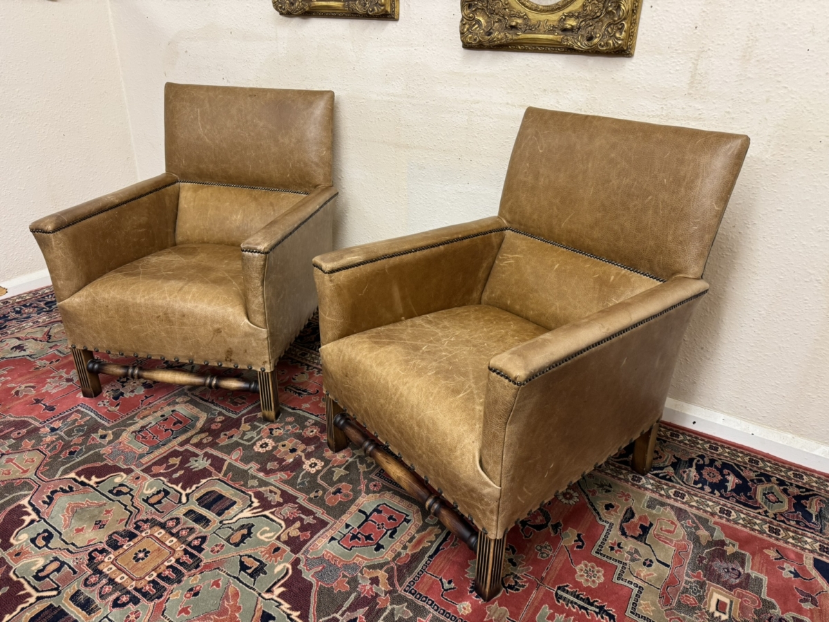 This stunning pair of chairs have tan leather upholstery with brass studded decoration. Four oak legs, the front two with carving with a front turned stretcher support.