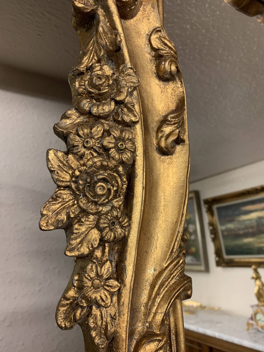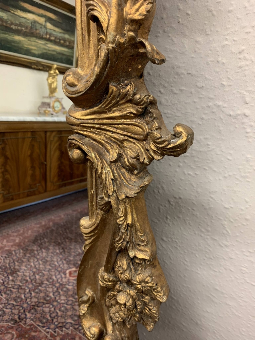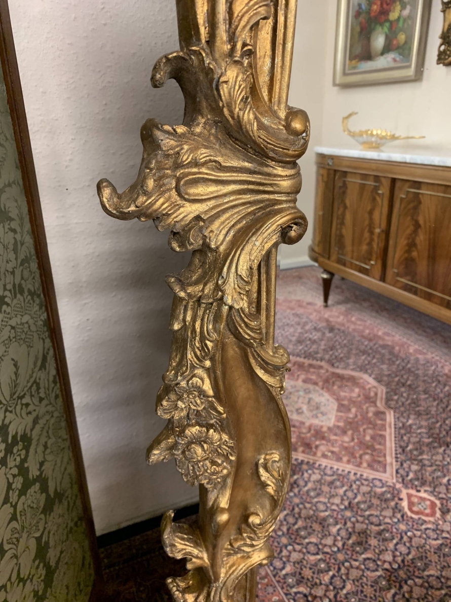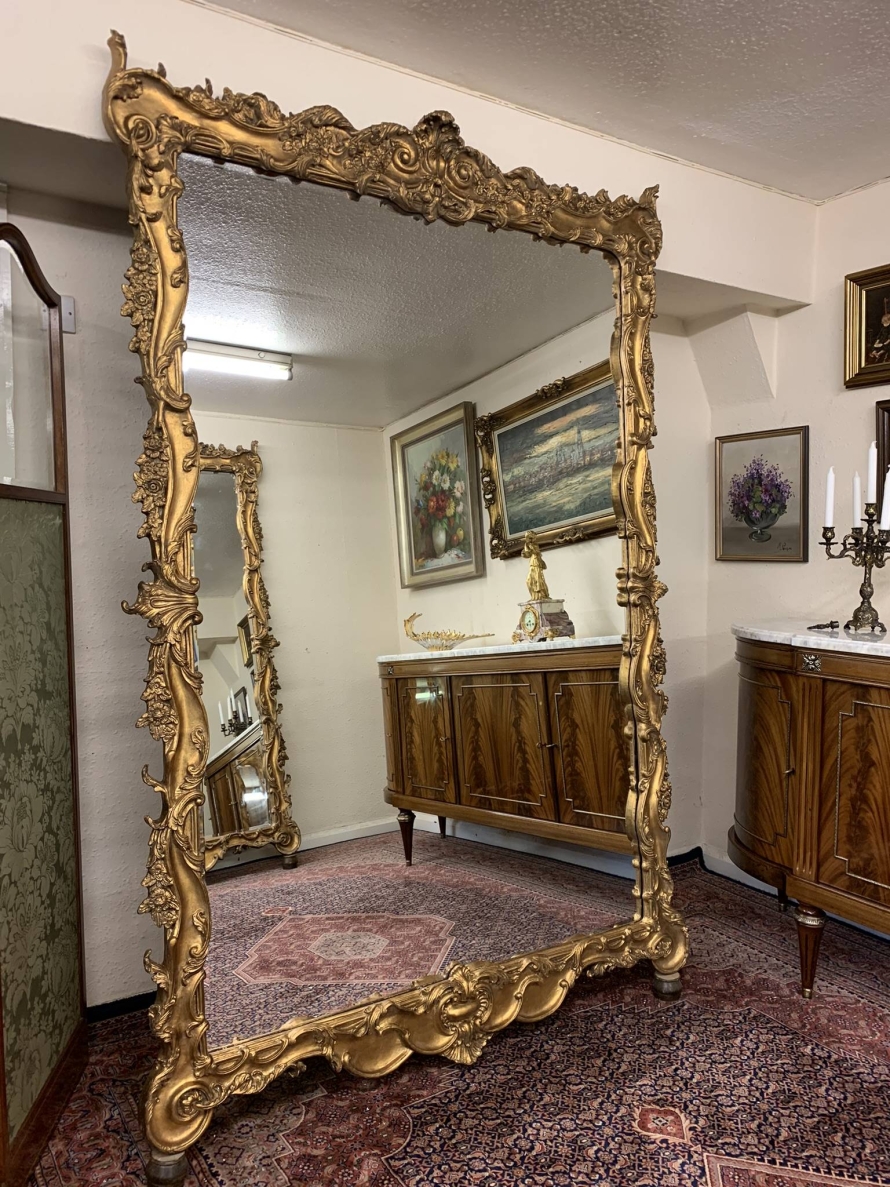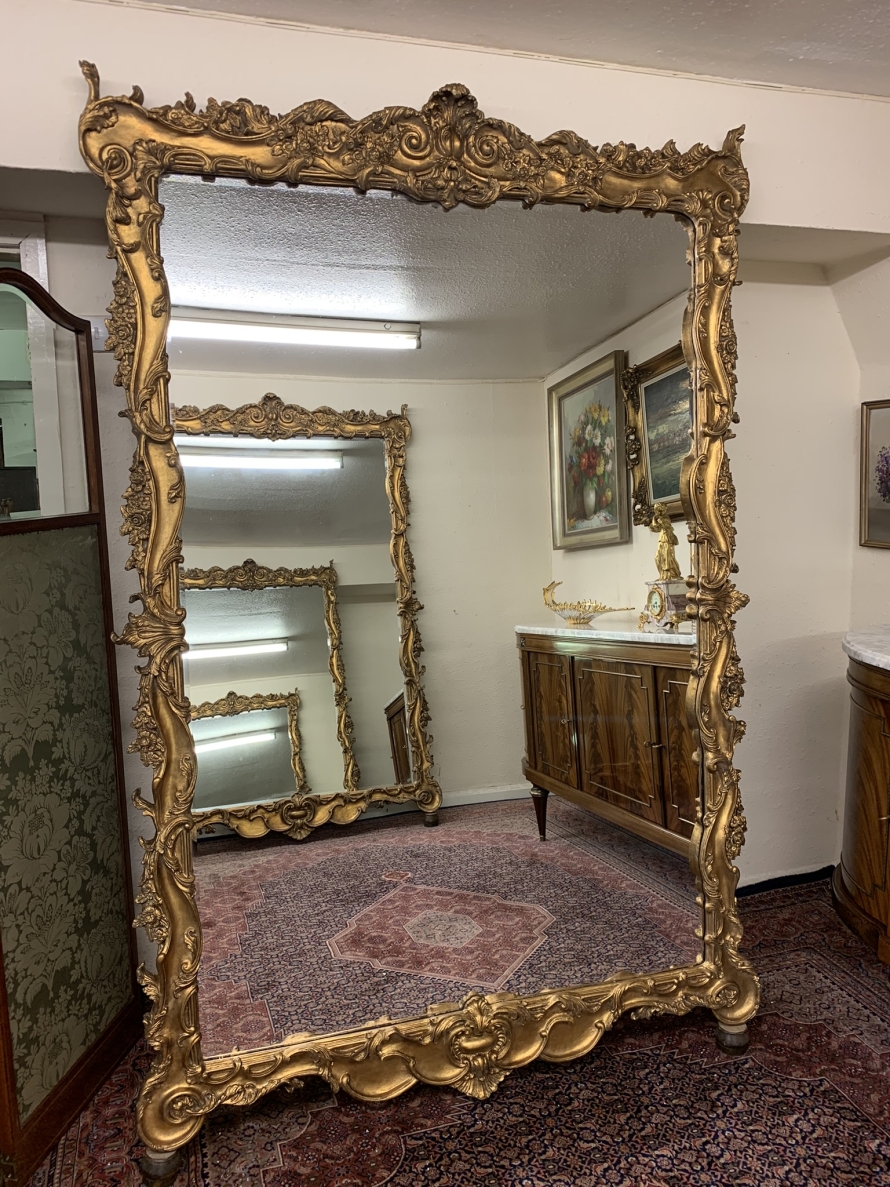 This opulent pair of very large gilt wood mirrors are in excellent condition. The heavily carved gilt wood frame houses a bevel edged mirror. Truly impressive and rare to find a pair. This outstanding pair of 20th century mirrors can be floor standing or wall mounted.