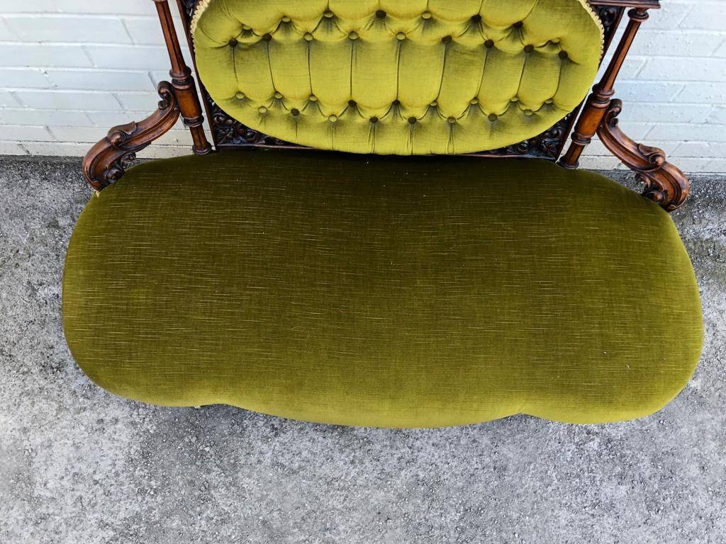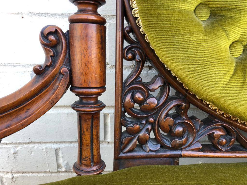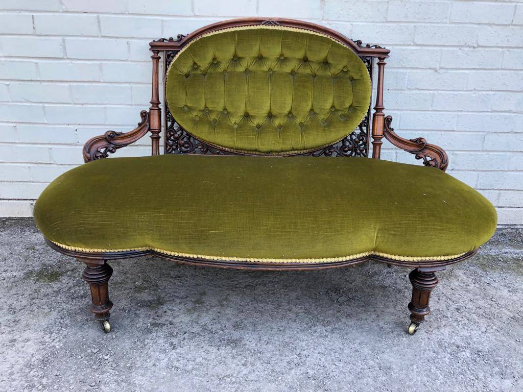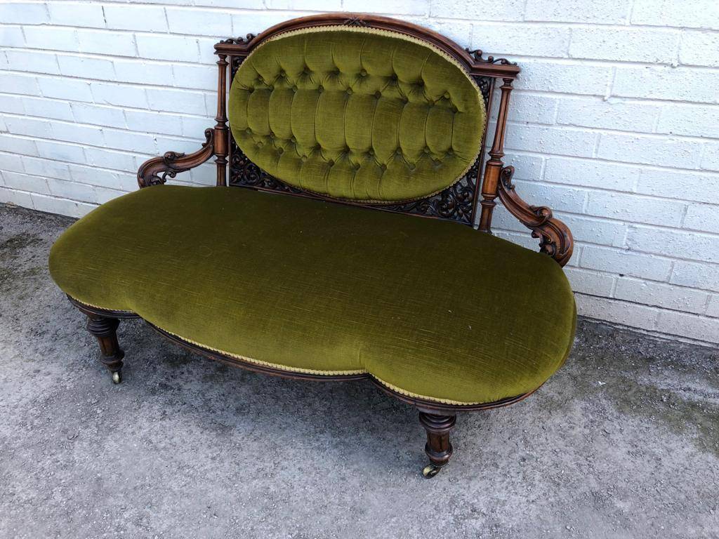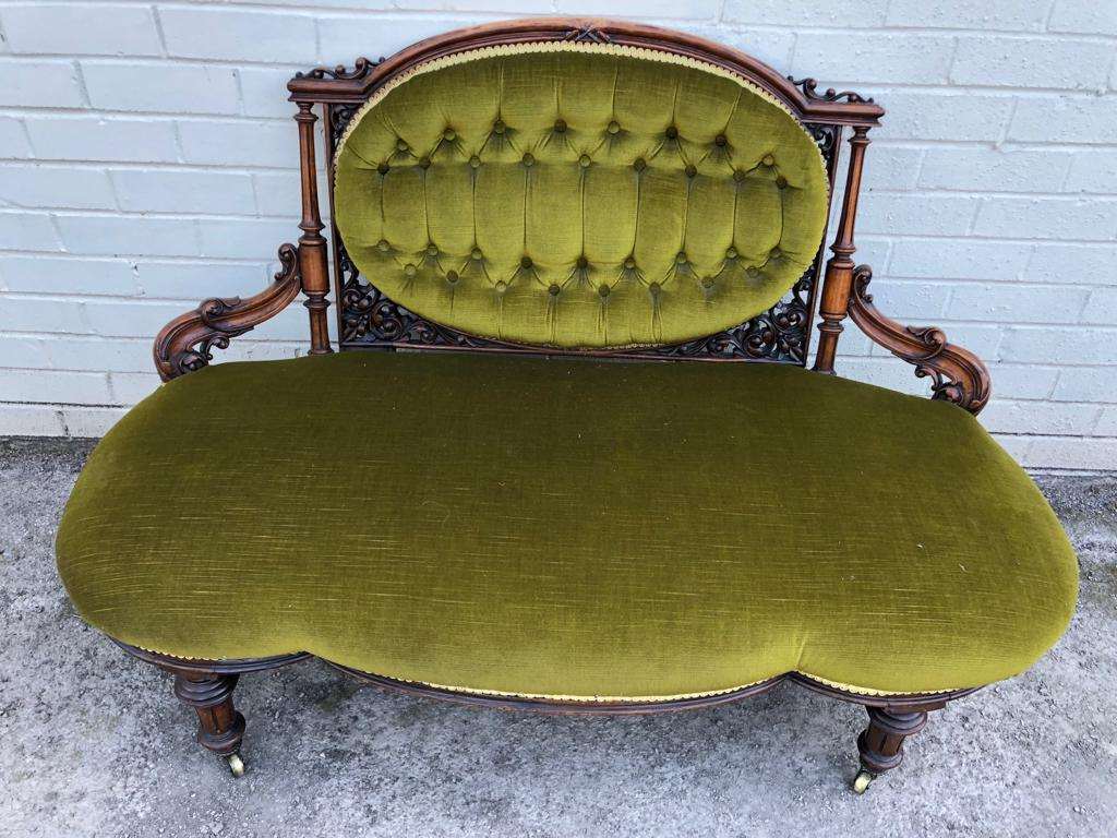 A superb example of English craftsmanship, this Victorian loveseat dates circa 1860. The back has a finely carved frame with a cameo upholstered cautioned deep buttoned back. To the sides are a pair of turned columns which connect the attractive shaped arms to the seat. The seat is shaped, upholstered and cushioned. This attractive loveseat sits on turned legs on original brass casters.
