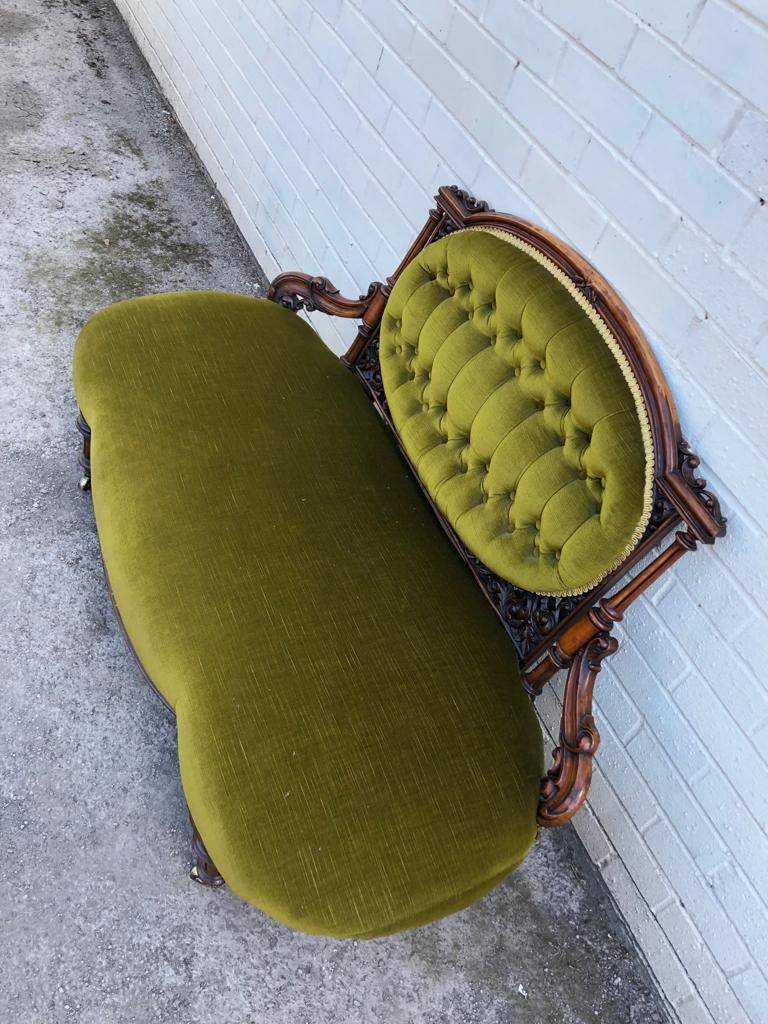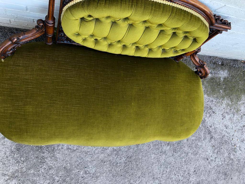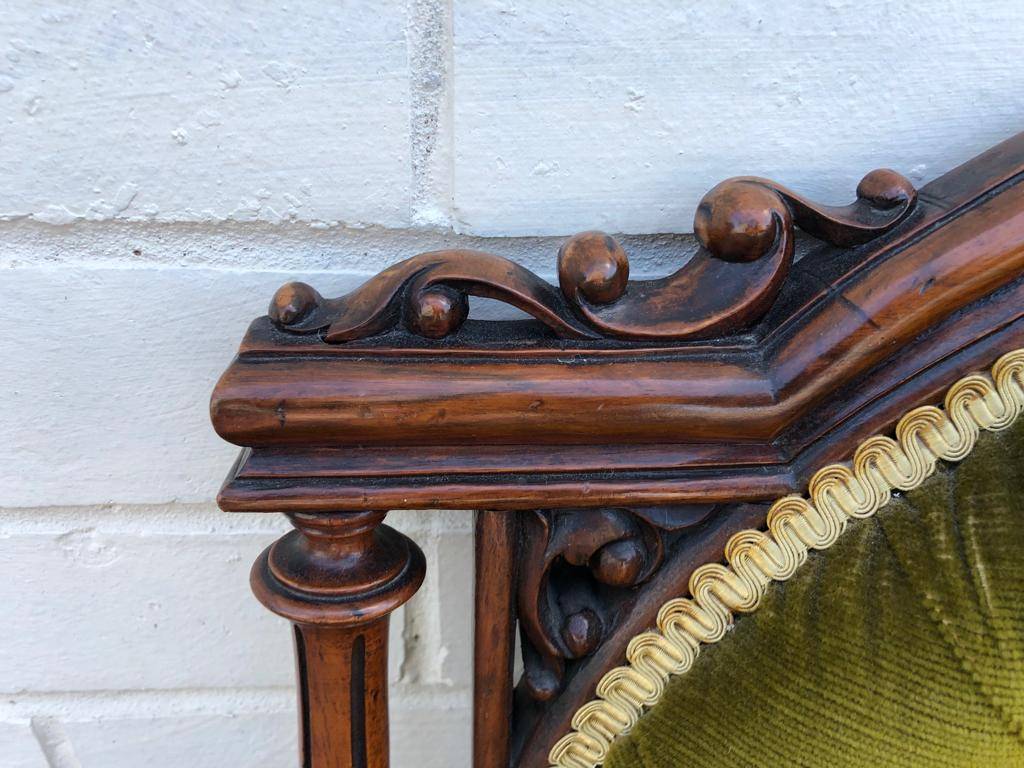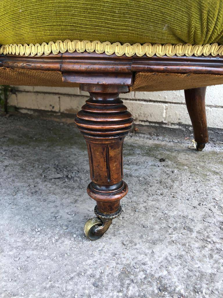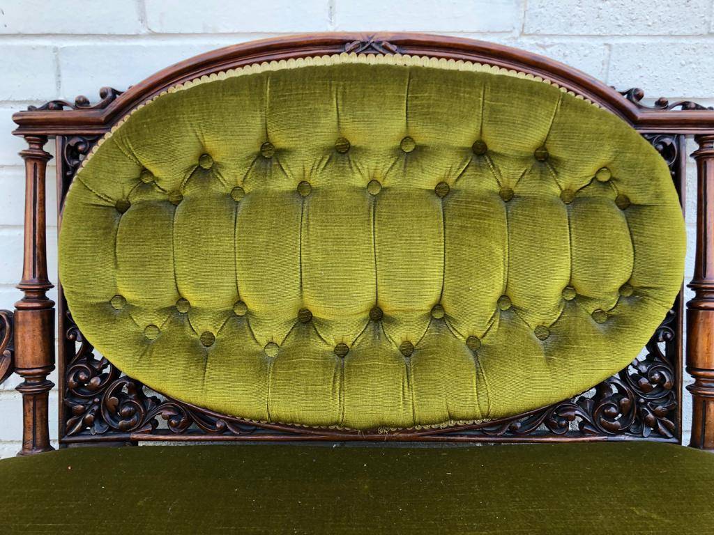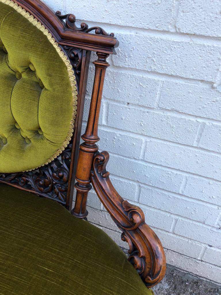 A superb example of English craftsmanship, this Victorian loveseat dates circa 1860. The back has a finely carved frame with a cameo upholstered cautioned deep buttoned back. To the sides are a pair of turned columns which connect the attractive shaped arms to the seat. The seat is shaped, upholstered and cushioned. This attractive loveseat sits on turned legs on original brass casters.