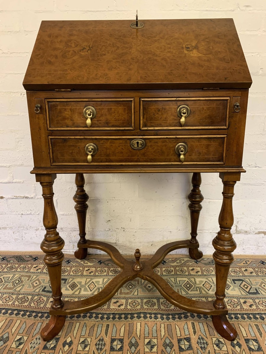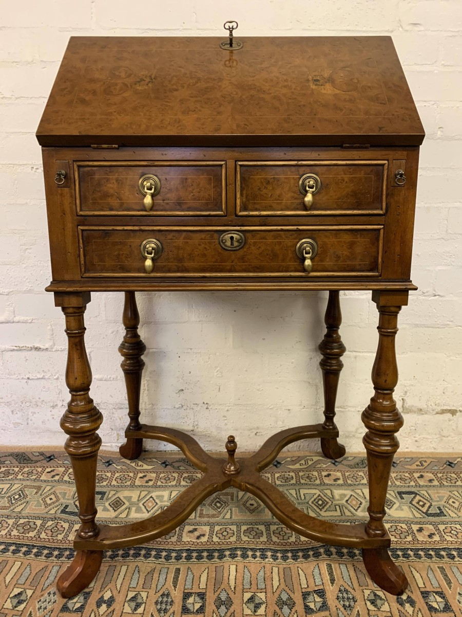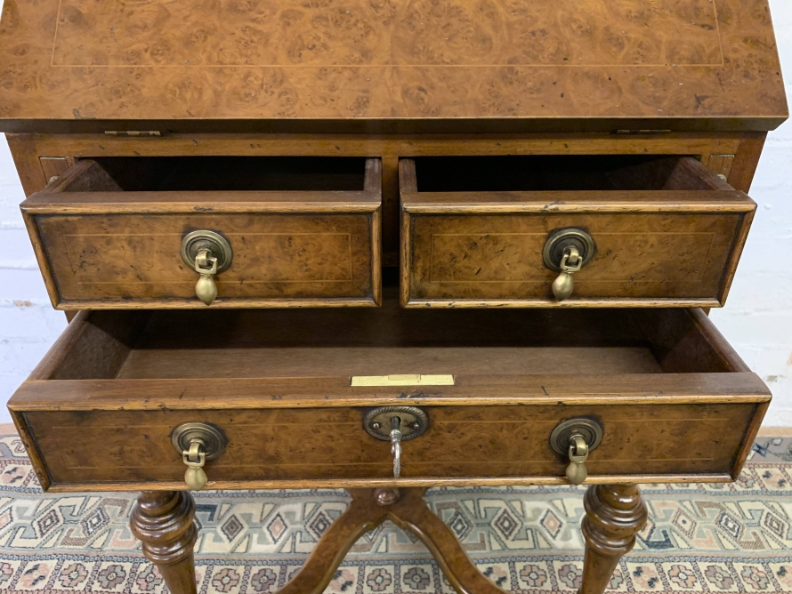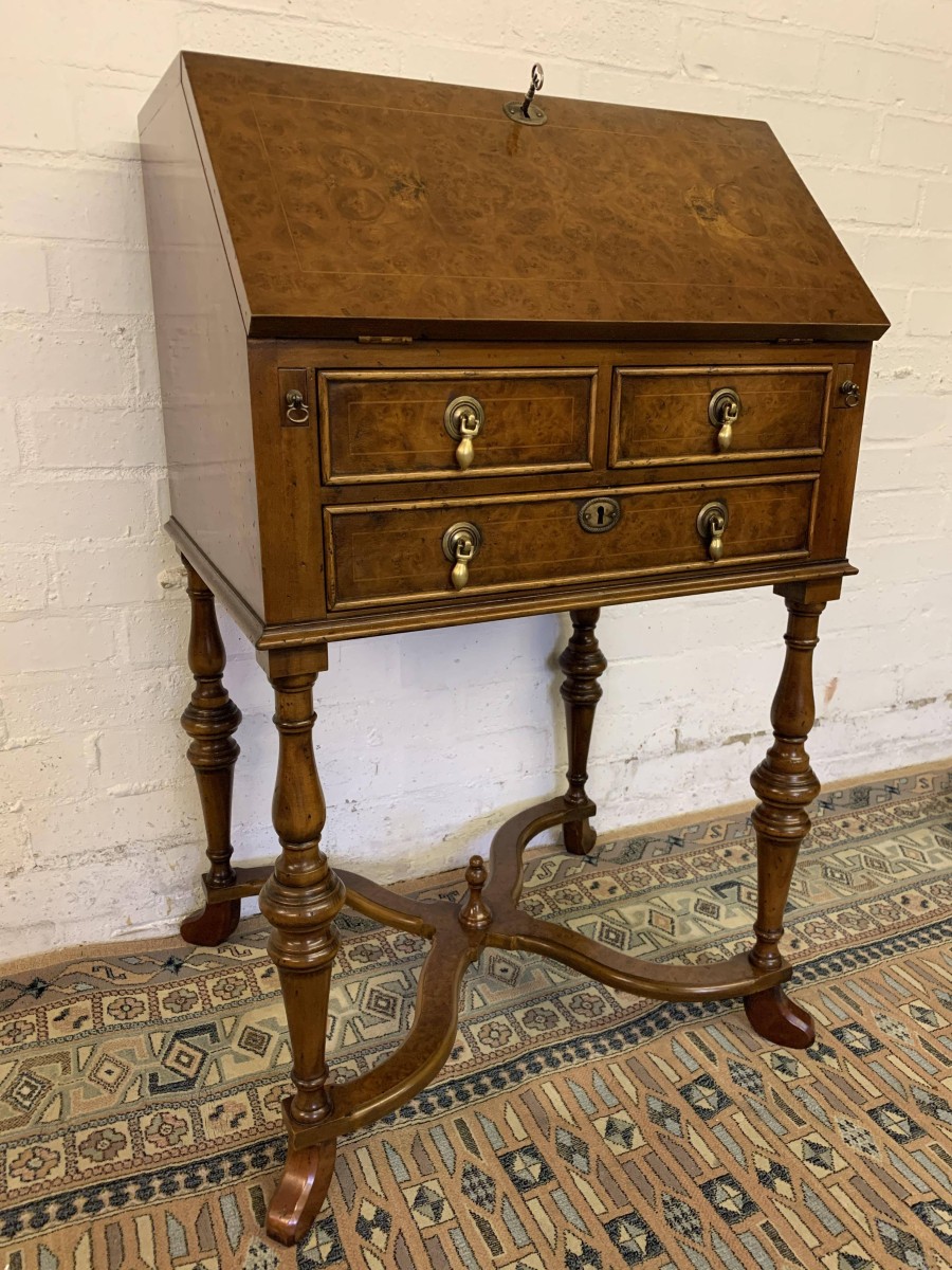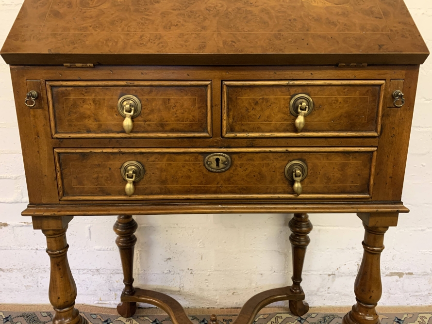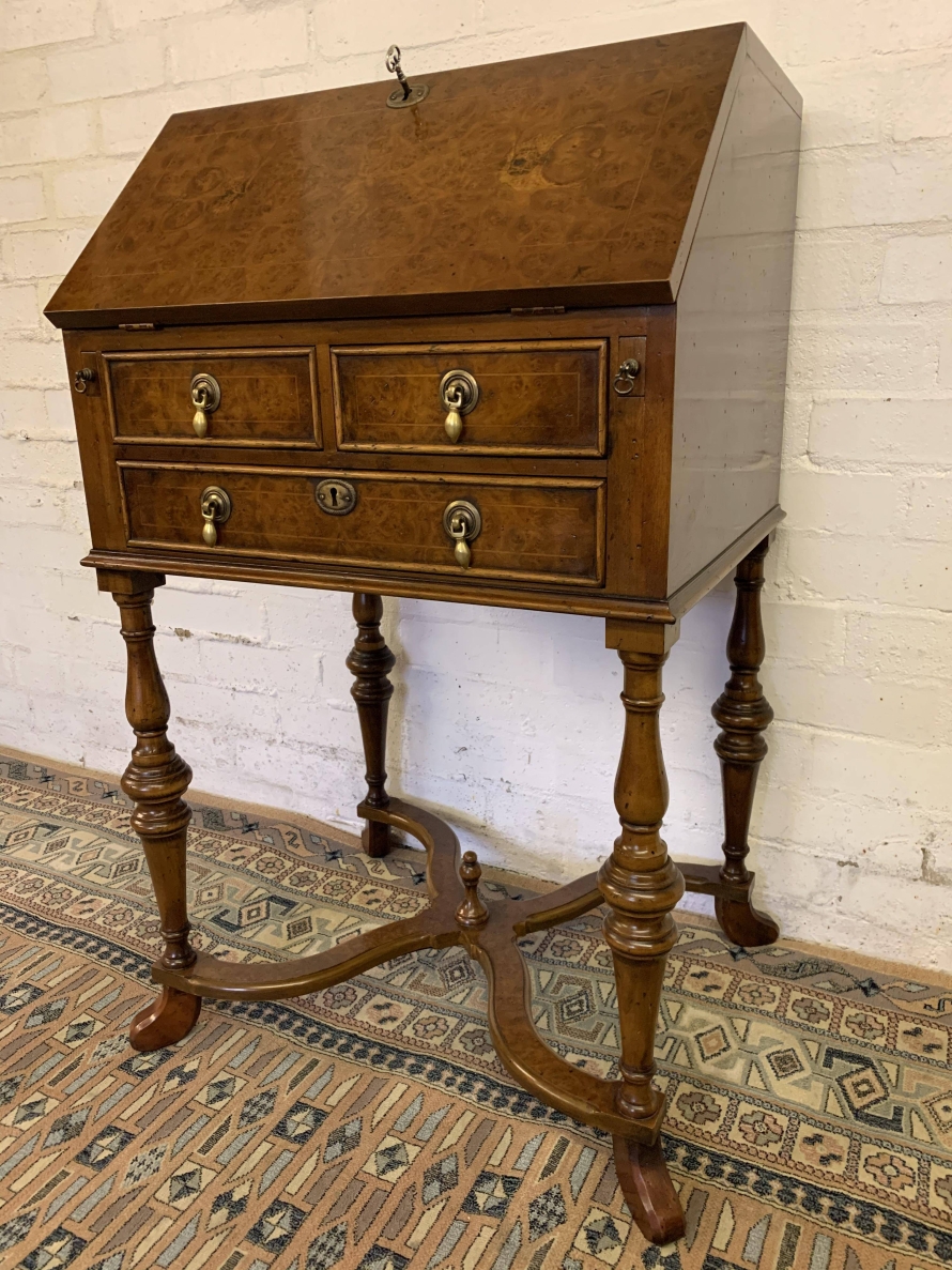 The inlaid top sits above a lockable inlaid fall. The fall drops down and sits on two retractable rests. The fall opens to reveal a fabulous interior consisting of numerous drawers and pigeonholes. Below are two small drawers, each drawer having brass teardrop handle. Below is a lockable longer drawers, this drawer having a pair of teardrop brass handles. The bureau stands on four elegant turned legs supported by shaped stretches. Please note the patina of the walnut is striking. The bureau is in excellent condition.