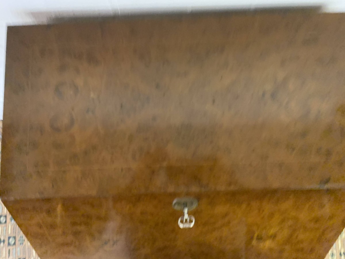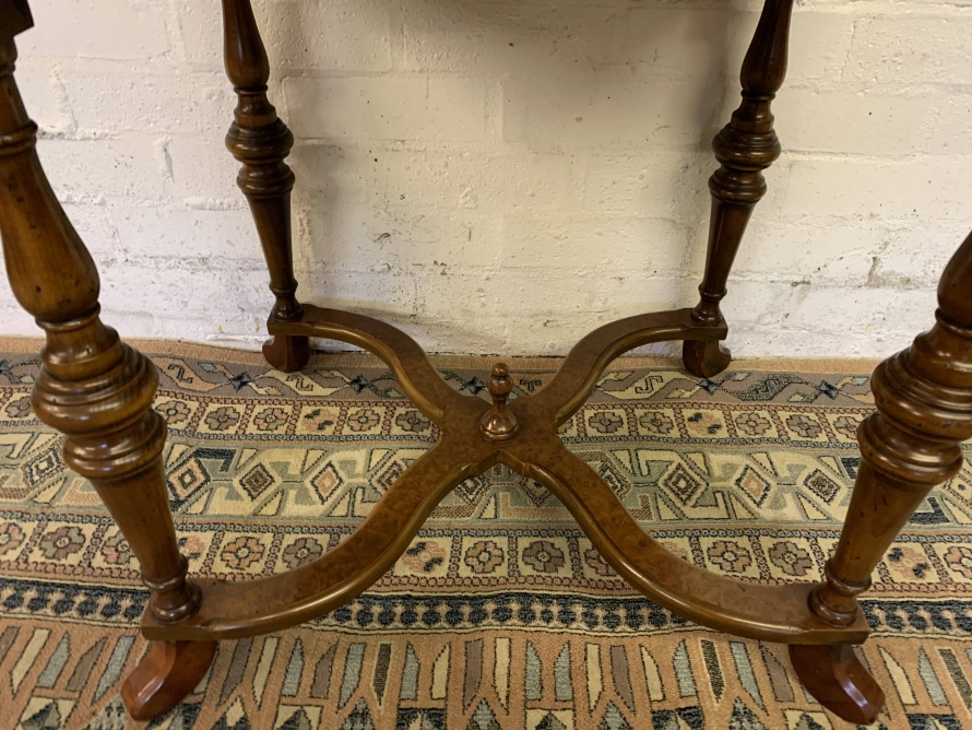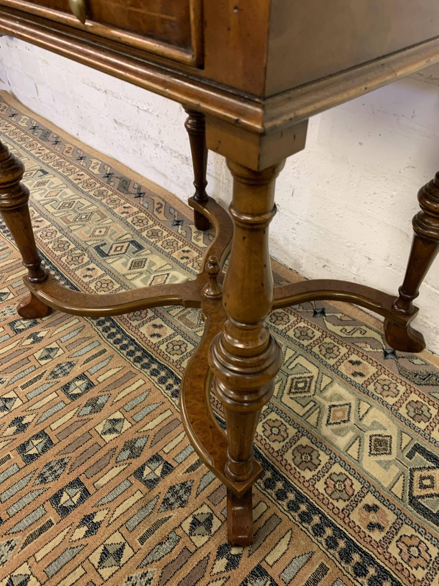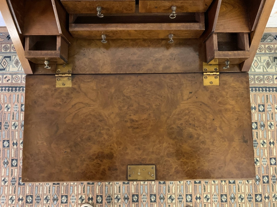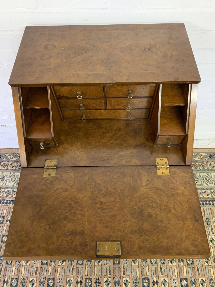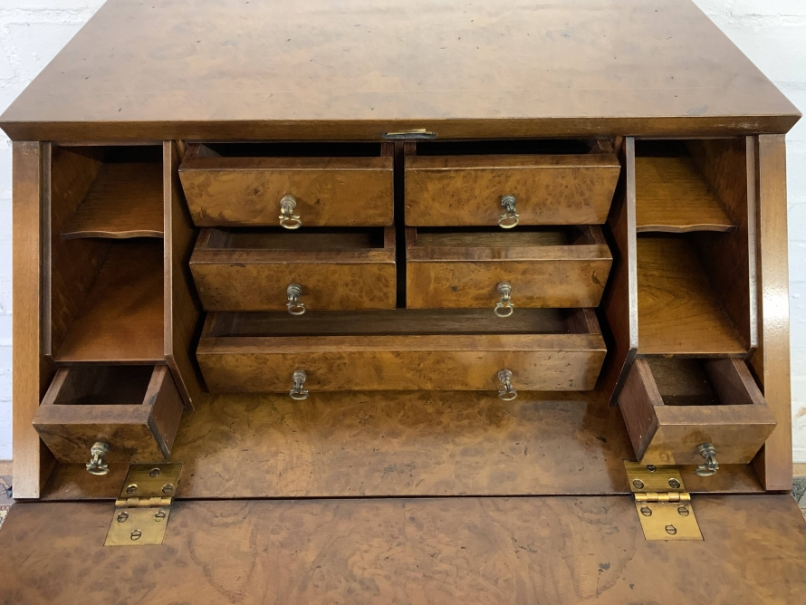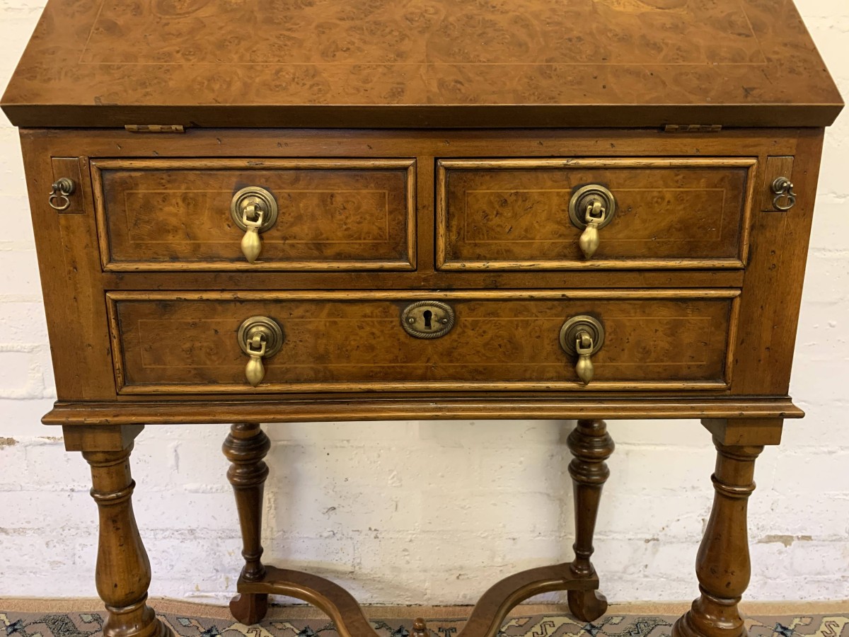 The inlaid top sits above a lockable inlaid fall. The fall drops down and sits on two retractable rests. The fall opens to reveal a fabulous interior consisting of numerous drawers and pigeonholes. Below are two small drawers, each drawer having brass teardrop handle. Below is a lockable longer drawers, this drawer having a pair of teardrop brass handles. The bureau stands on four elegant turned legs supported by shaped stretches. Please note the patina of the walnut is striking. The bureau is in excellent condition.