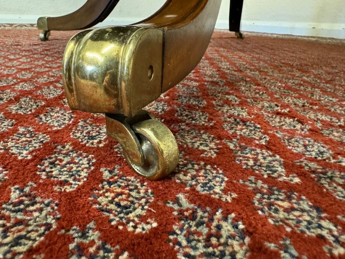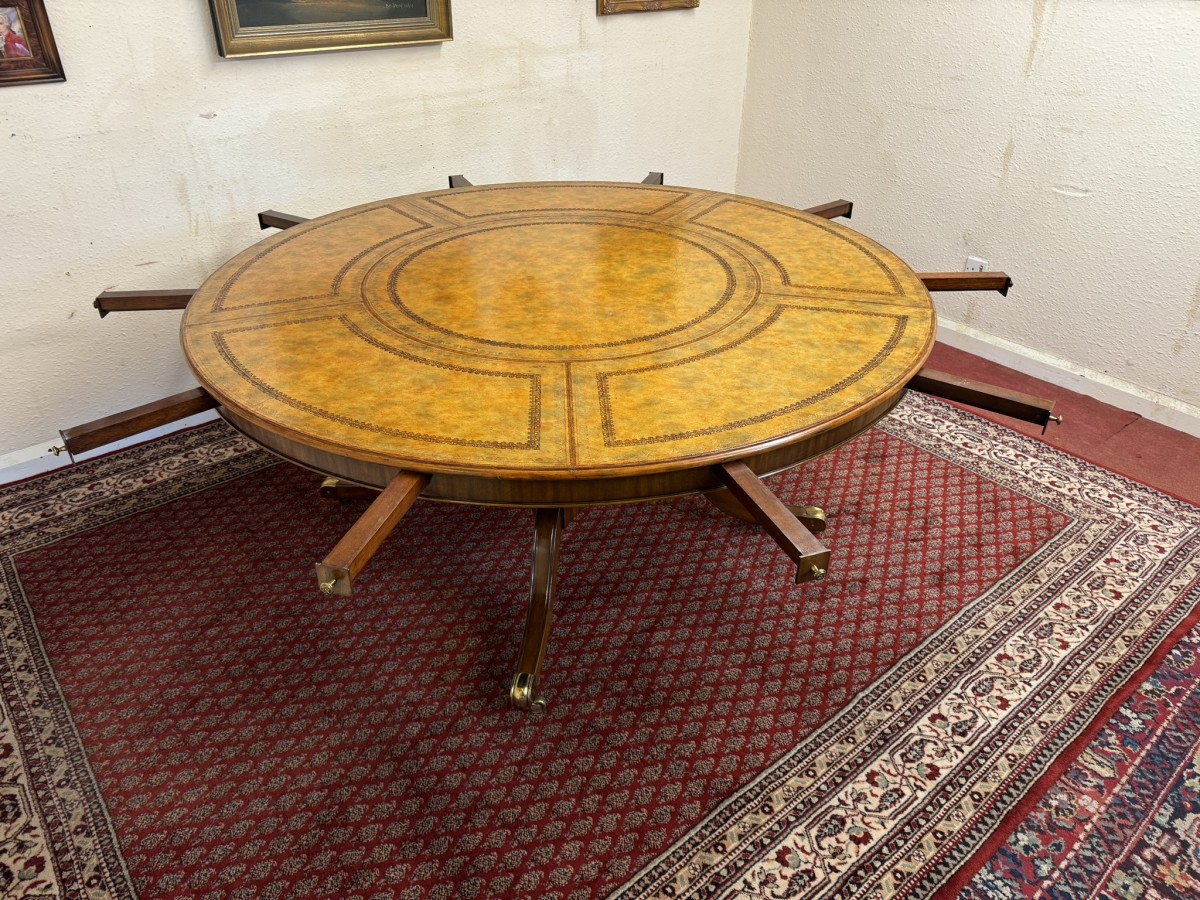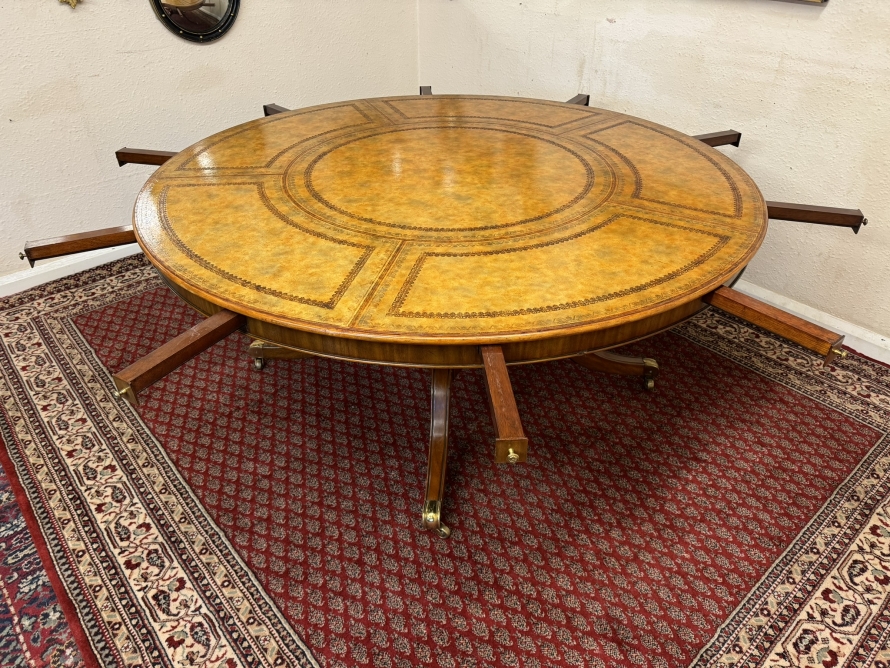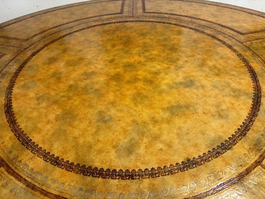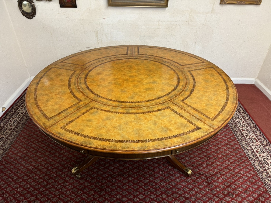 This fine table has a fabulous antique gold tooled leather top. A special feature of this table is the retractable armrests each with a ornate brass button handle. The pedestal base has four turned column supports with four out swept brass capped legs which sit on brass casters. The quality of this table is immense.