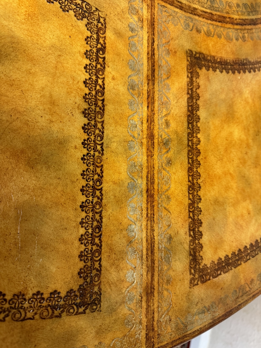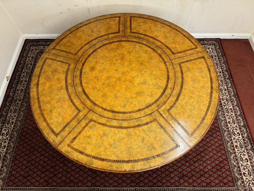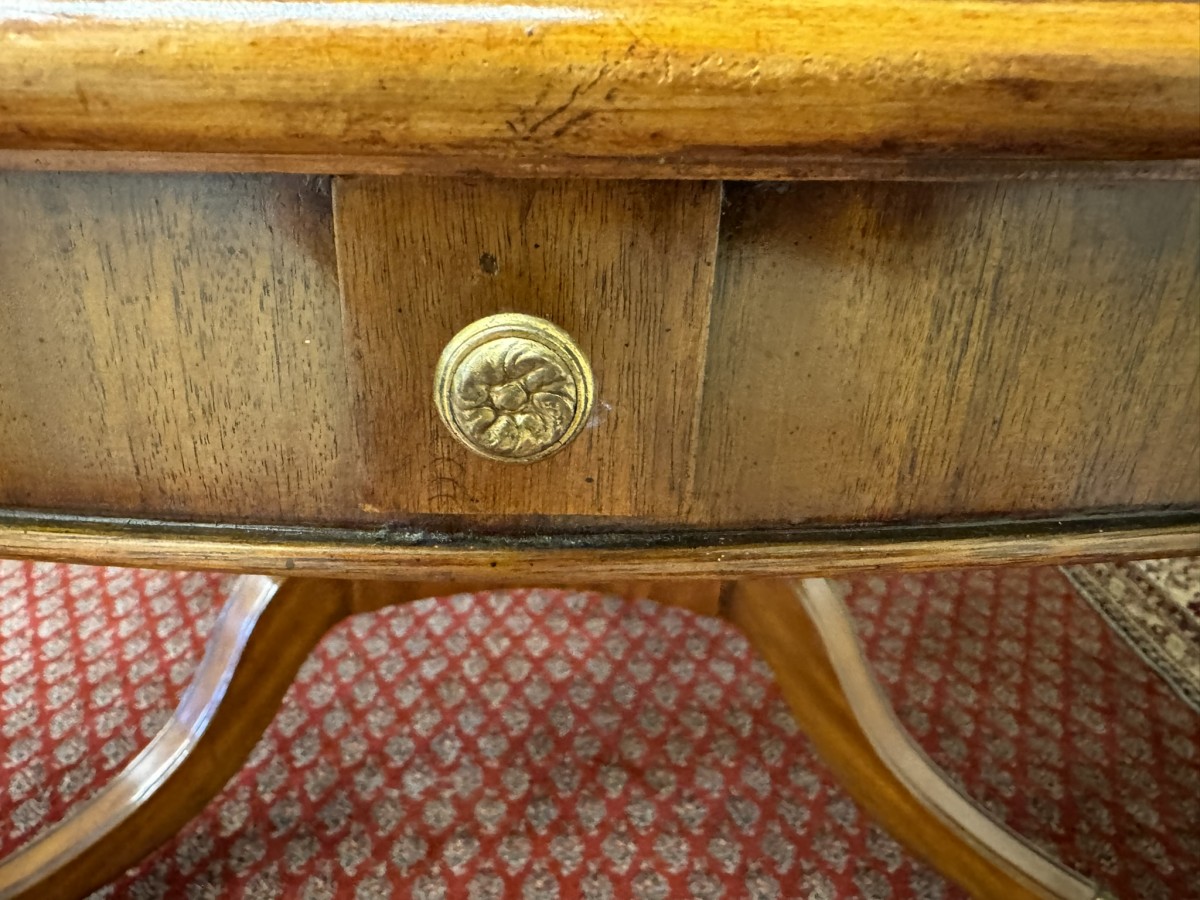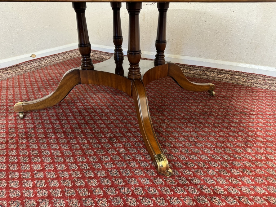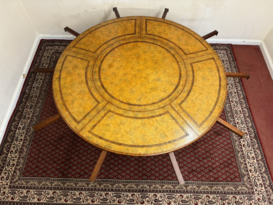 This fine table has a fabulous antique gold tooled leather top. A special feature of this table is the retractable armrests each with a ornate brass button handle. The pedestal base has four turned column supports with four out swept brass capped legs which sit on brass casters. The quality of this table is immense.